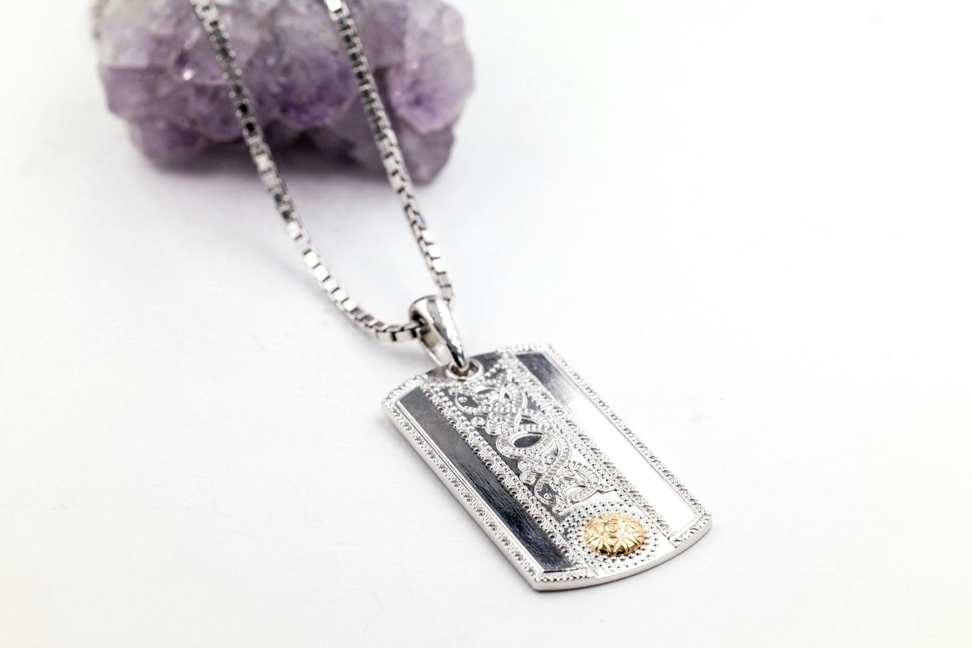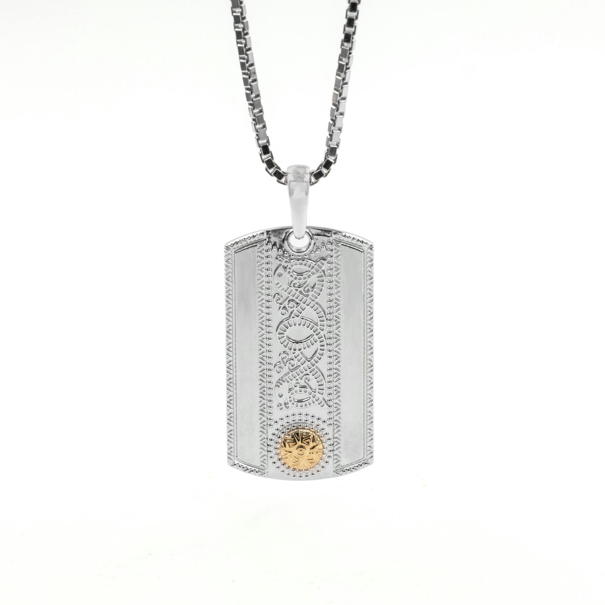 This spectacularly detailed dog tag showcases shield designs that echo the battle armor of ancient Celtic Warriors. Weighty sterling silver has been polished to a high shine. It's cool tones are a beautiful contrast to the 18K gold "shield" boss that sits at the centre of the design - a symbol of protection inspired by treasures of ancient Ireland.