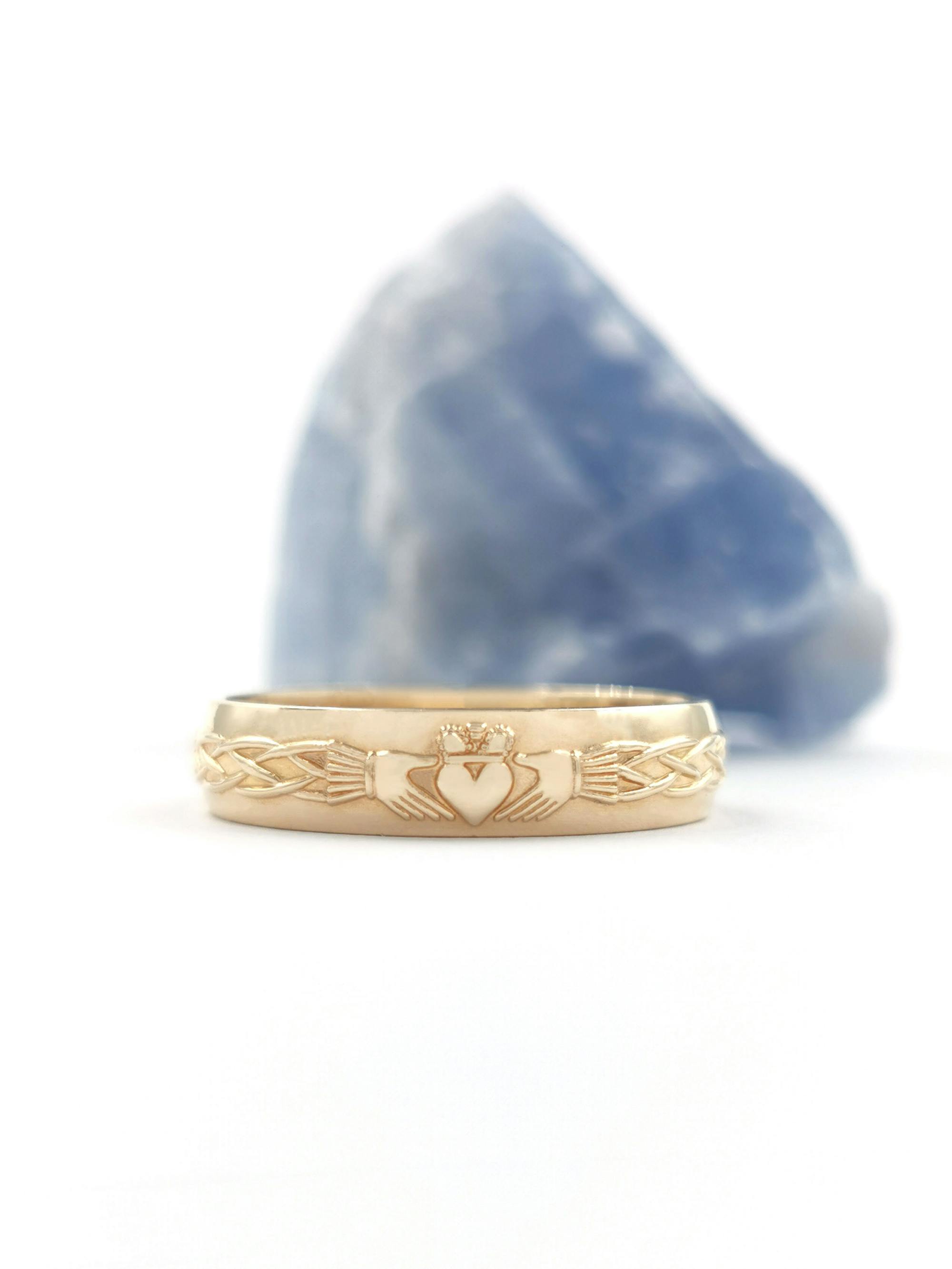 The heart crown and hands of the Claddagh represent, love, loyalty, and friendship, a beautiful symbol cherished in Ireland and exchanged between sweethearts for over 400 years. The Celtic knot band enhances this meaning representing strength and eternity, making this ring a meaningful choice for those looking to mark milestones.