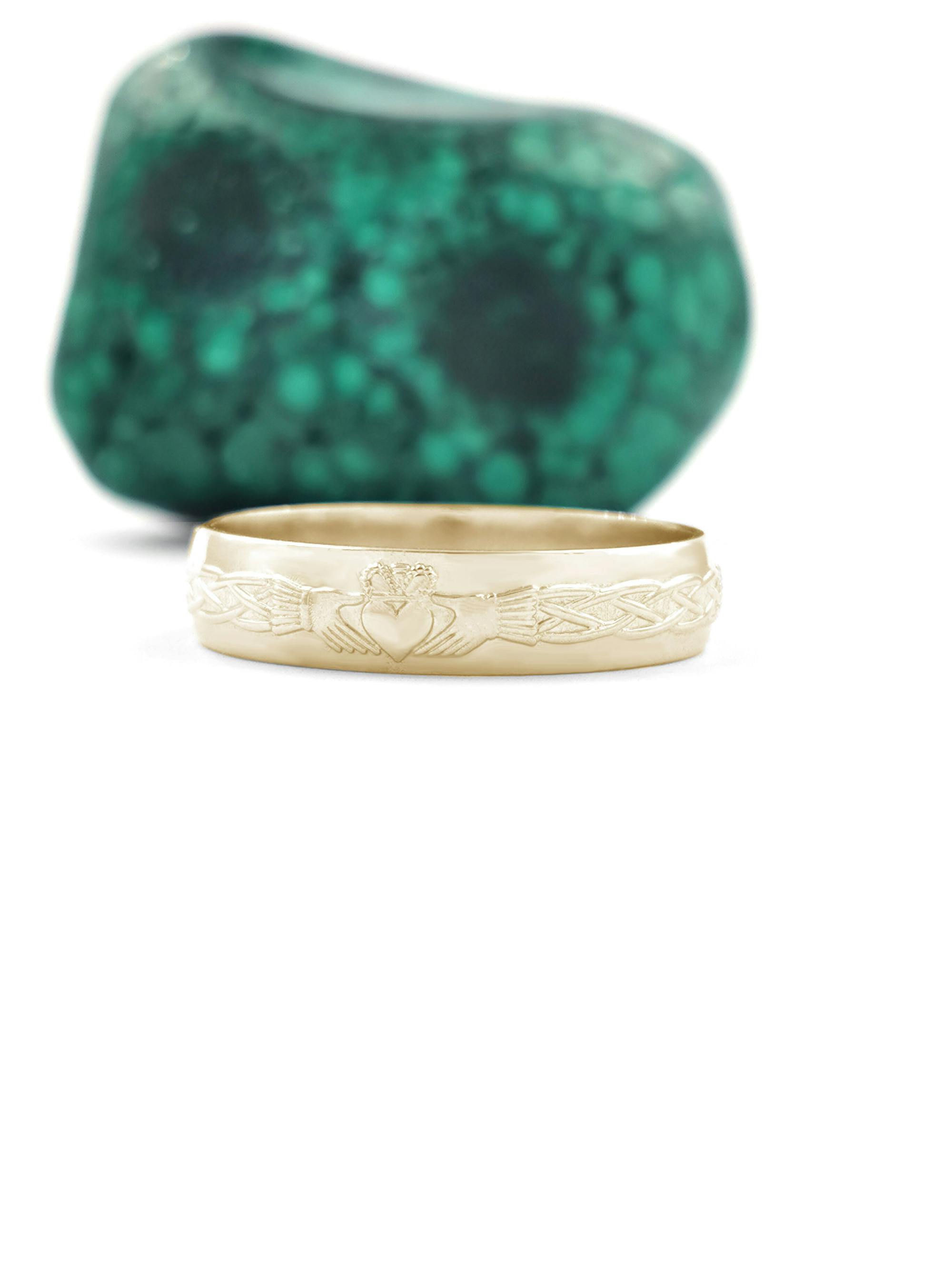 This stunning set pairs the iconic hands, heart, and crown of the Irish Claddagh design with an intricate Celtic knot band. The beautiful embossed detail runs the around the band - all crafted in your choice of precious metal.