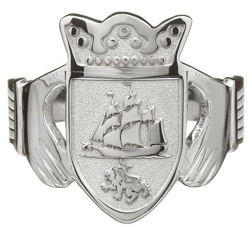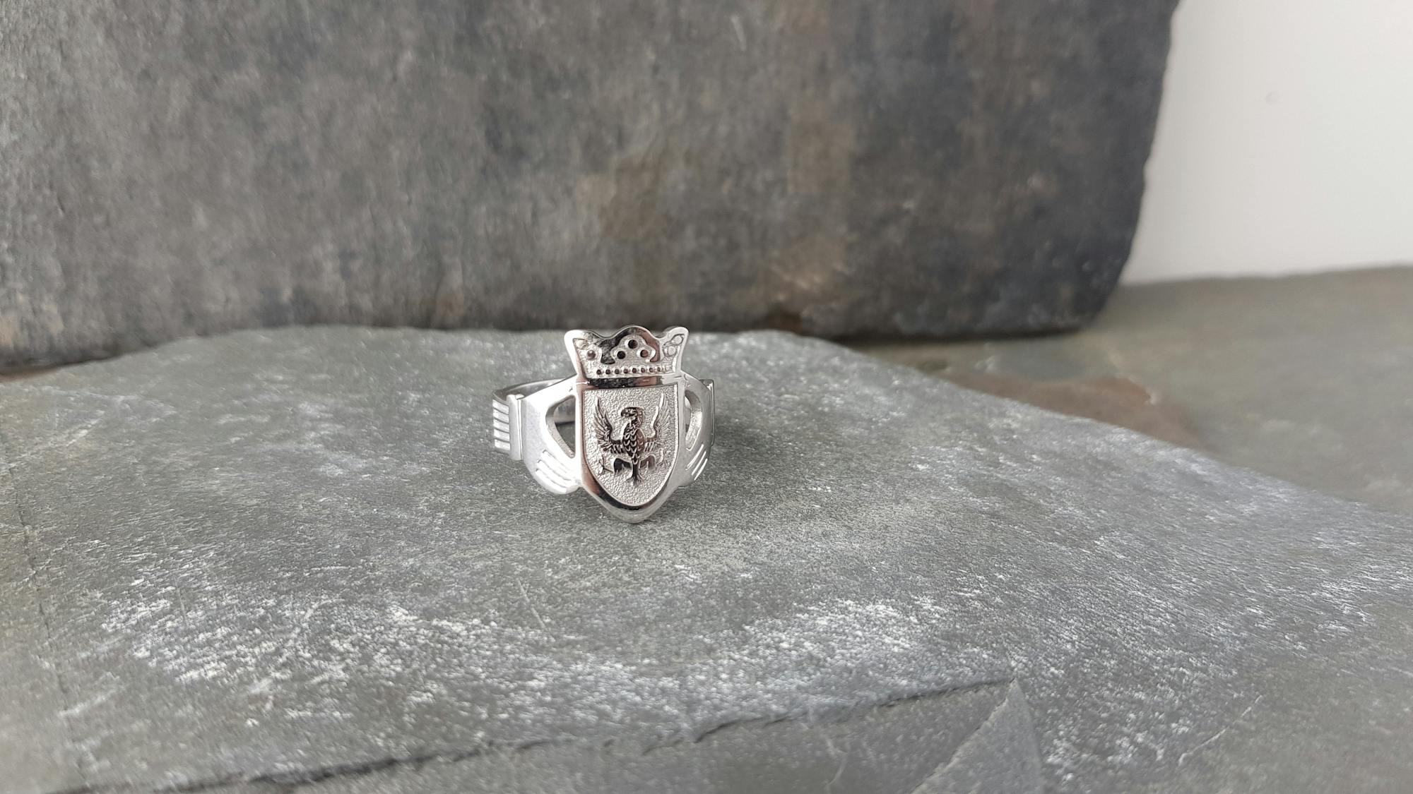 A wonderful combination of Ireland's favourite symbol, the Claddagh ring, with your own family's Coat of Arms. This striking ring features your family coat of arms carved into the centre section by our gifted goldsmith. If in doubt, contact us to confirm the arms for your selected surname.