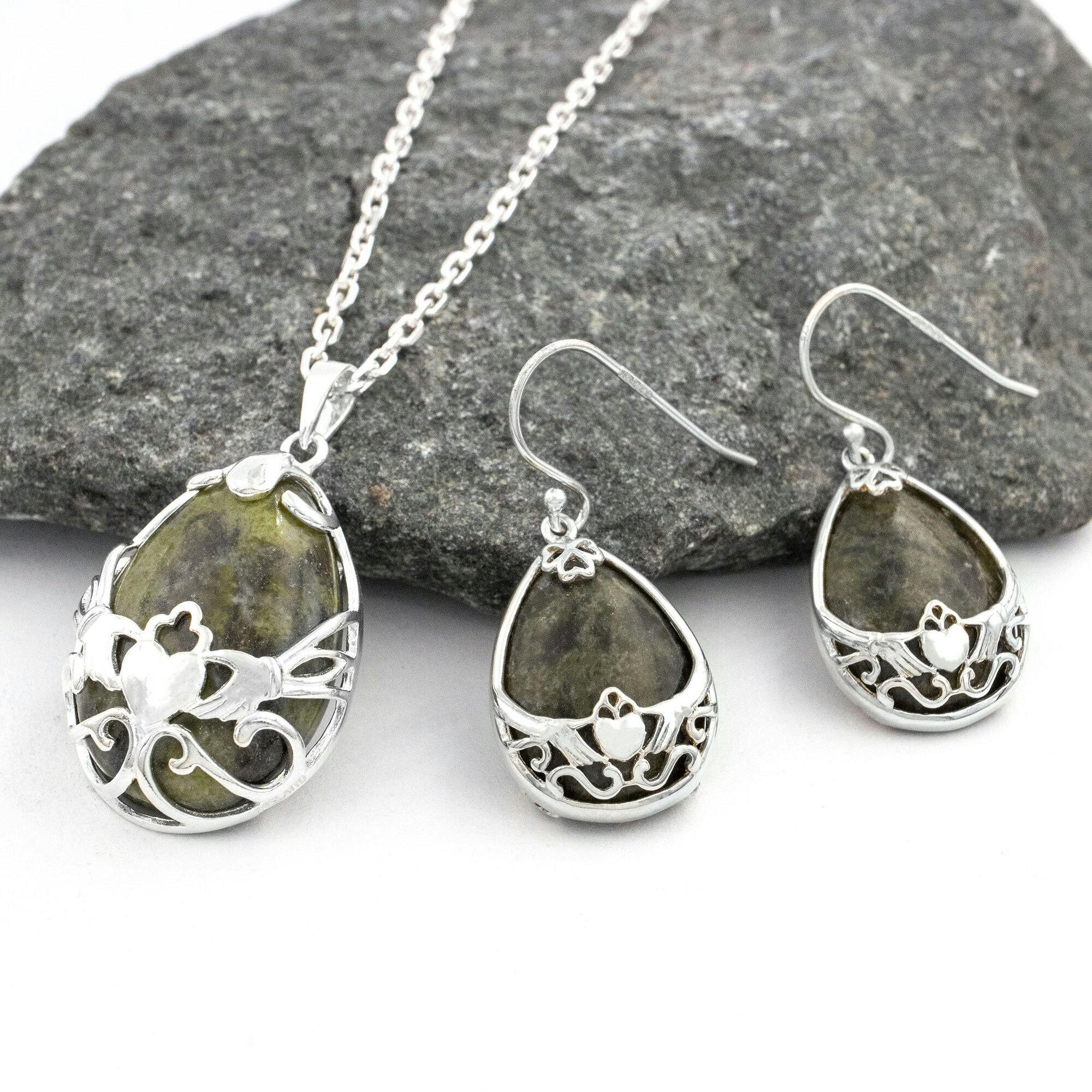 The beautiful teardrop shaped Connemara marble cabochons are the stars of this set, held within a botanic inspired Claddagh interlace design wrought in fine sterling silver.