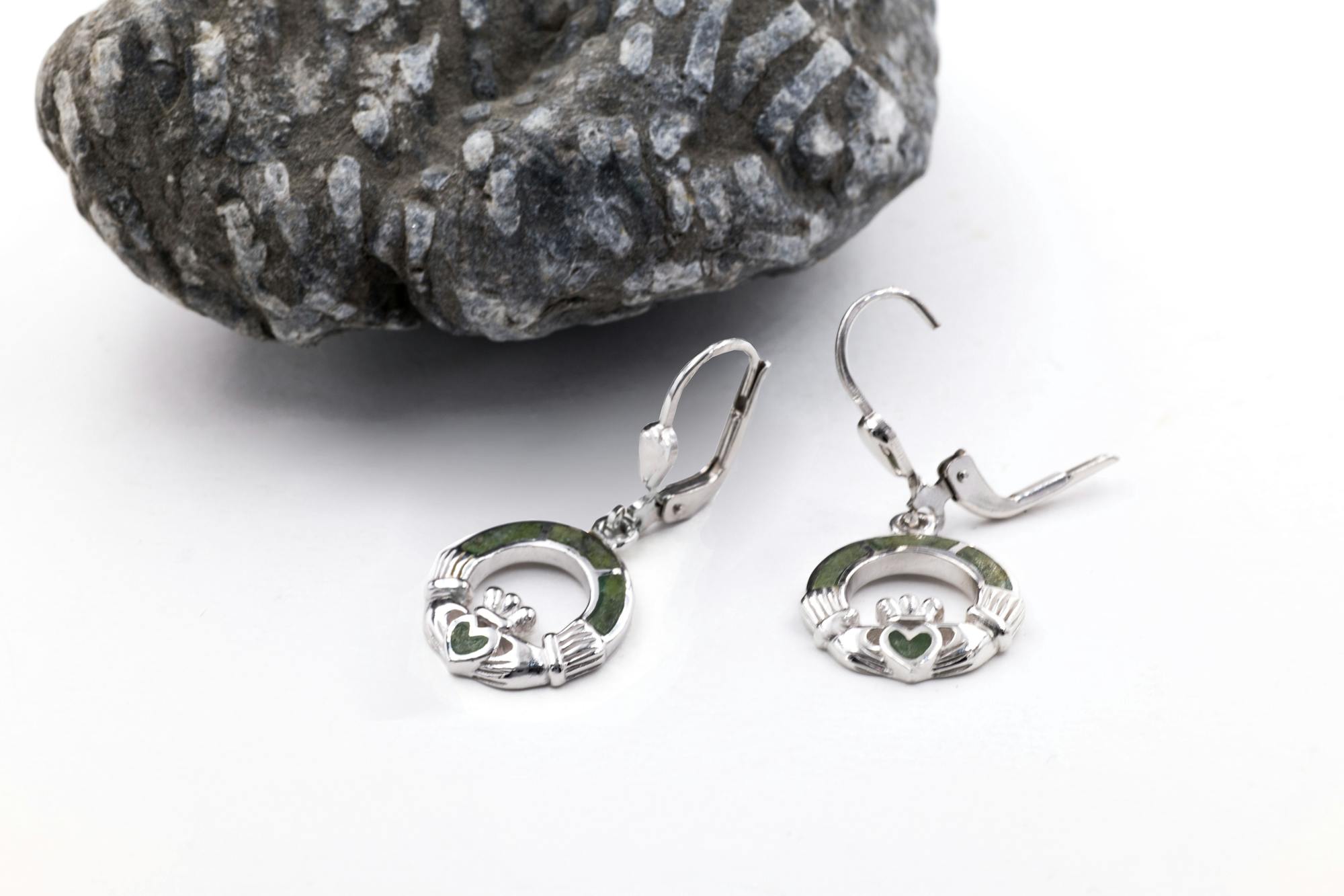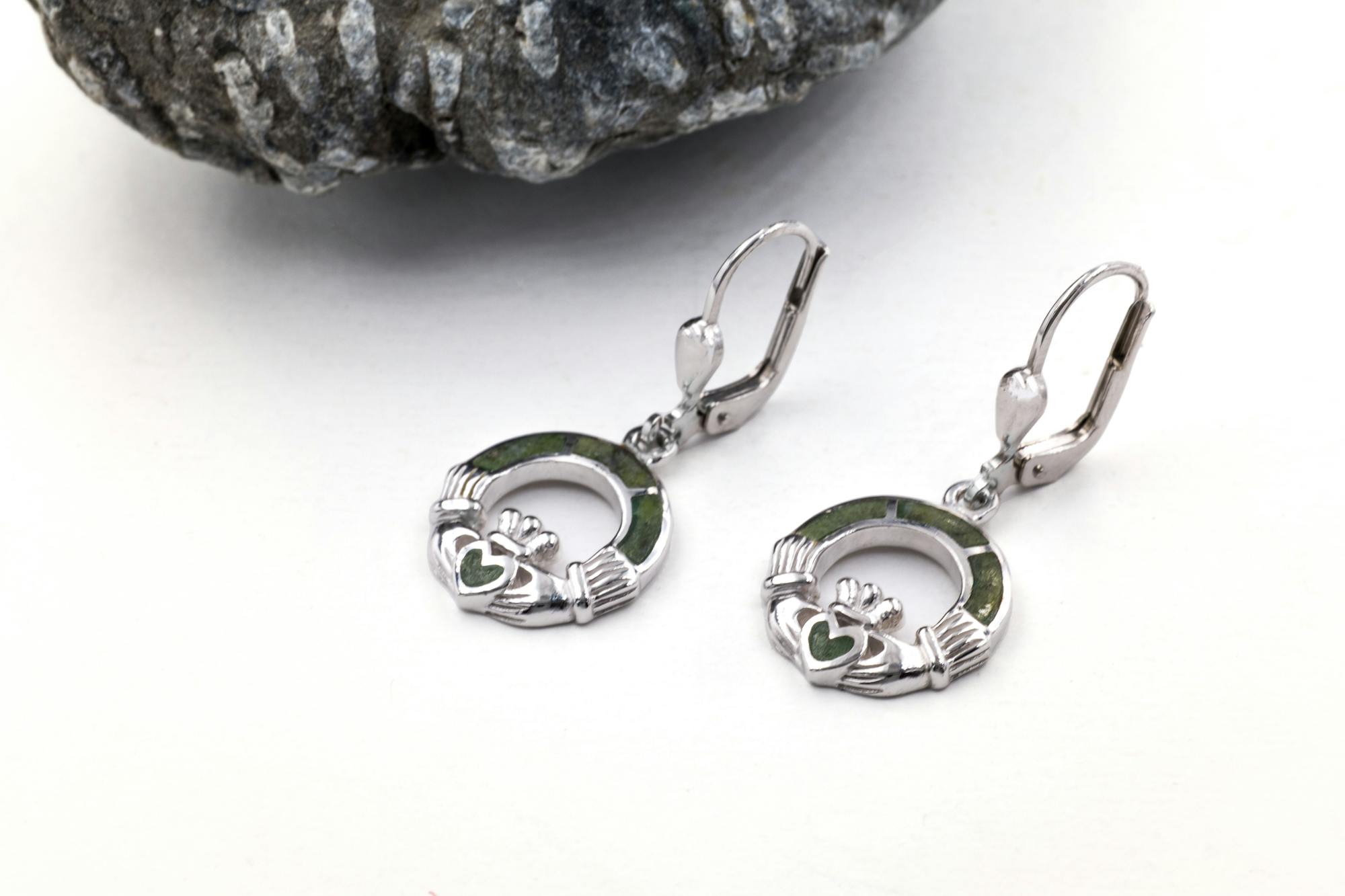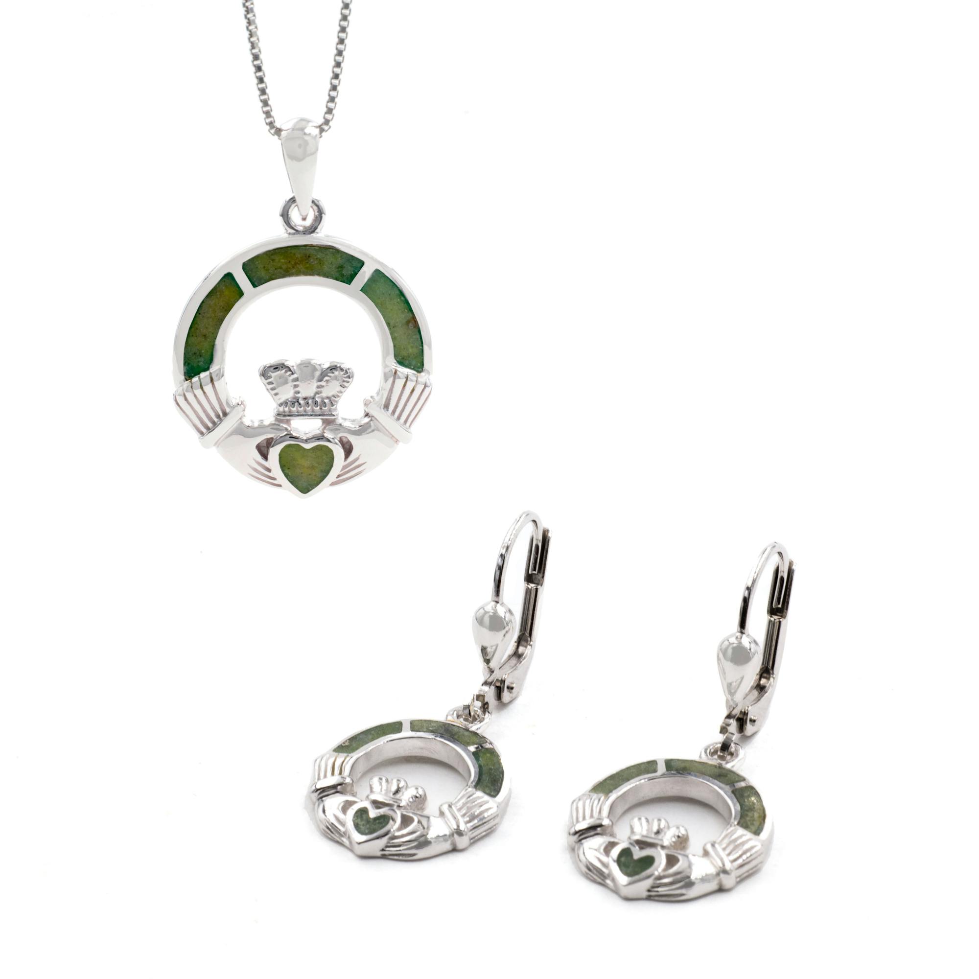This sterling silver Claddagh necklace and earring set is inlaid with Ireland's famous natural stone, Connemara Marble. This rare marble is found exclusively in the West of Ireland. What makes this marble so special are the various shades of green that it displays. The colour varies from shades of pale spring green to dark mossy green, often speckled with flecks of brown and white. This is not to be considered a flaw. Indeed, this is what makes this marble so unique; no two pieces are alike.