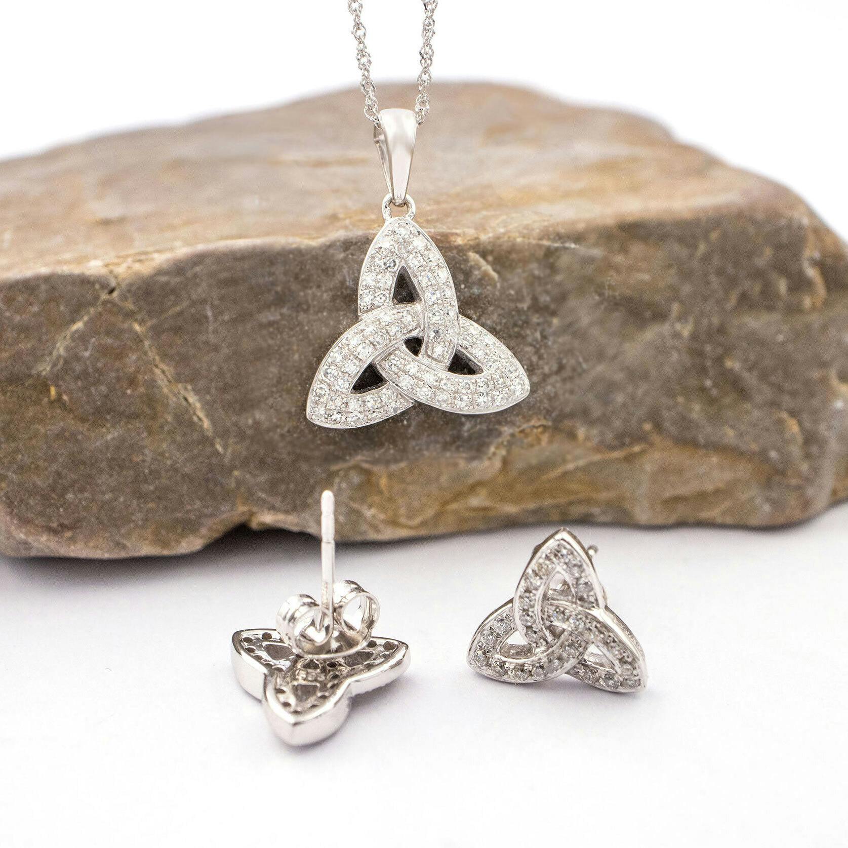 A dazzling 14K white gold Trinity Knot necklace and Earring set with deep sentiment to match its beauty. The elegant Trinity Knot has no beginning or end, with one unbroken strand weaving over and under in a seamless flow. This form has made it a popular symbol for eternity and it is known to many as the Celtic love knot representing past, present, and future.