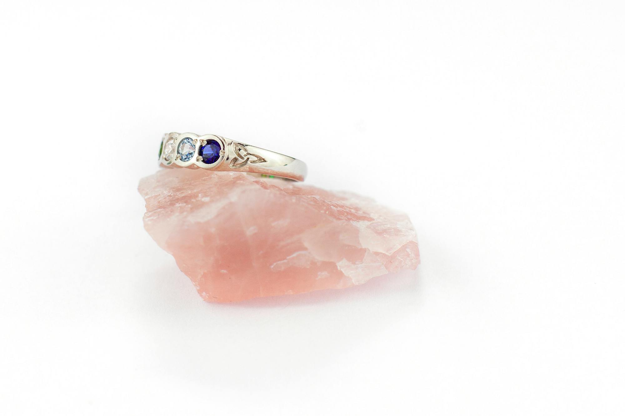 A beautiful birthstone ring crafted in your choice of Silver, 10K or 14K yellow gold or white gold. Subtle trinity knots on each shoulder give the ring a lovely side profile. Made to order for you with your choice of birthstones, each ring is unique and individual. Each vibrant birthstone is set in a classic and secure rub over setting.