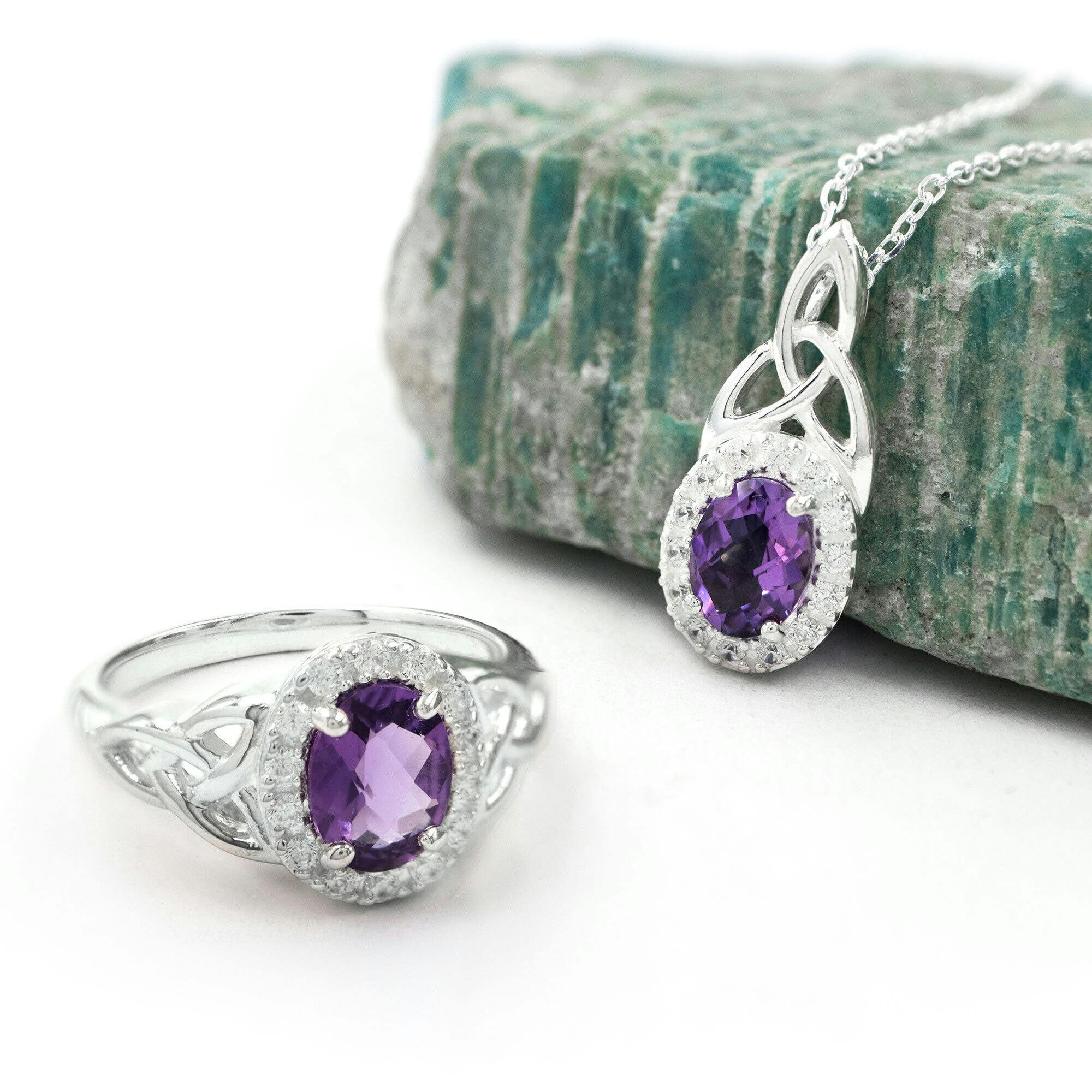 An expertly cut and polished oval gemstone in a four-prong setting is the focal point of the stunning sterling silver Halo Trinity Knot Necklace and Ring Gift Set . The faceted checkerboard cut adds scintillation, increasing the saturation and depth of colour for each carefully selected stone. With three dazzling gemstones to choose from, this necklace is perfect for those seeking something unique, with a halo of pave cubic zirconia adding sparkle and impact to a stunning design.