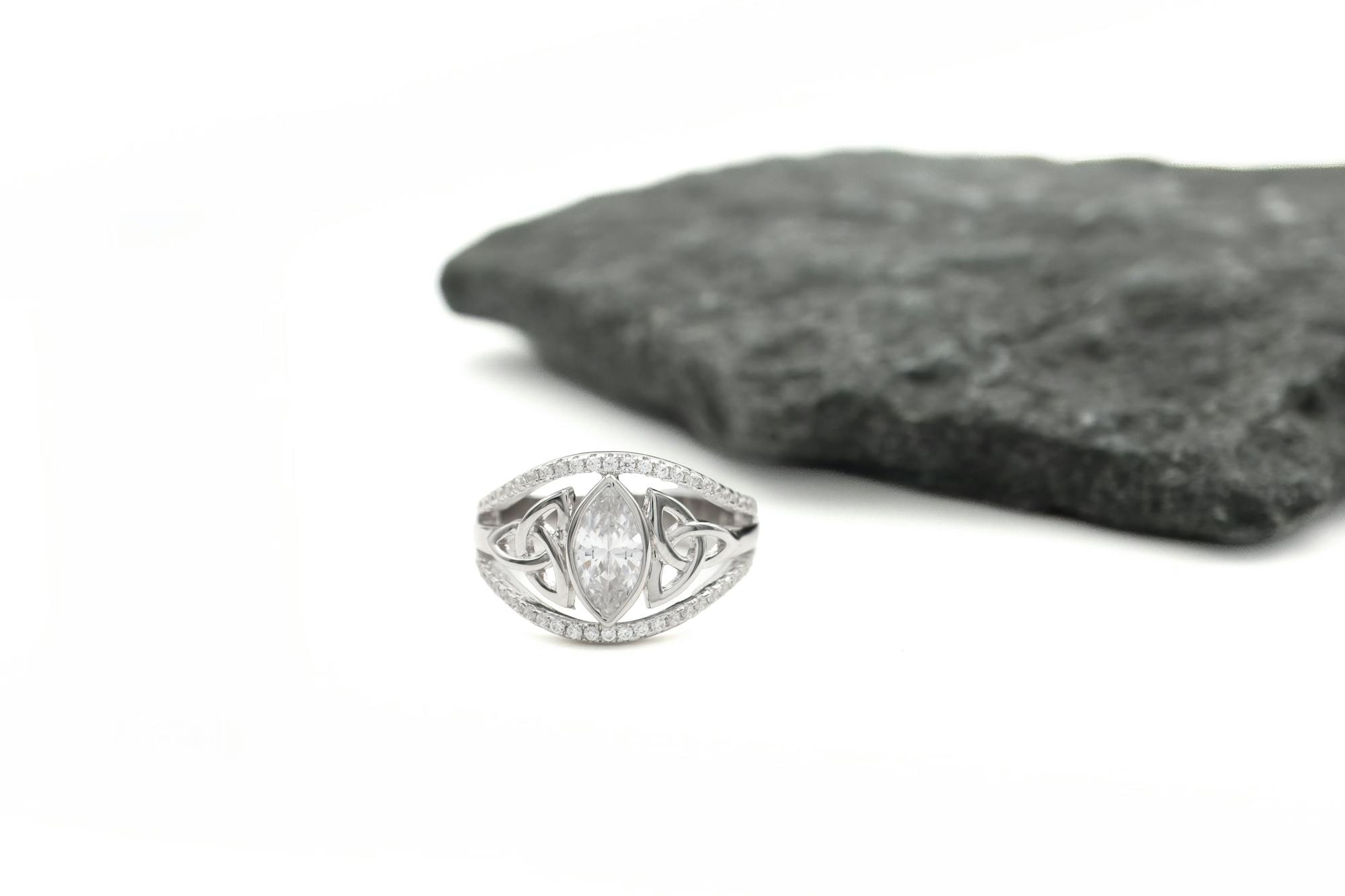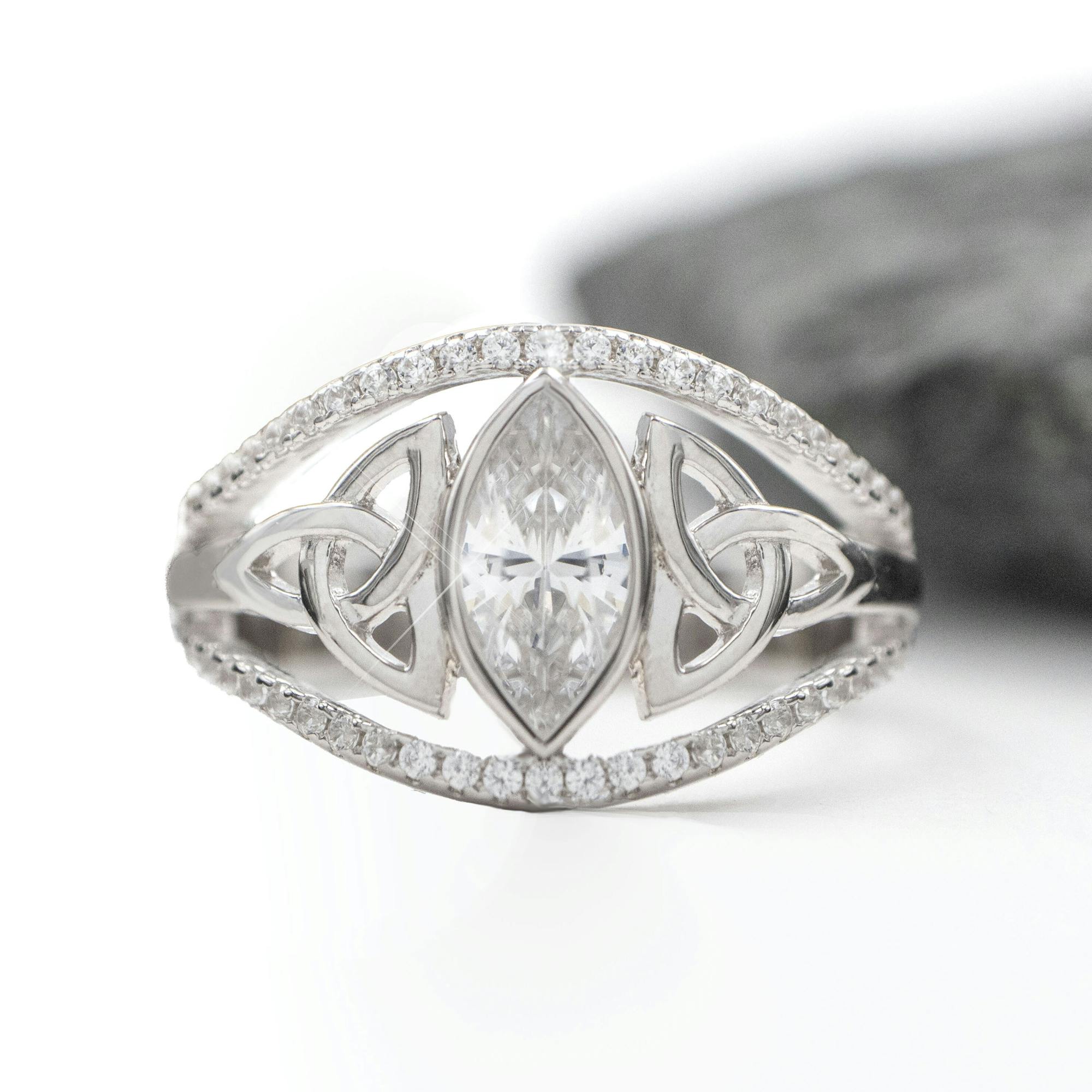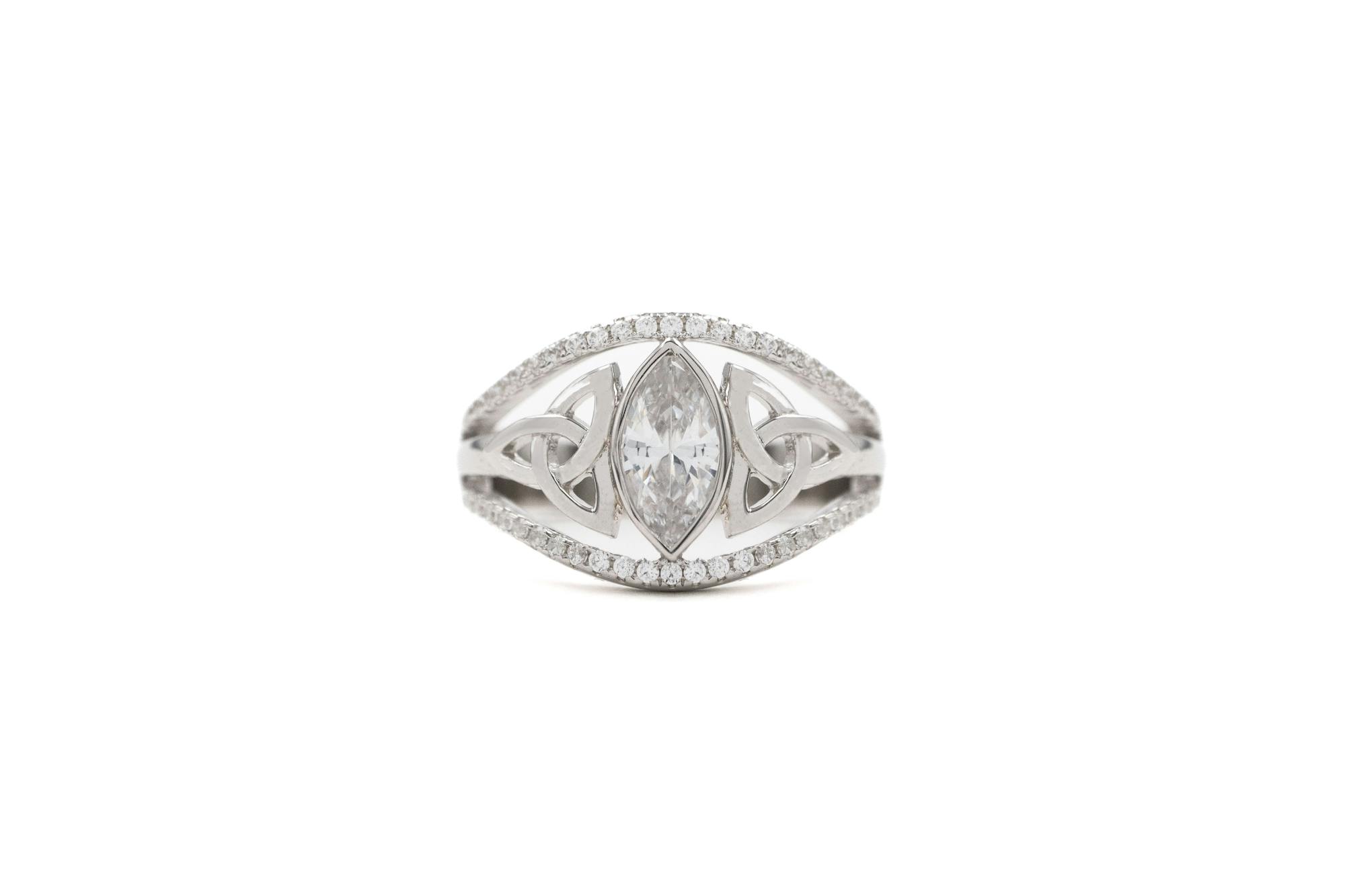 A sparkling, marquise cubic zirconia in a bezel setting is supported on either side by elegant Trinity knot shoulders. These stunning elements are framed by an ingenious split shank, embellished with sparkling pavé set cubic zirconia that add tasteful sparkle and glamour to an already dramatic ring.