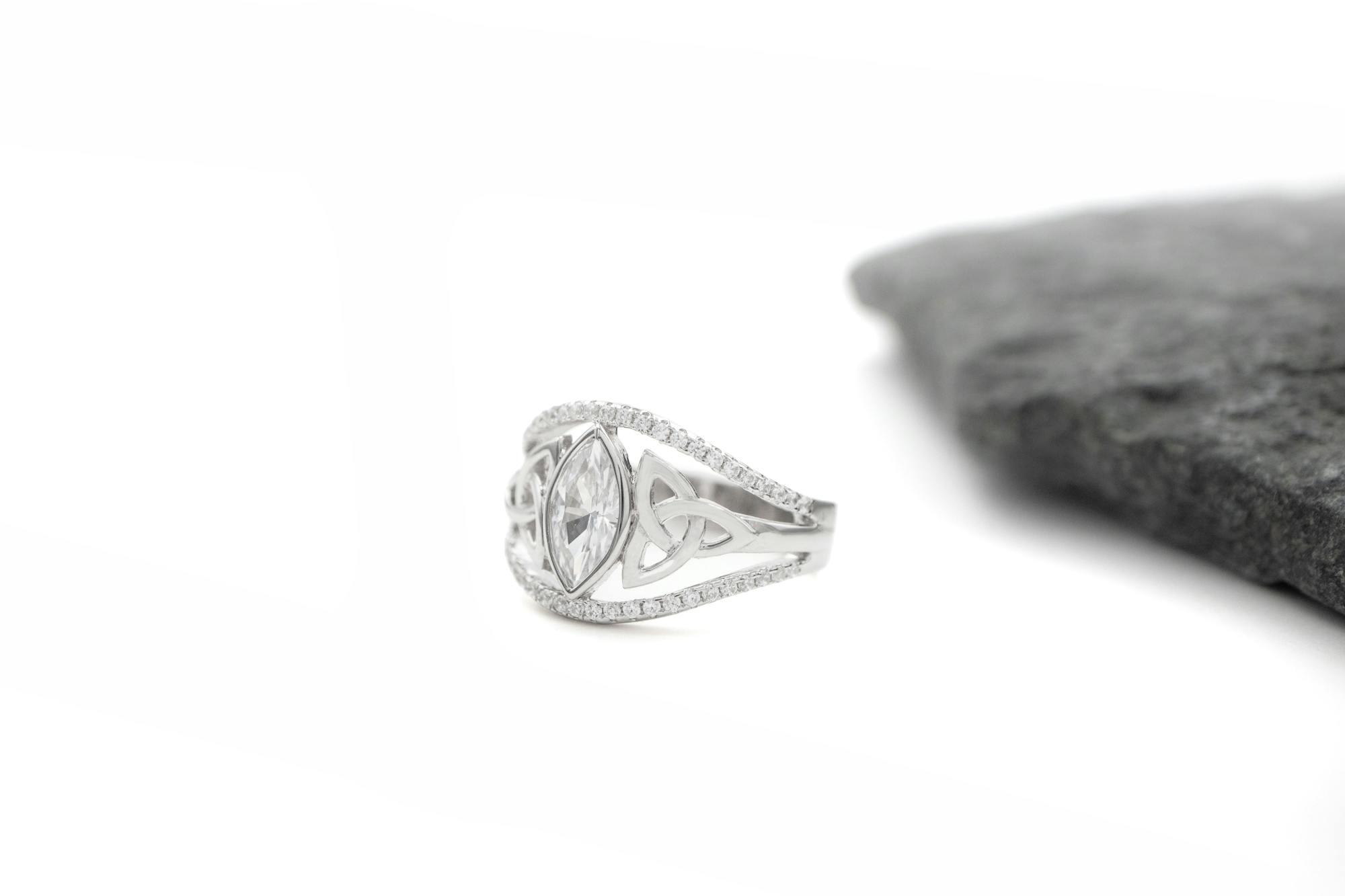 Representing eternity and the past, present, and future, the Trinity knots add style, support, and strength to the centre stone for a dramatic 12mm wide profile. The ring tapers elegantly down to a comfortable band at the back. A wearable yet impactful ring.