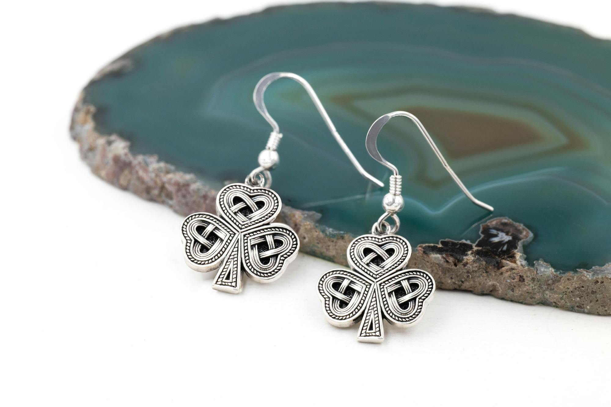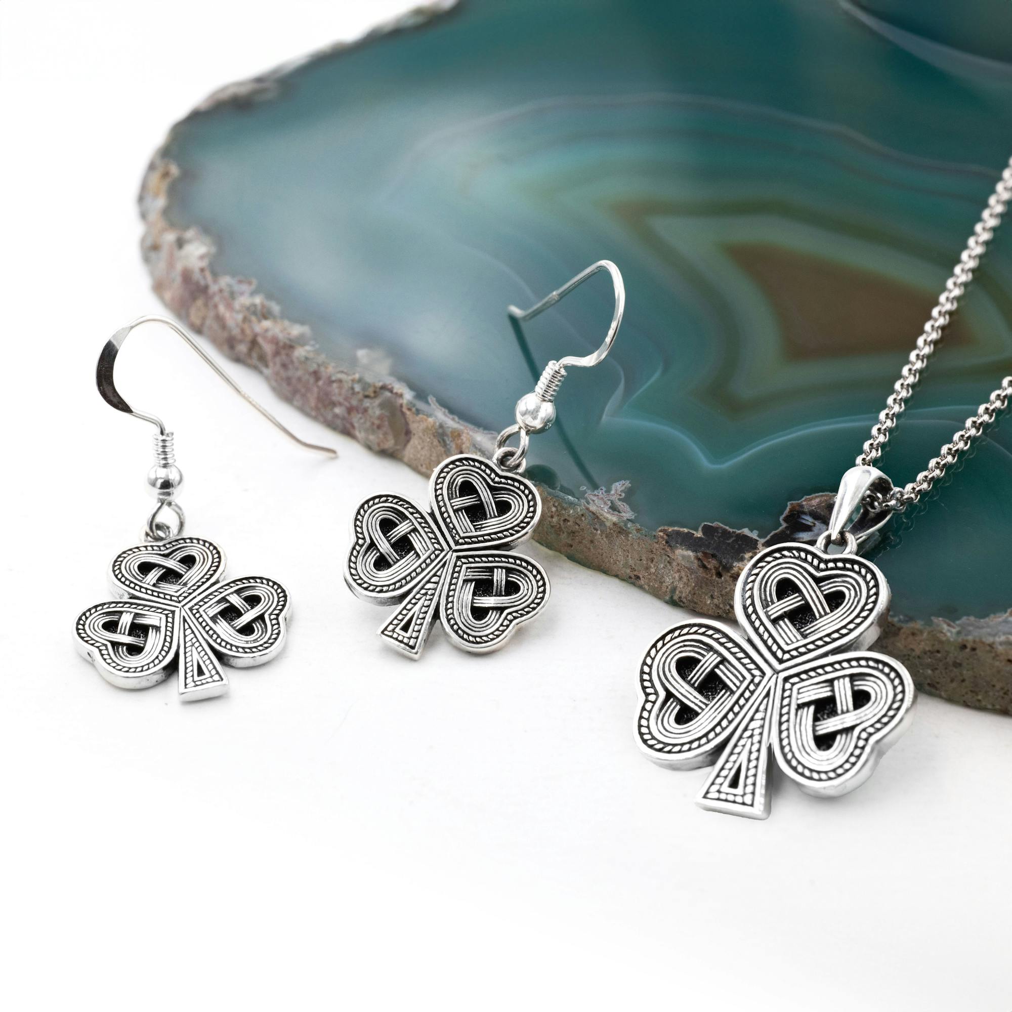 A striking, solid and strong, sterling silver, shamrock matching necklace and earrings set. An oxidised, antique style finish gives an 'old world charm' and beautifully highlights the detailed Celtic interlace, representing eternity, in each of the three leaves of the shamrock.