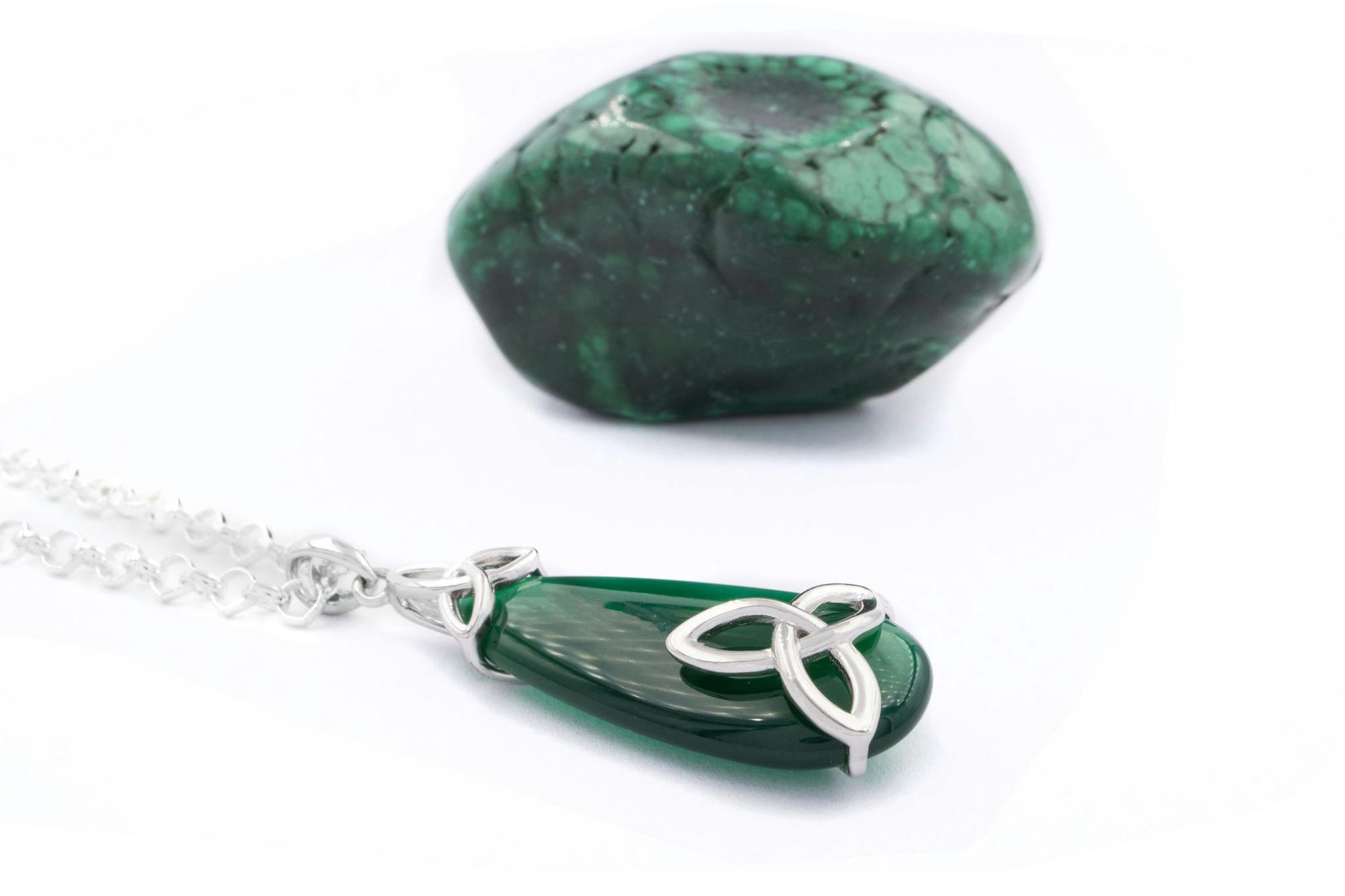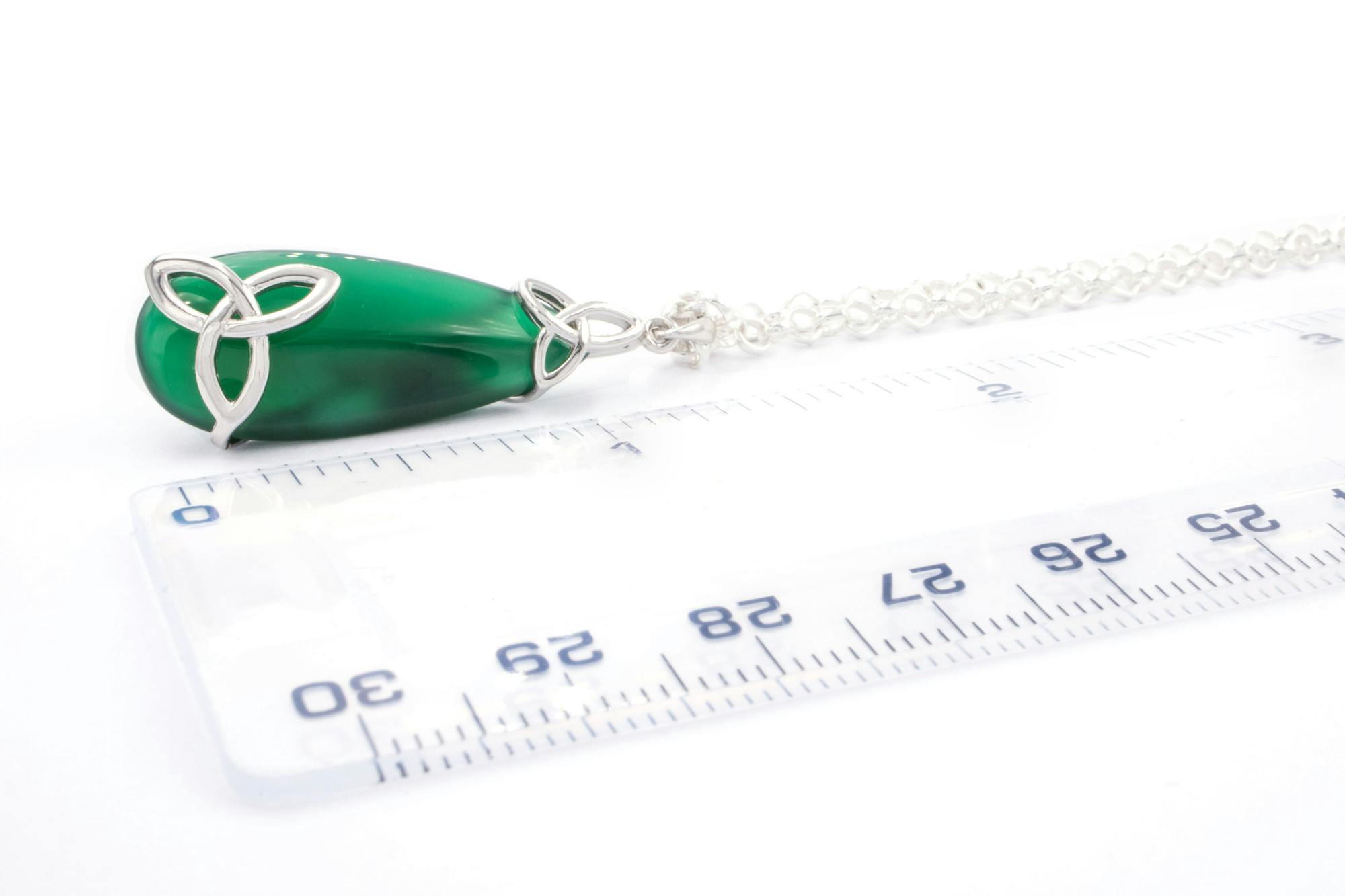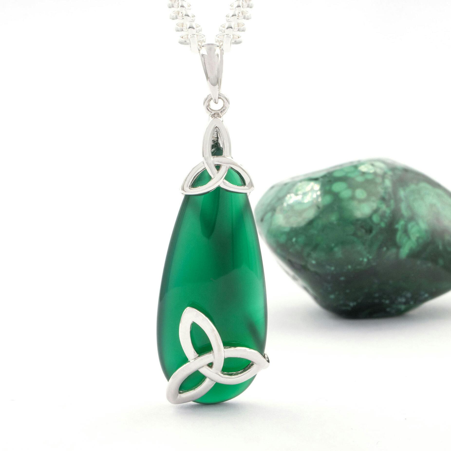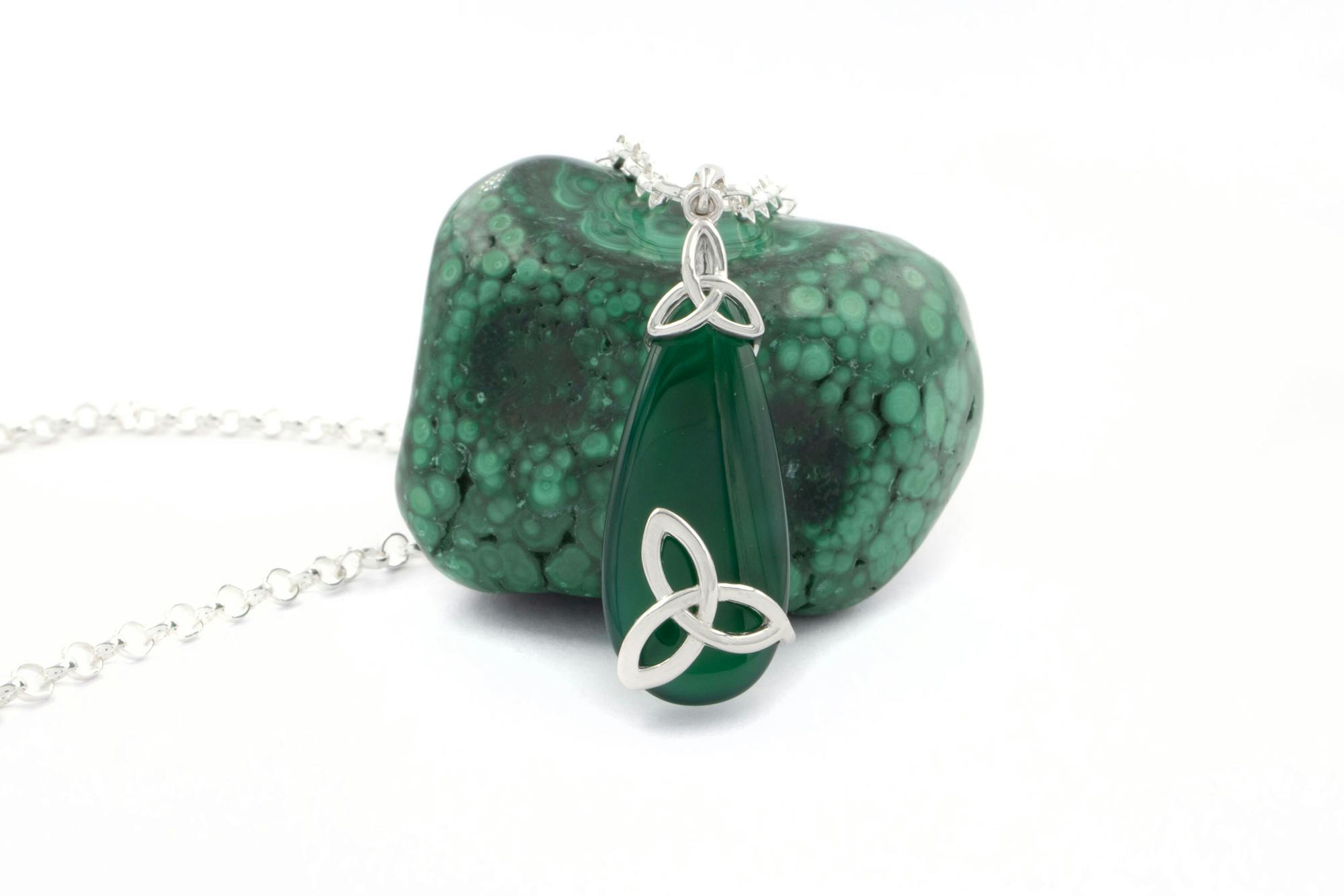 This Trinity Knot necklace is sure to get noticed. Two elegant sterling silver Trinity Knots look sublime set against the vibrant green of a weighty, teardrop-shaped, agate stone.