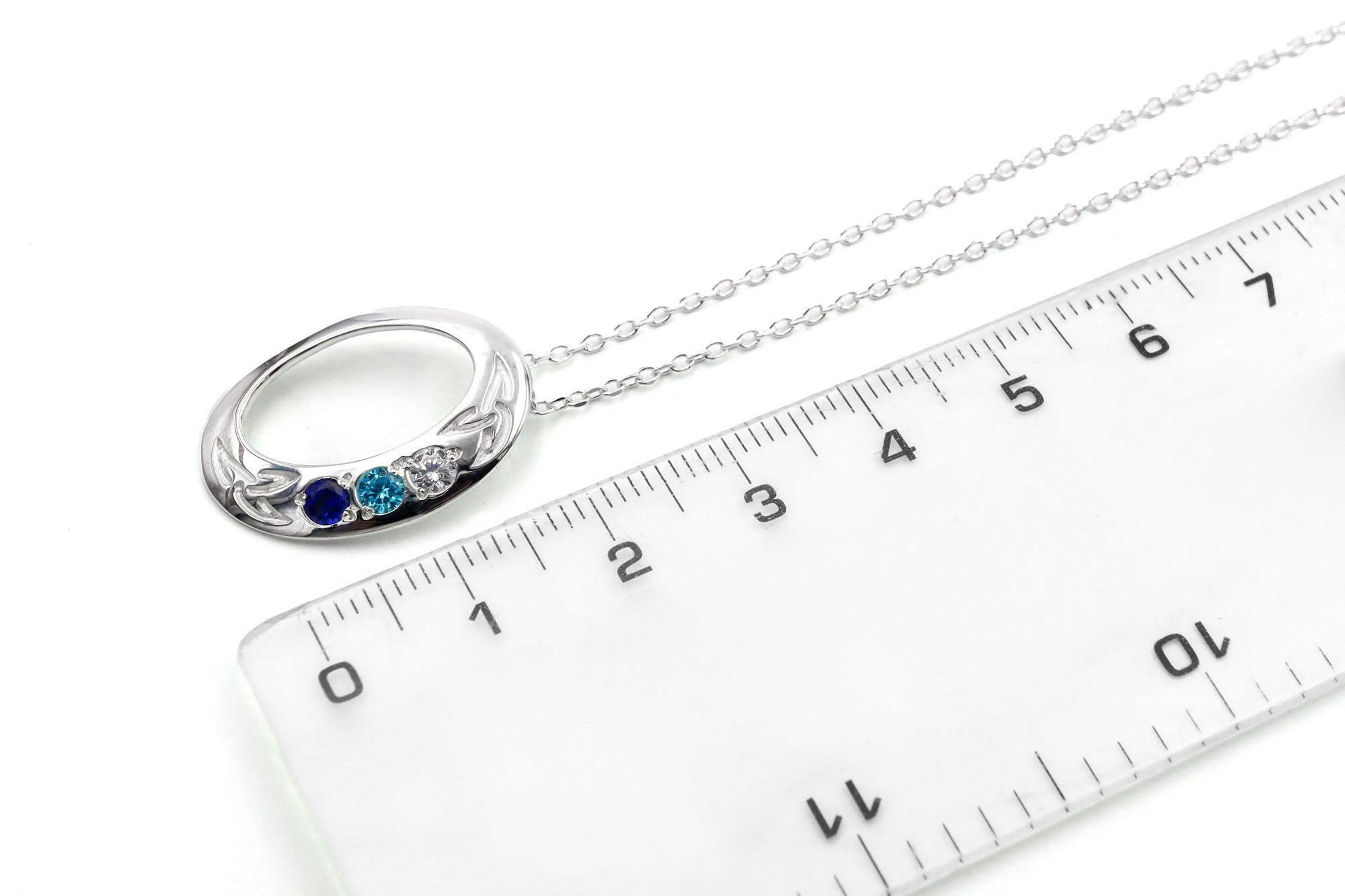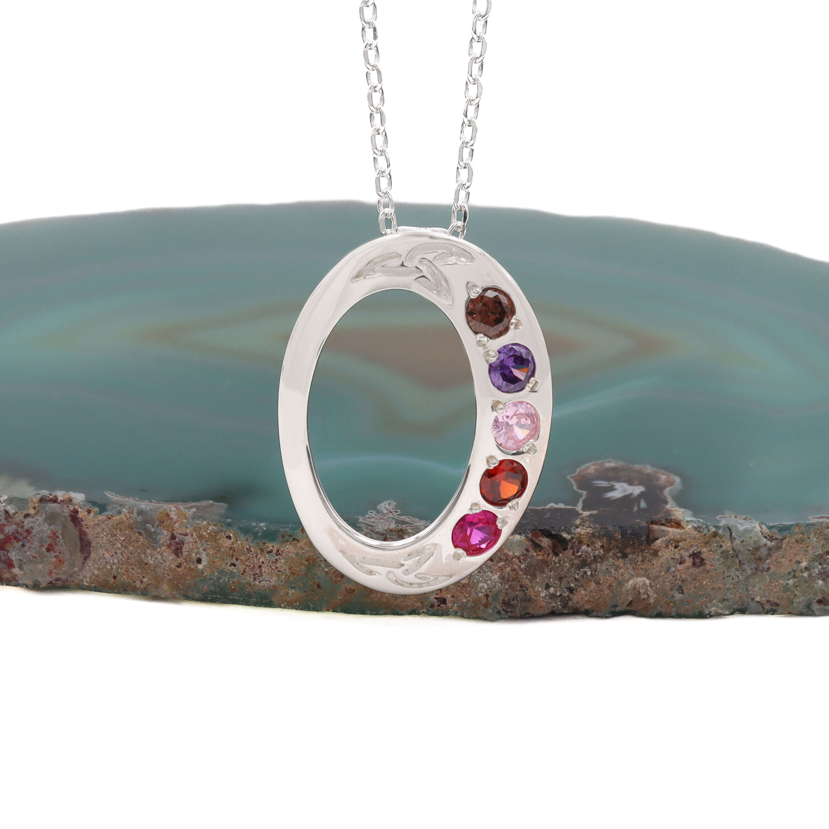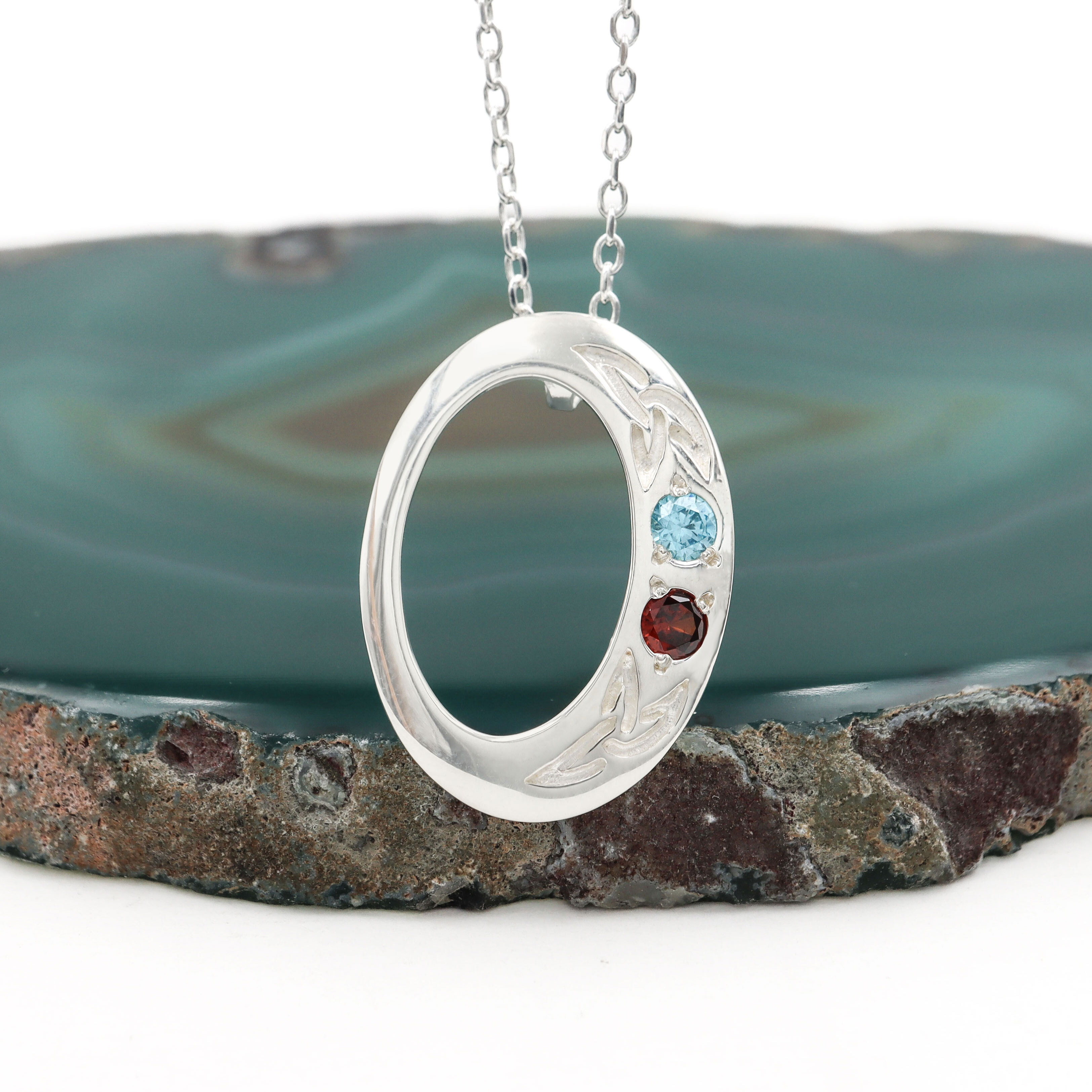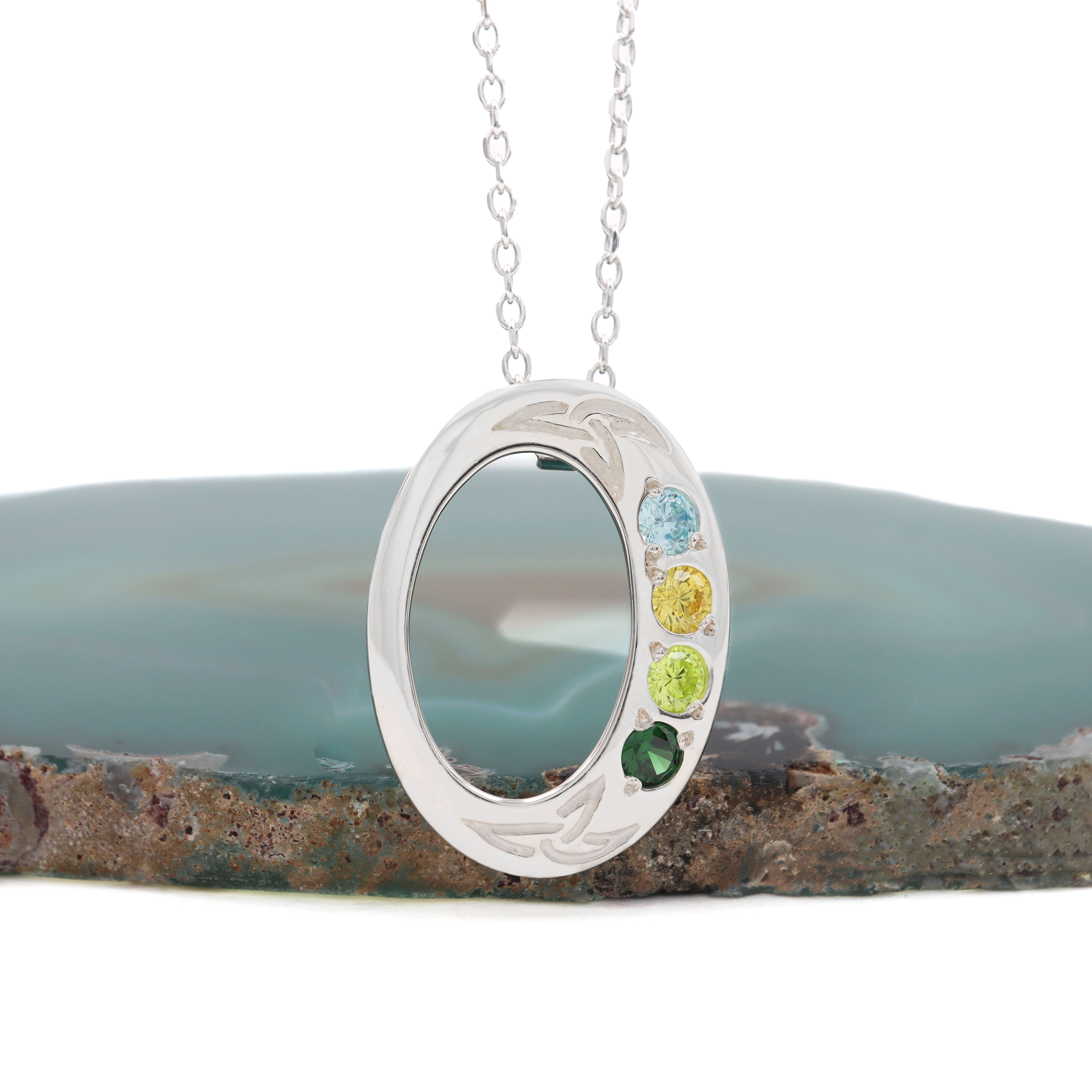 This gorgeous and graceful oval necklace is accented with two engraved Trinity Knots, bookending your choice of two to five beautiful birthstones. Representing eternal love and connection, the lovely symbolism of the Trinity Knot and birthstones combine in this celebration of familial bonds.