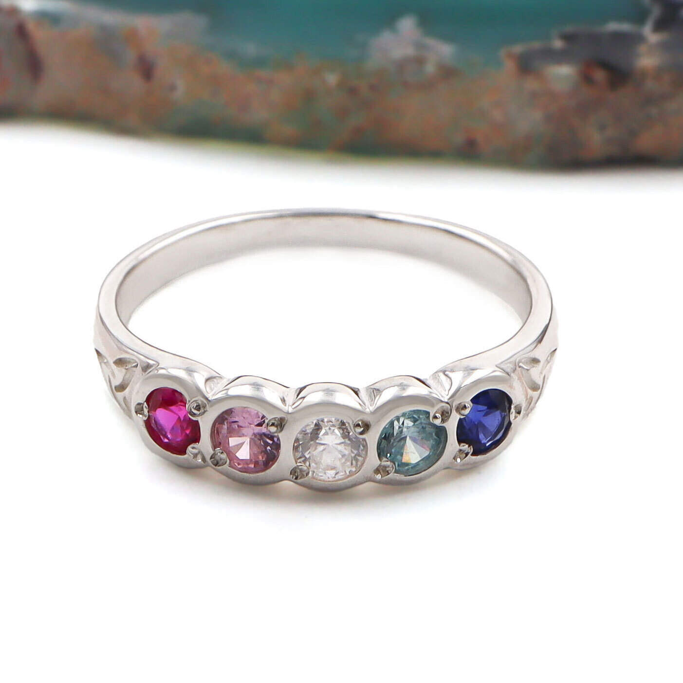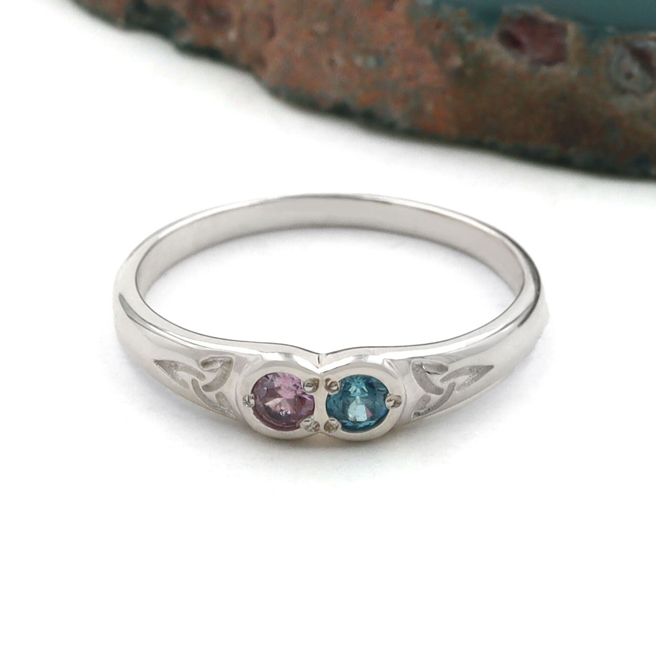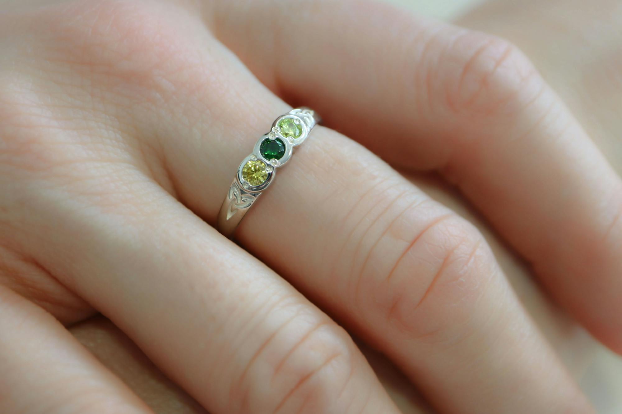 Each ring is made to order here in Ireland, in solid sterling silver and set with your personal choice of two to five birthstones. Each birthstone is vibrant in color and sits secure in a classic, rub over setting.