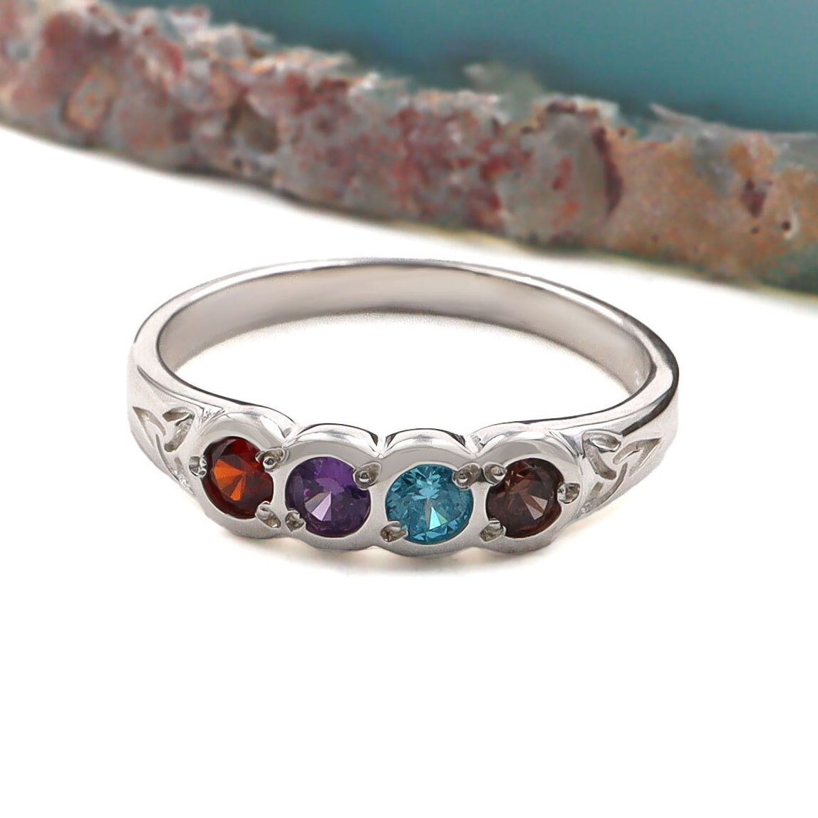 This gorgeous and graceful ring is accented with two engraved Trinity Knots bookending your choice of two to five beautiful birthstones. Representing eternal love and connection, the lovely symbolism of the Trinity Knot and birthstones combine in this celebration of familial bonds.