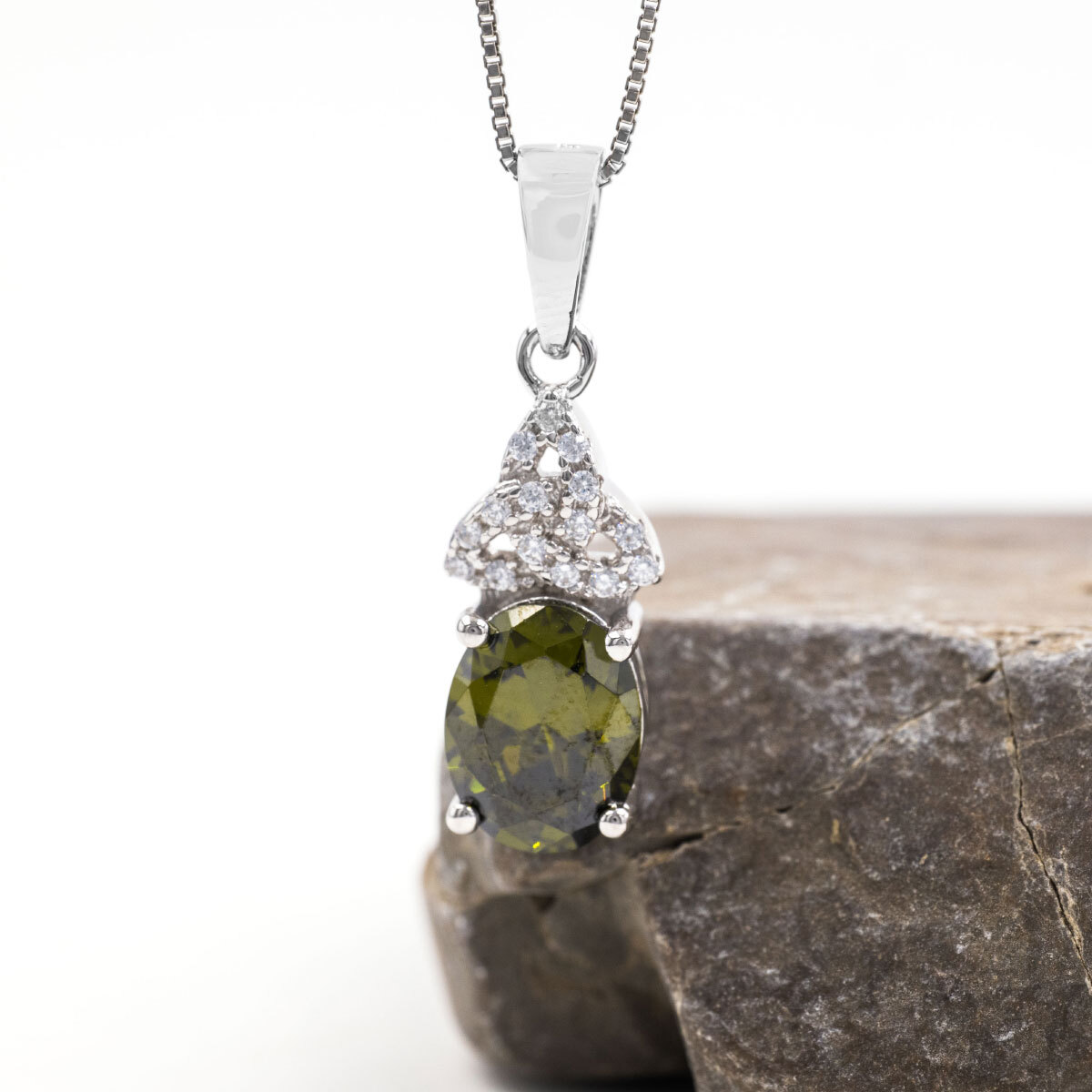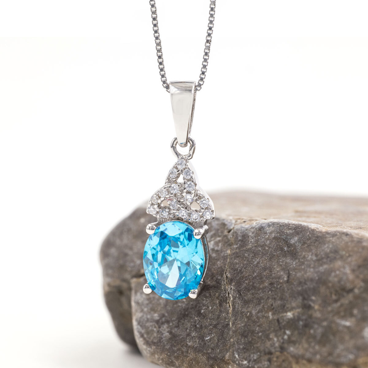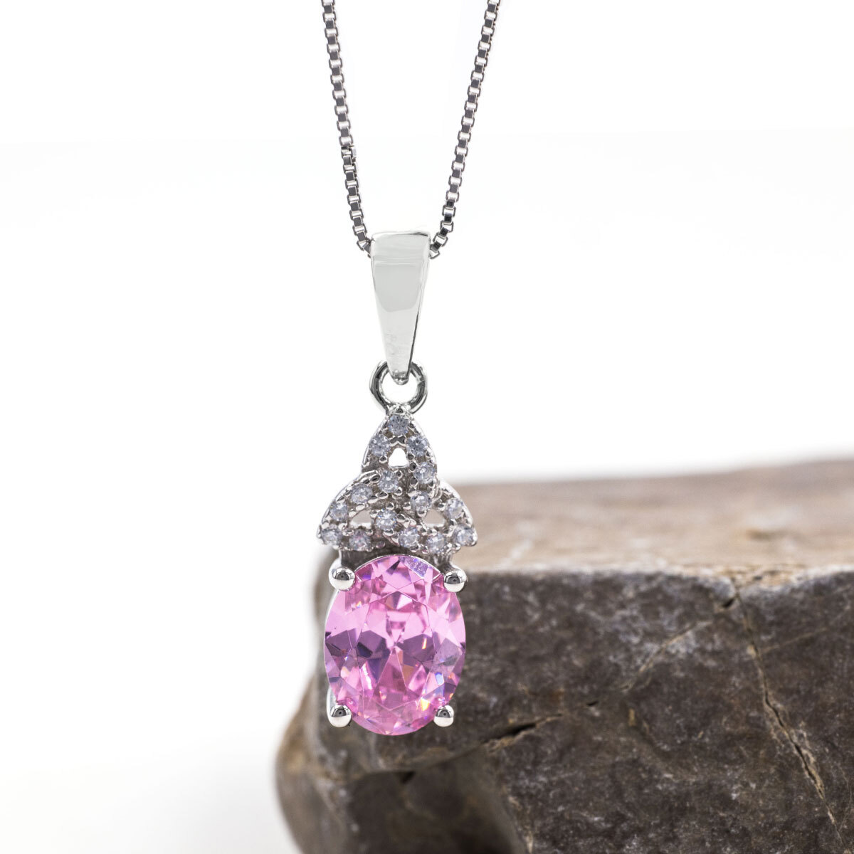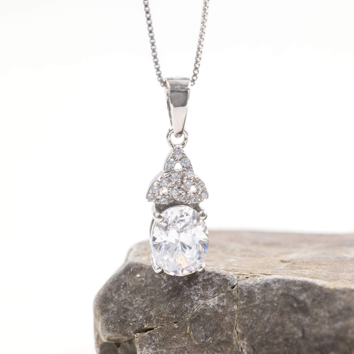 A Trinity knot, embellished with sparkling pave set cubic zirconia adds a touch of tasteful sparkle and glamour. Representing eternal love and the past, present and future, the Trinity knot also adds an elegant elongate design that tapers to a polished bale for a flattering profile on the neckline.