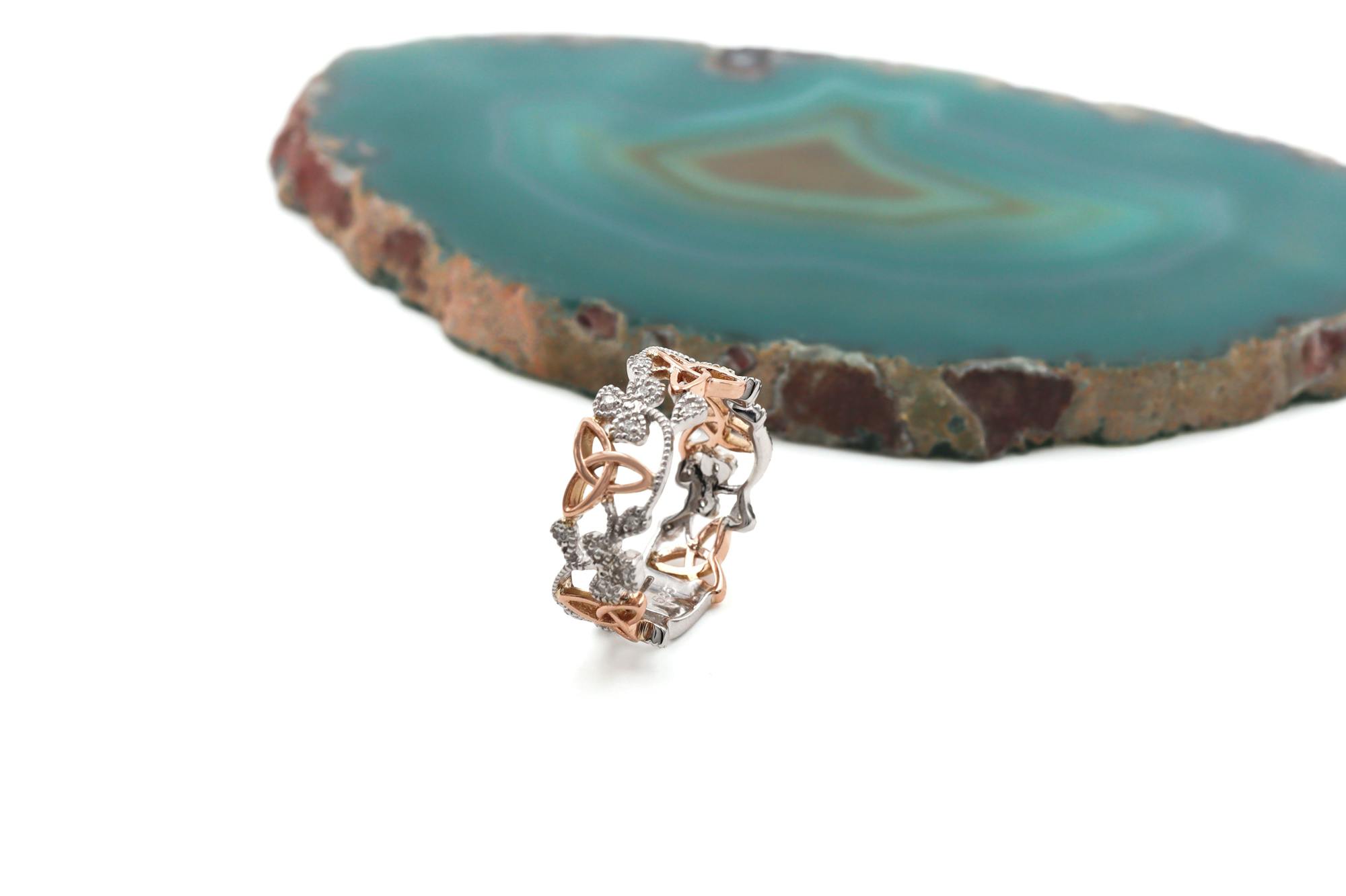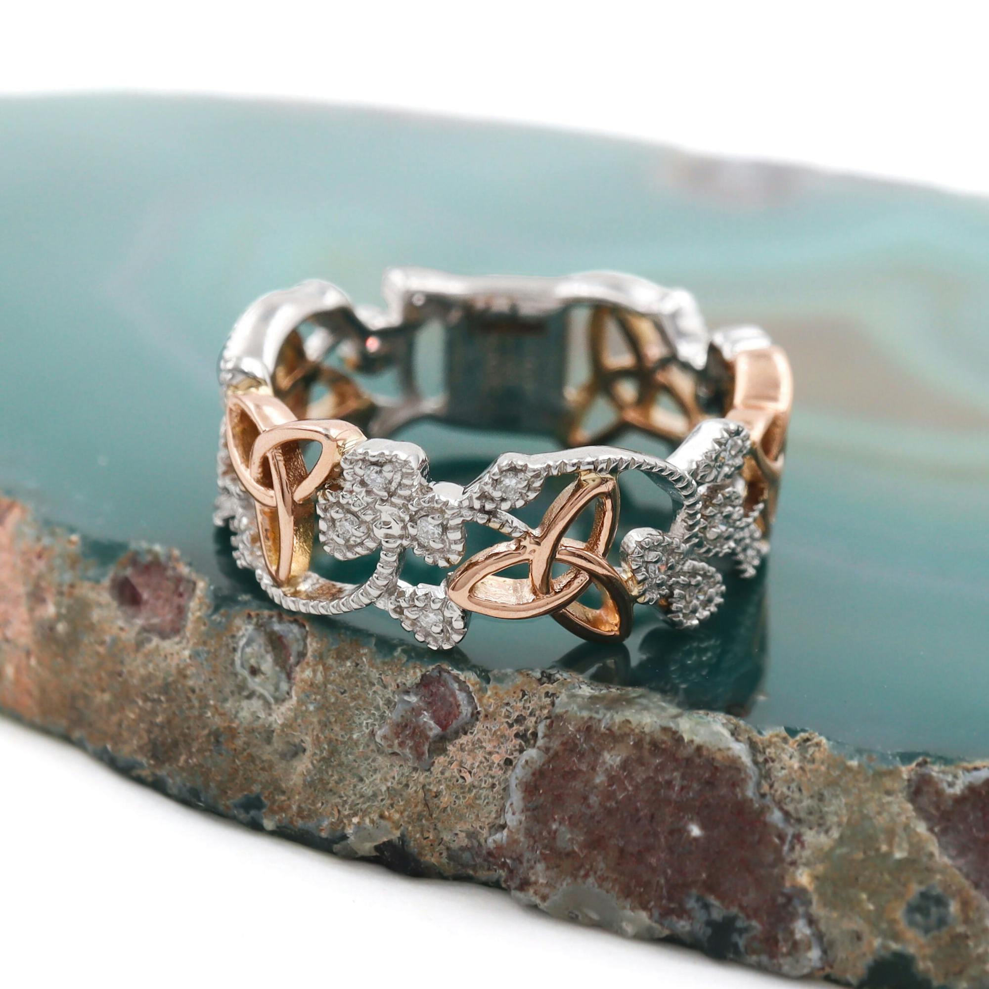 This spectacular 8mm wide band combines two iconic Irish symbols in one masterfully detailed ring. Carefully crafted with 14k Rose Gold Trinity Knots and delicate 14k White Gold Shamrocks, this beautiful statement ring has a flourish of sparkling diamond. The rose gold, white gold and diamonds beautifully compliment each other, making it a versatile ring that is sure to turn heads and can be treasured for a lifetime.