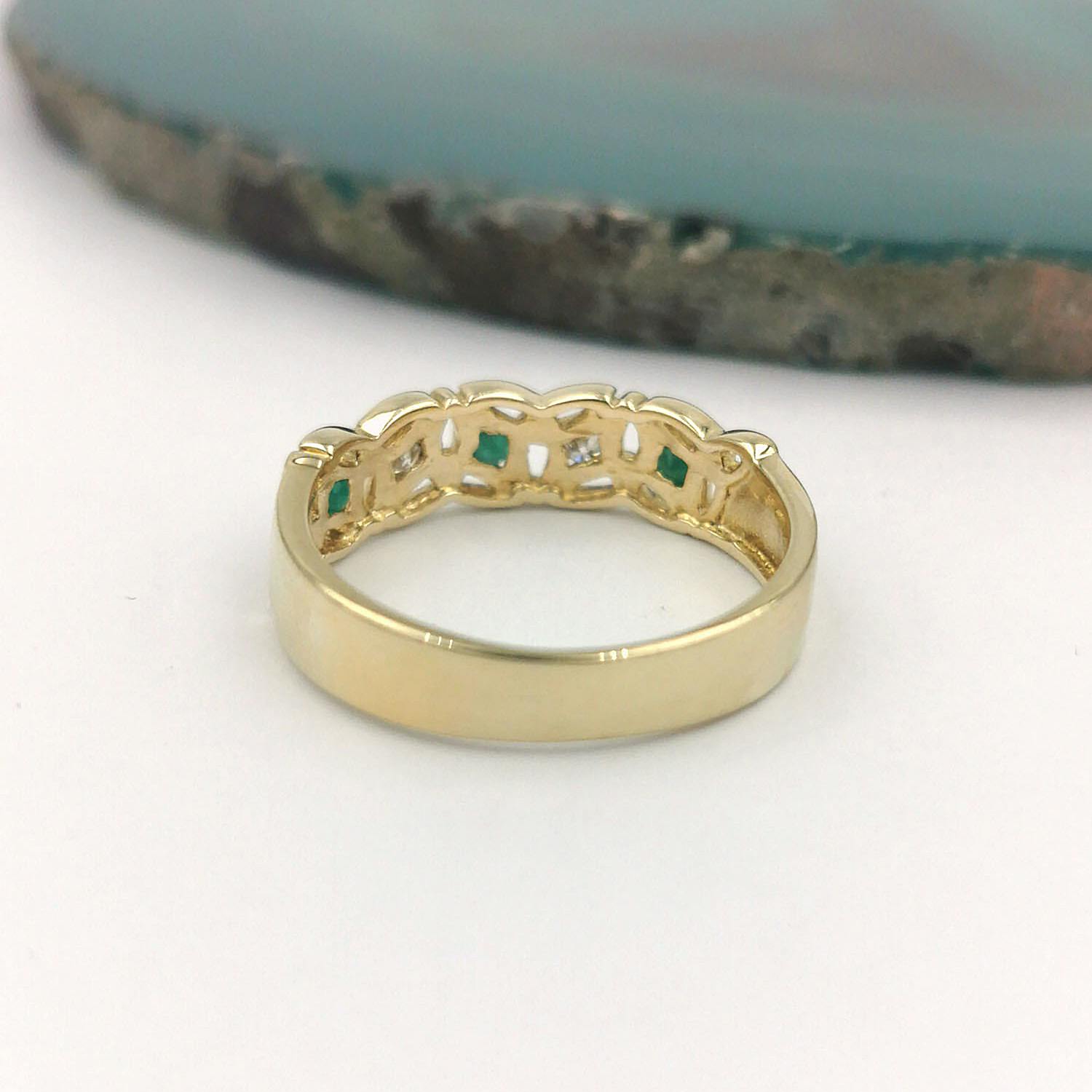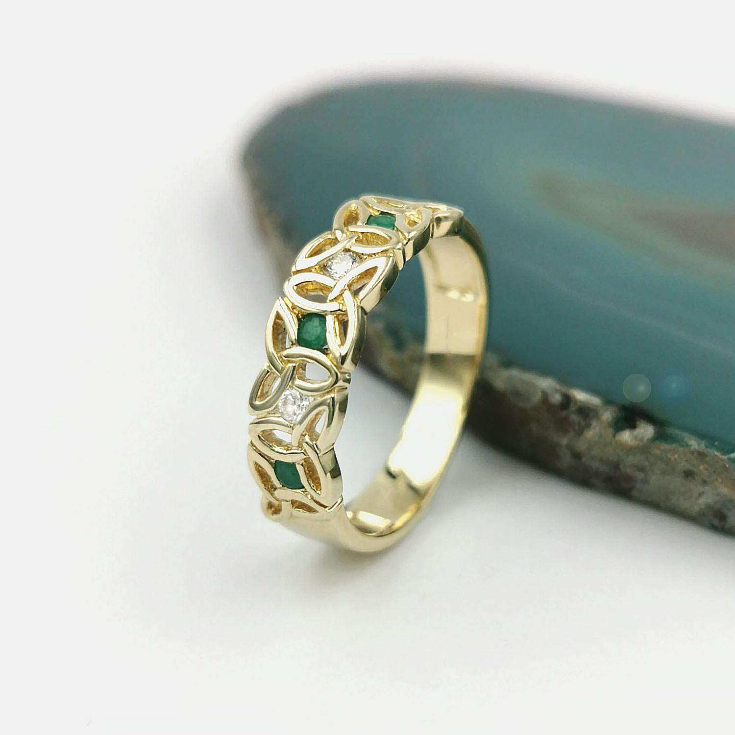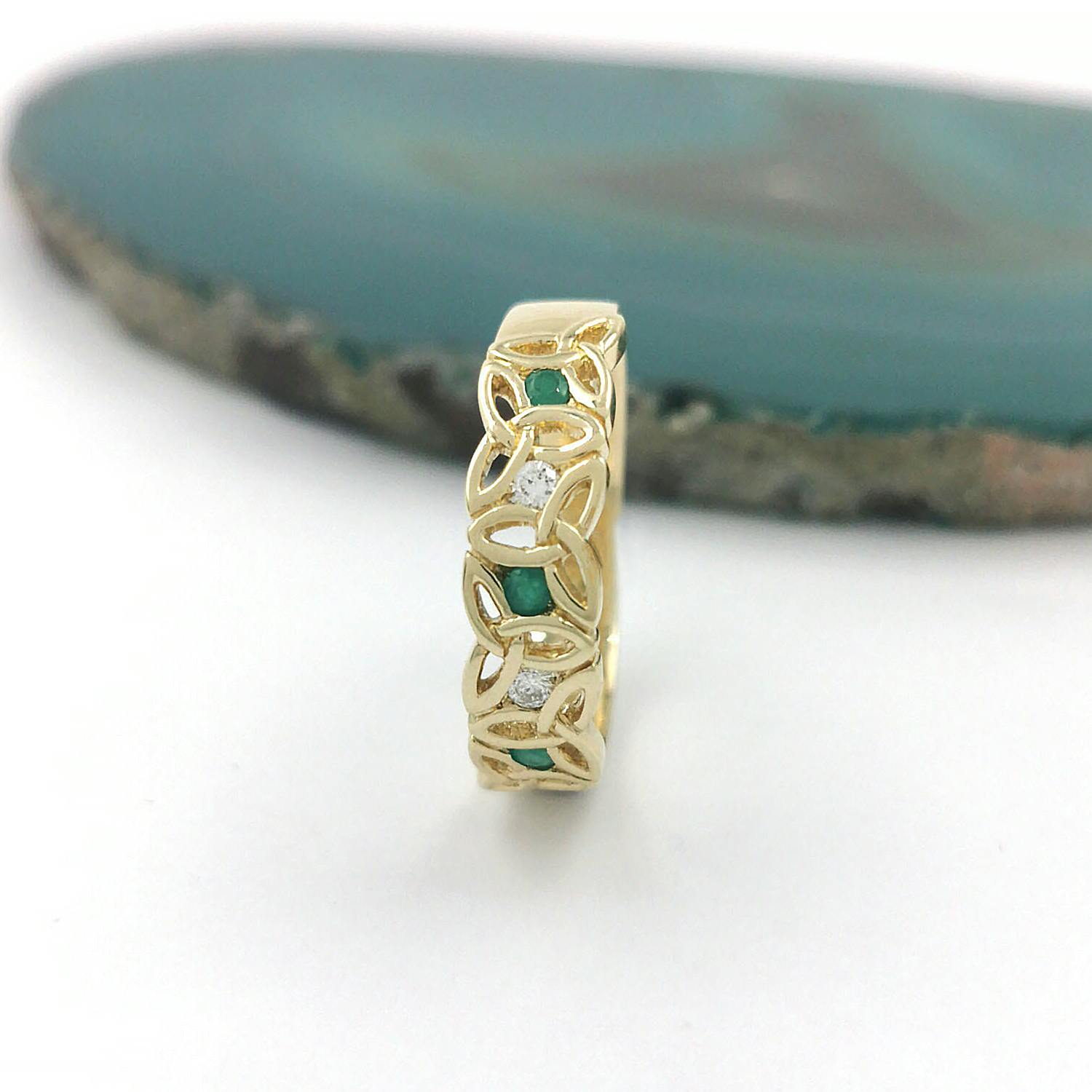 This stunning trinity knot band is all about the contrast between the rich warmth of solid yellow gold and the vibrant green of three round emeralds. Sparkling diamond alternates with emerald set between six trinity knots.