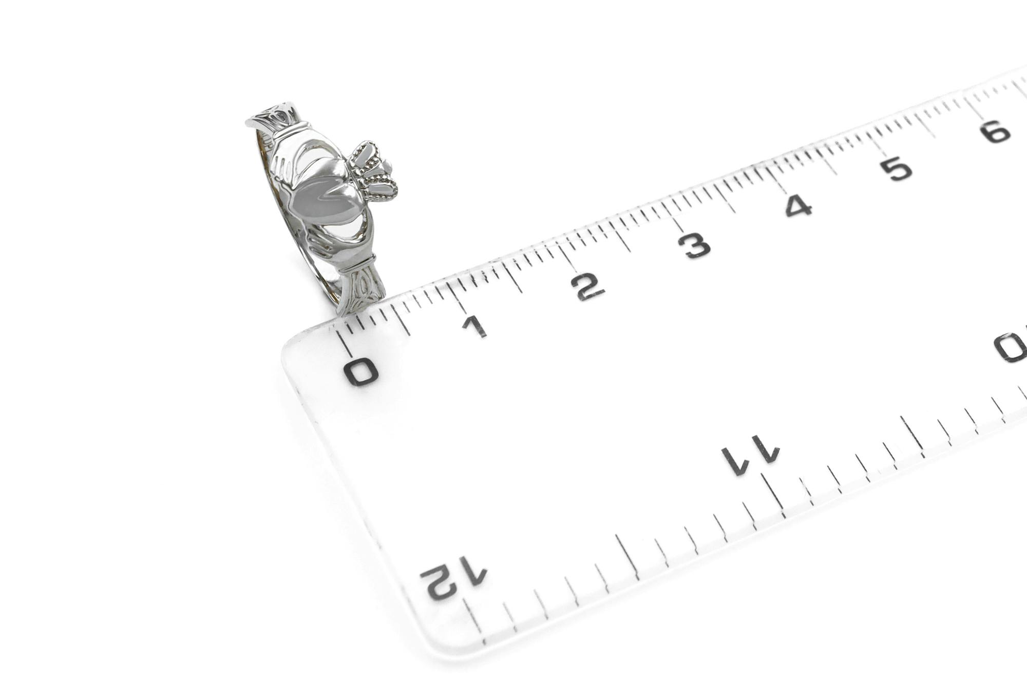 The measurement from the tip of the crown to the bottom of the heart for this Claddagh ring is 9.0 mm. The width of the band is 2.0 mm. |