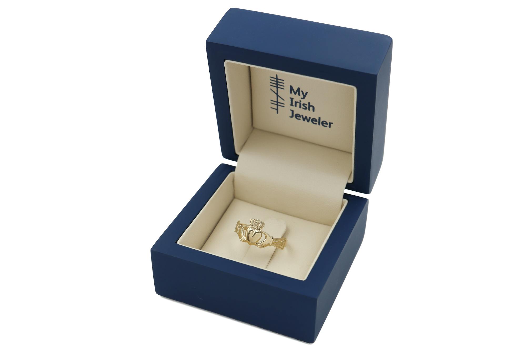 This Claddagh ring measures 9mm from the top of the crown to the base of the heart and can be made in your choice of lovely 9K white gold or rich and warm 9K yellow gold.