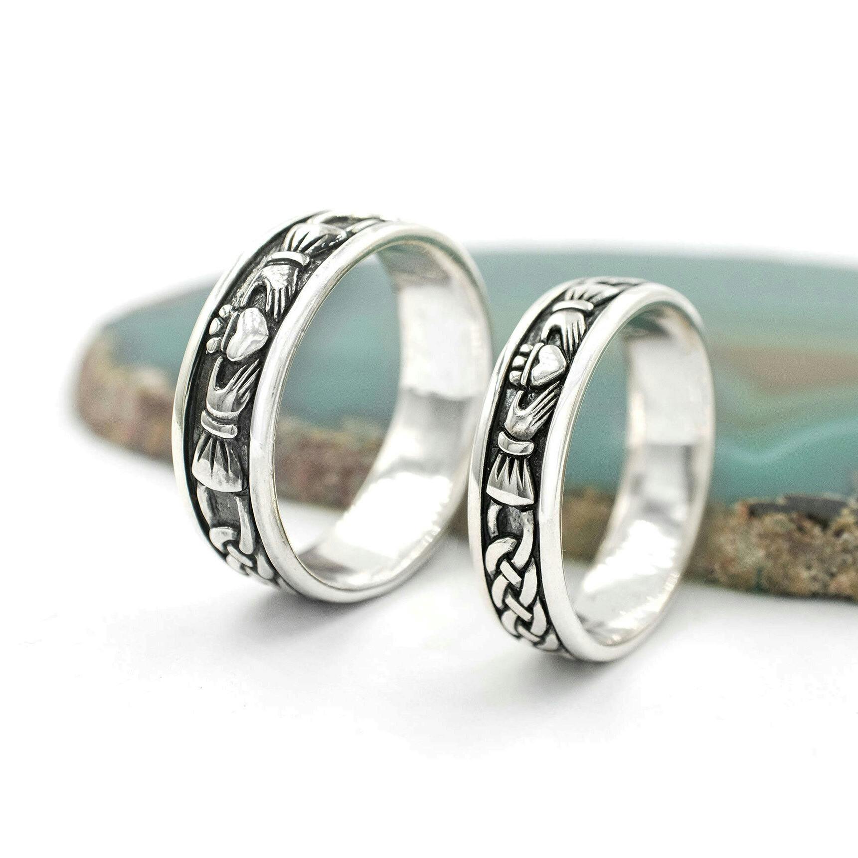 This stunning sterling silver ring set pairs the classic hands, heart, and crown of the iconic Claddagh design with an intricate Celtic knot band. The beautiful detail is picked out with a black oxidized finish for rings with deep meaning and striking beauty.