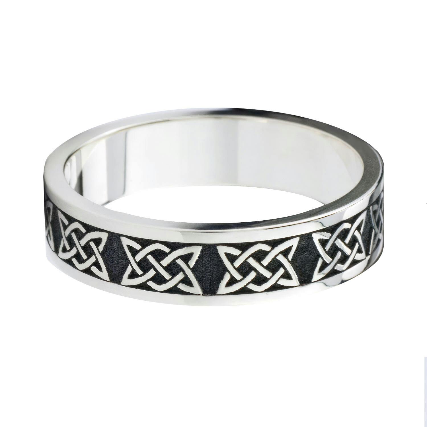 Elegant and intricate Celtic love knots repeat around the band. The embossed knots are formed by a continuous strand that weaves over and under in an unbroken loop, symbolizing eternal love and connection - Perfect for celebrating a unique bond. Knots such as these adorn ancient manuscripts and Celtic treasures and were thought to confer protection and strength.