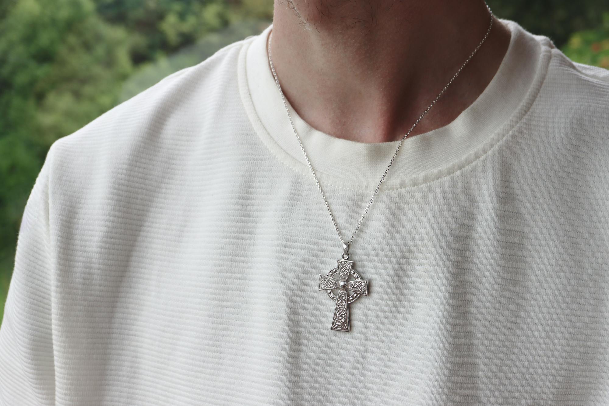 A boss at the center of the cross is adorned with a 'shield decoration' inspired by the armour of our ancient ancestors. ou will certainly feel ready to take on any obstacle wearing this stunning cross that has strength as well as beauty. A popular gift and a piece to treasure for a lifetime.