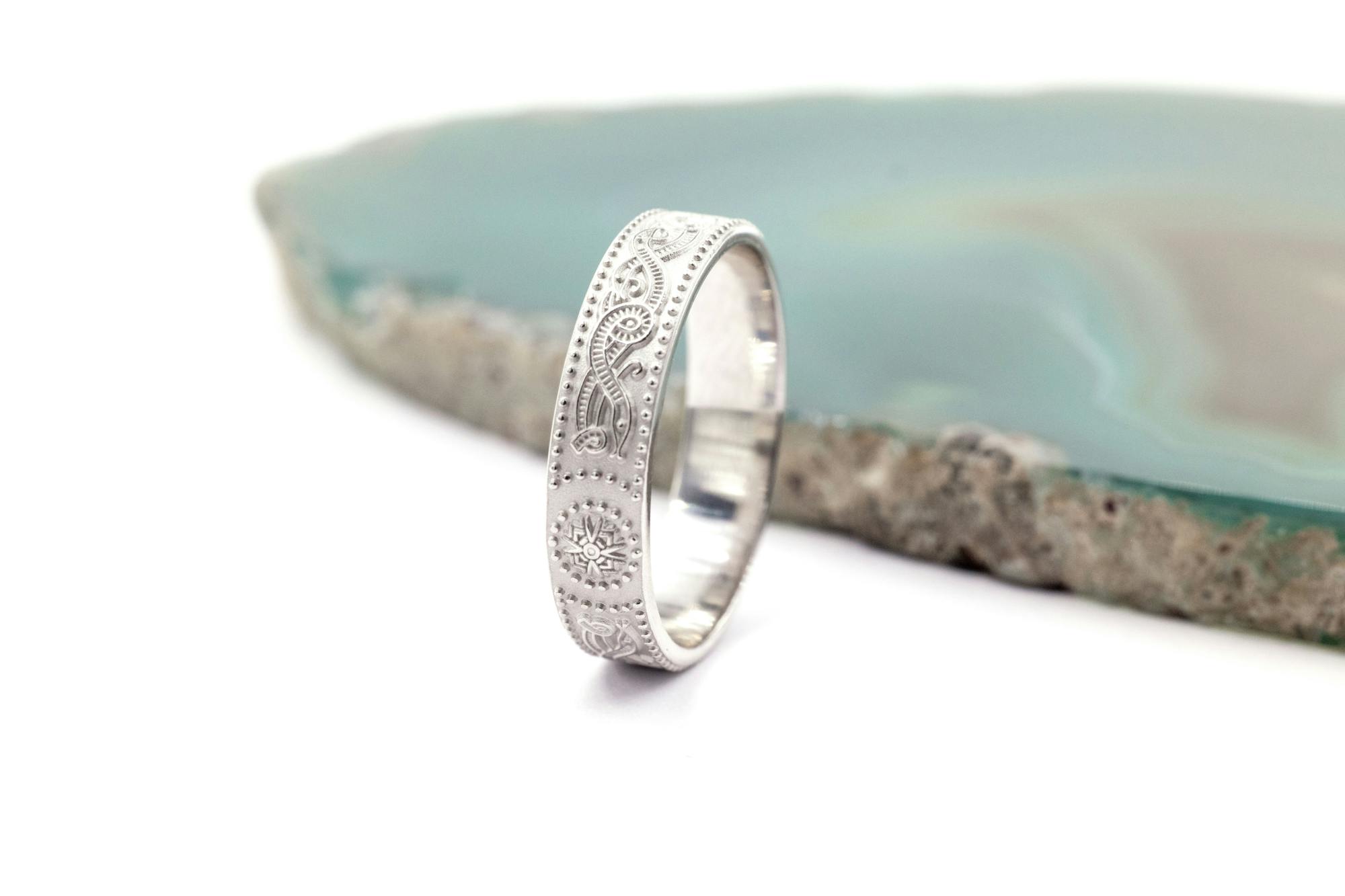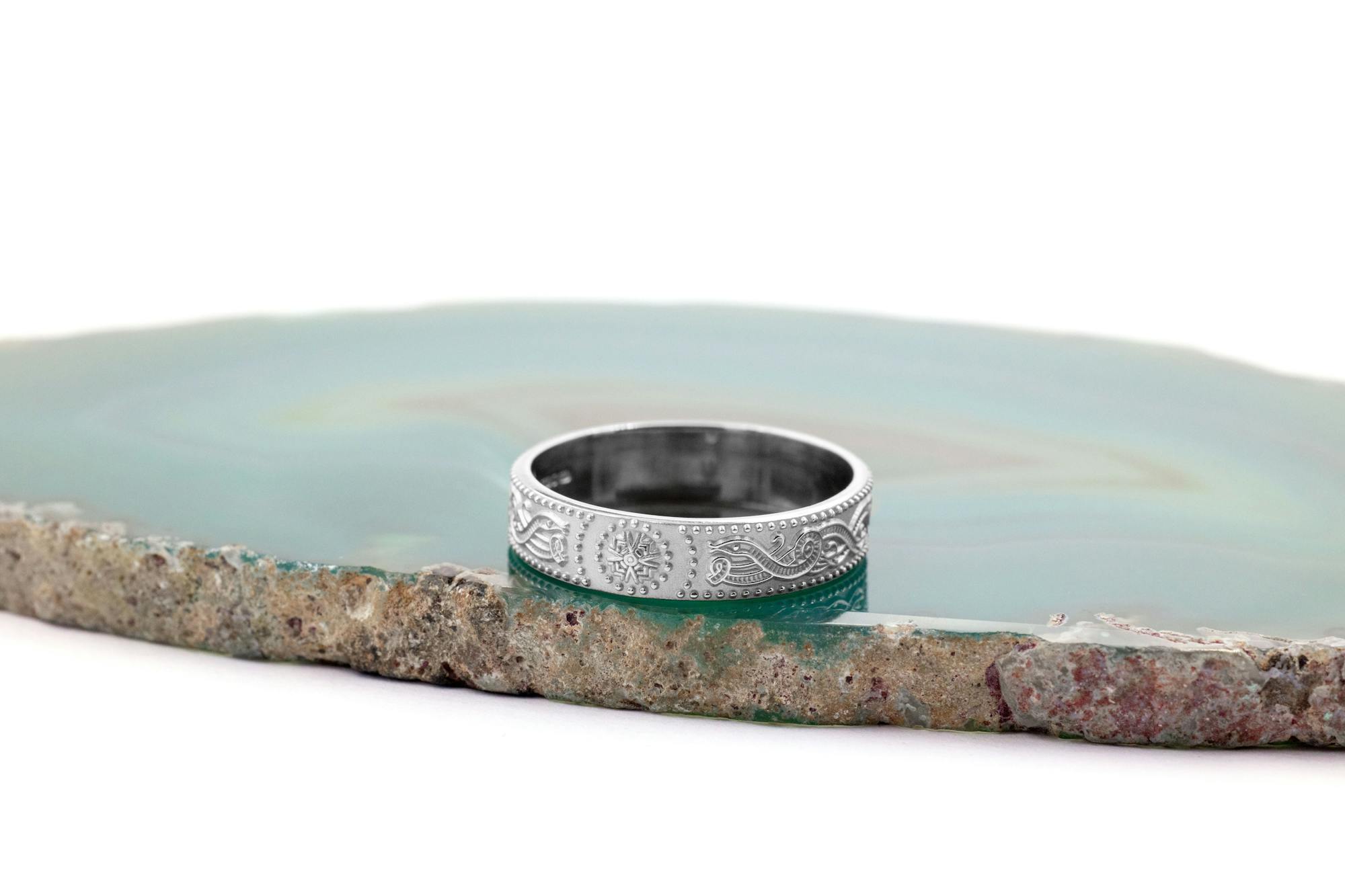Intricate beauty and wonderful symbolism combine in this Celtic Warrior design. Inspired by one of Ireland's most famous ancient treasures, the Ardagh Chalice, the shield designs echo the battle armour of Celtic Warriors. Representing strength and beauty, this wonderful history and symbolism makes this design a perfect choice for a ring of significance.