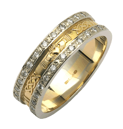 This diamond studded Claddagh ring is a real Gem. An extremely eye catching and elegant design. The center of the ring has the beautiful Claddagh symbol accompanied by a subtle Celtic motif. The diamond trims dazzle with brilliance as they repeat around the band.