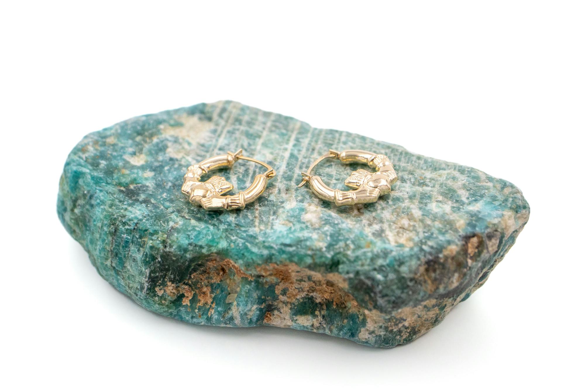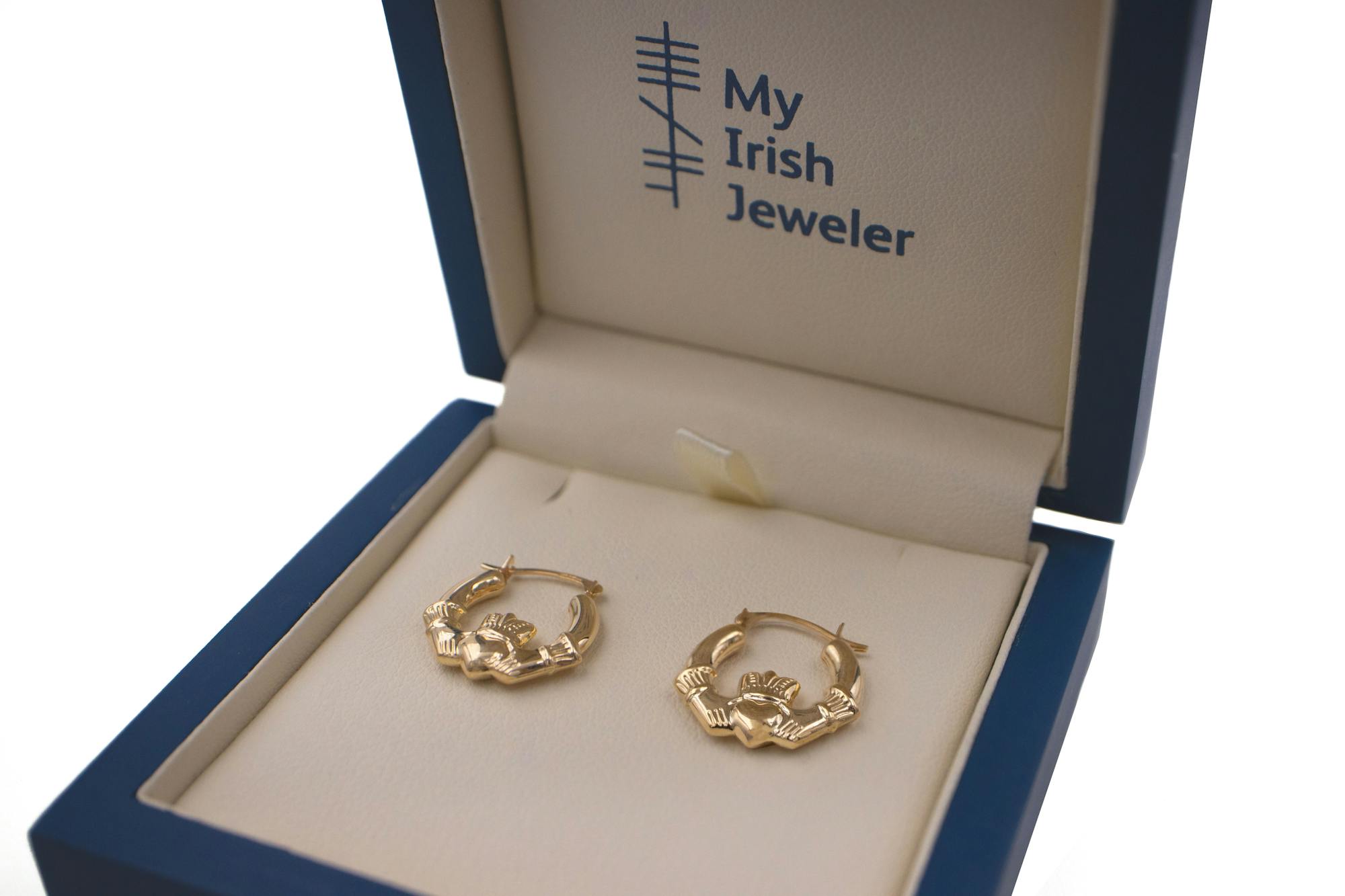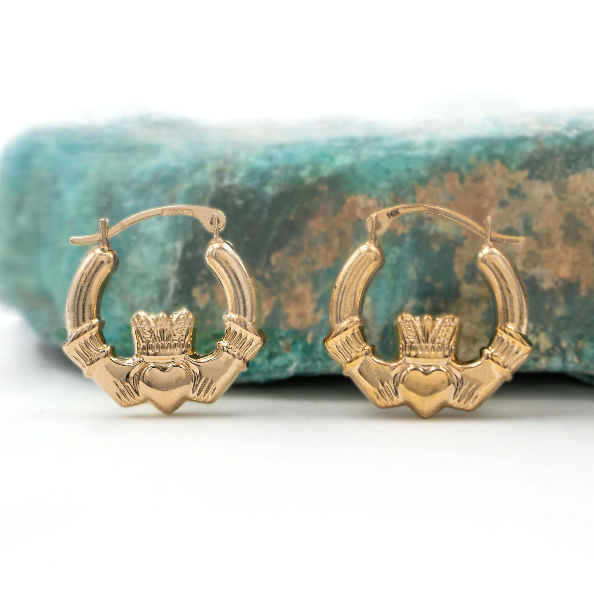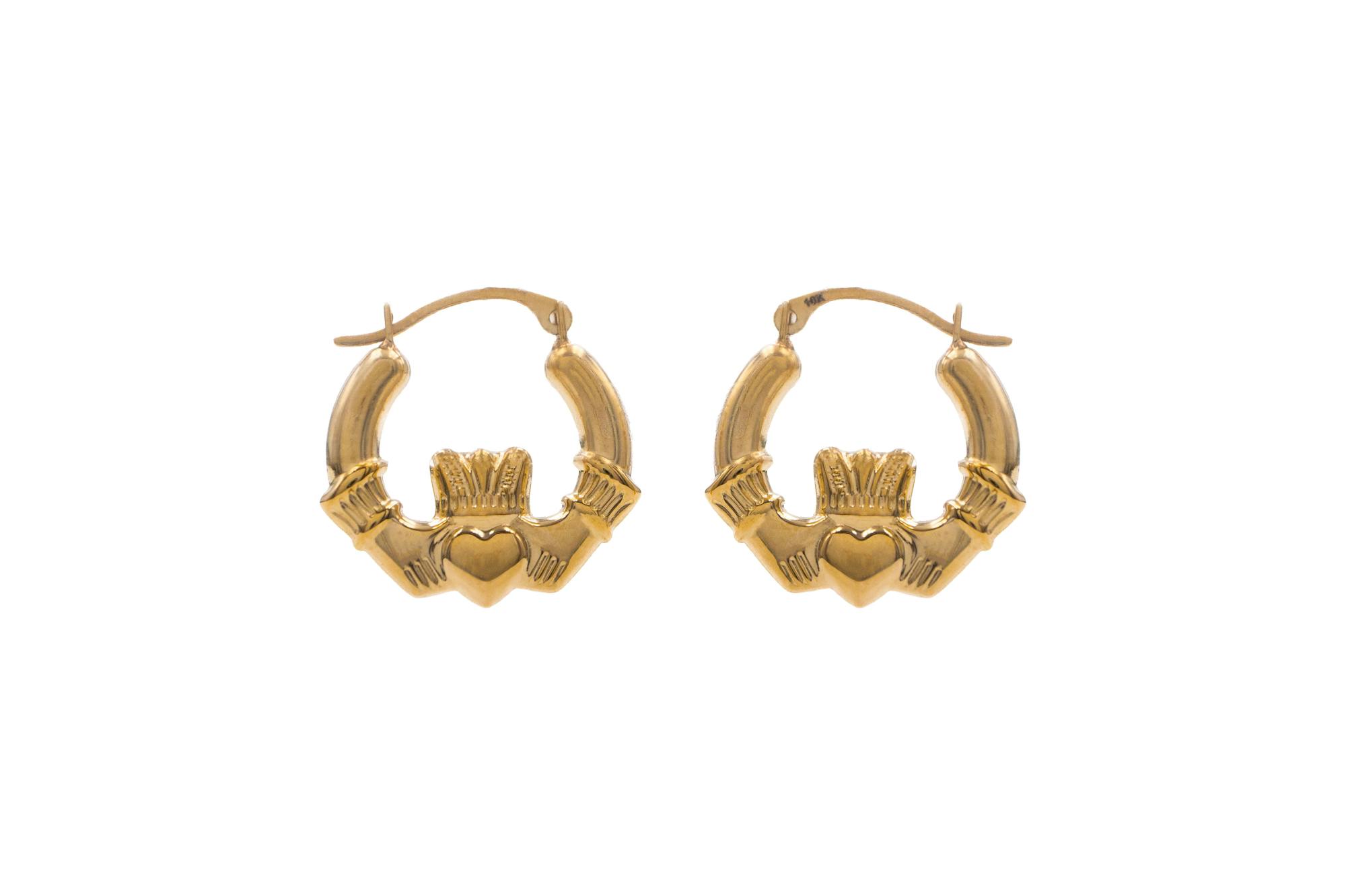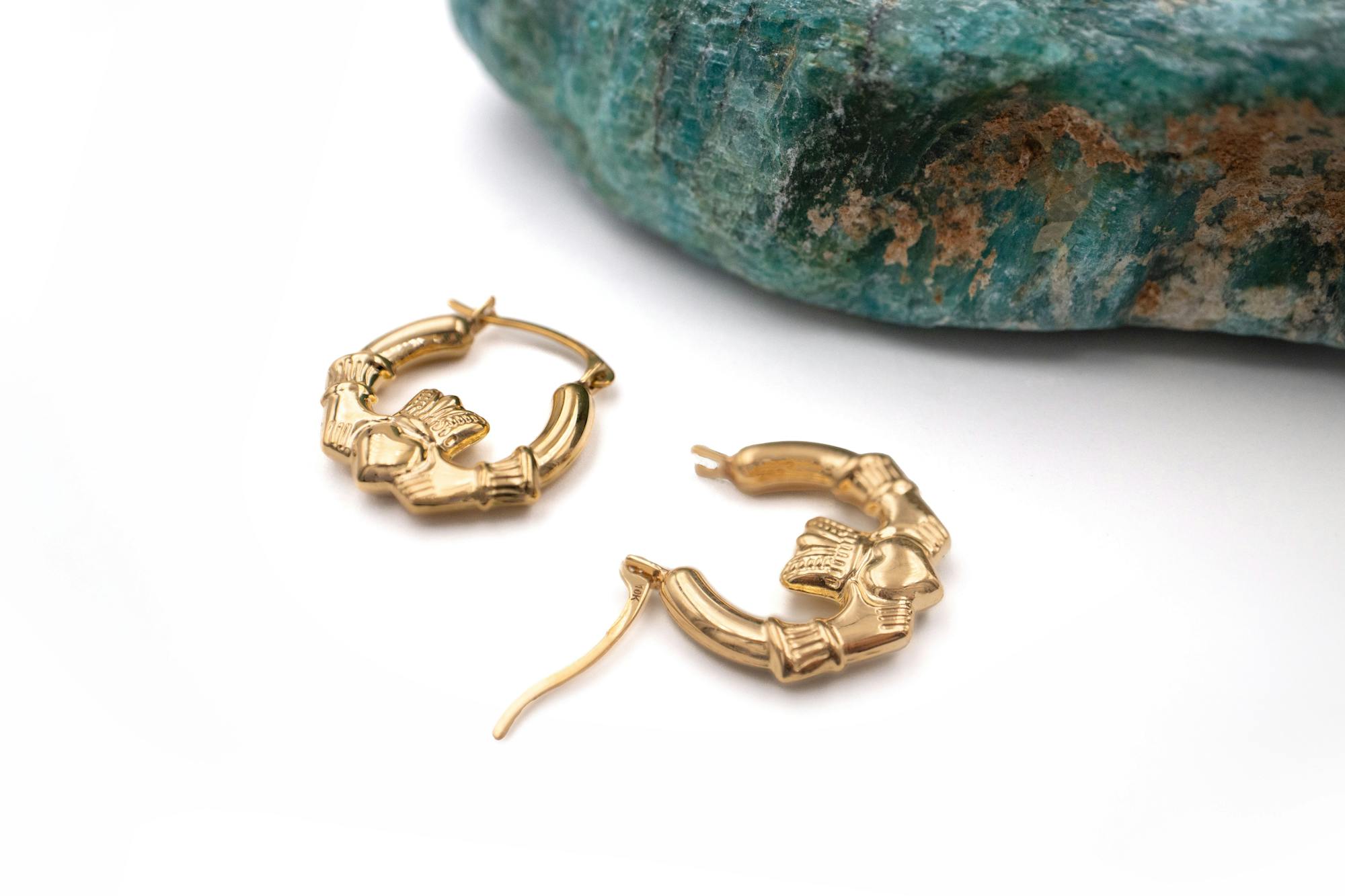These gold hoop earrings feature the iconic Irish Claddagh - a symbol of love, loyalty, and friendship with a history that stretches back over 400 years to Ireland's wild Atlantic coast.