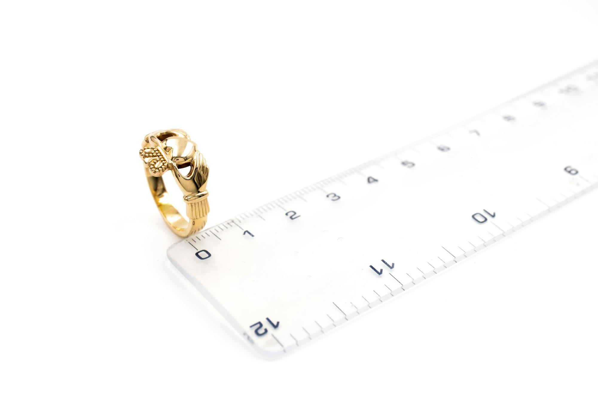 The measurement from the tip of the crown to the bottom of the heart for this Claddagh ring is 10.0 mm. The width of the band is 2.0 mm. |