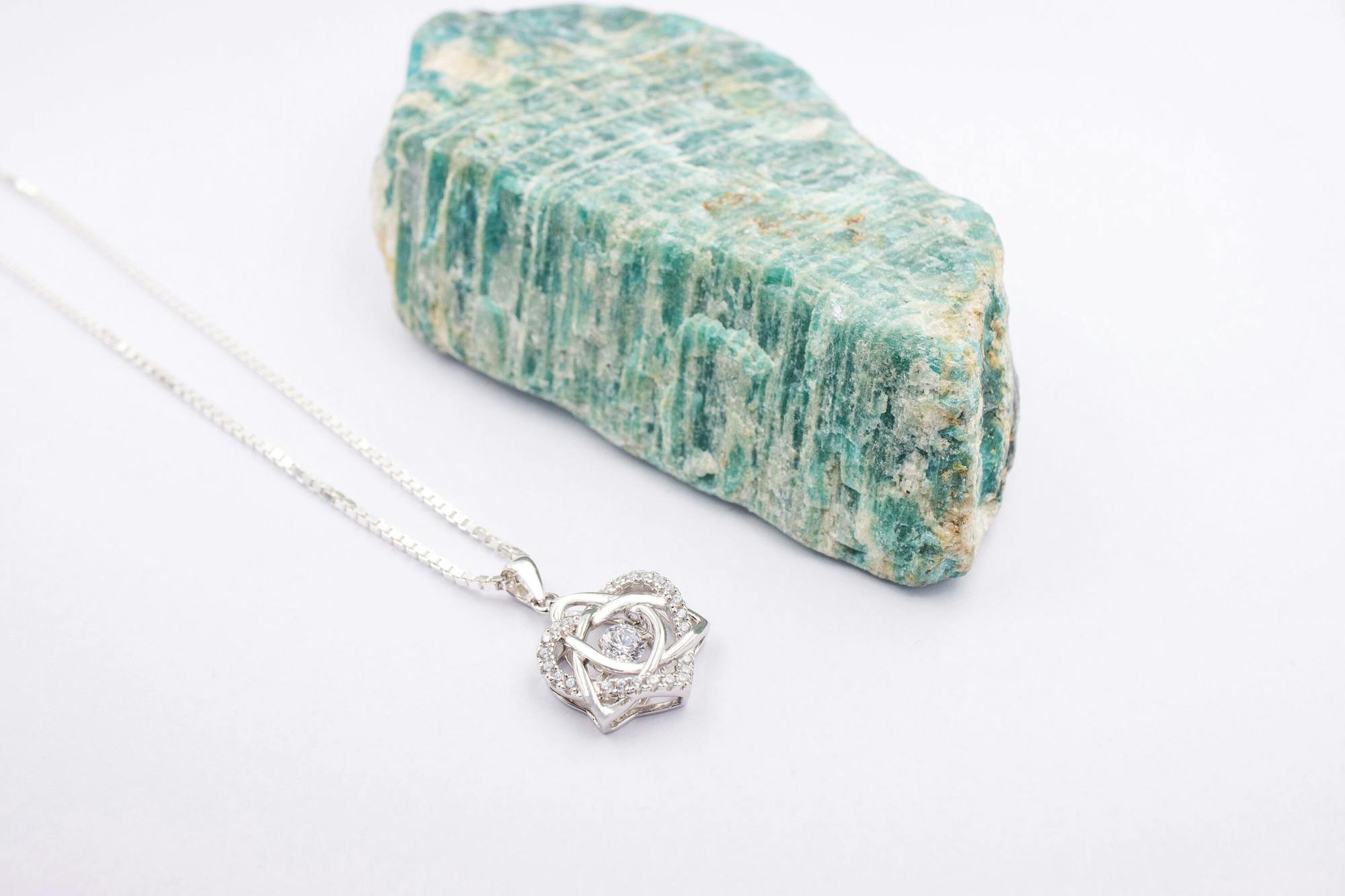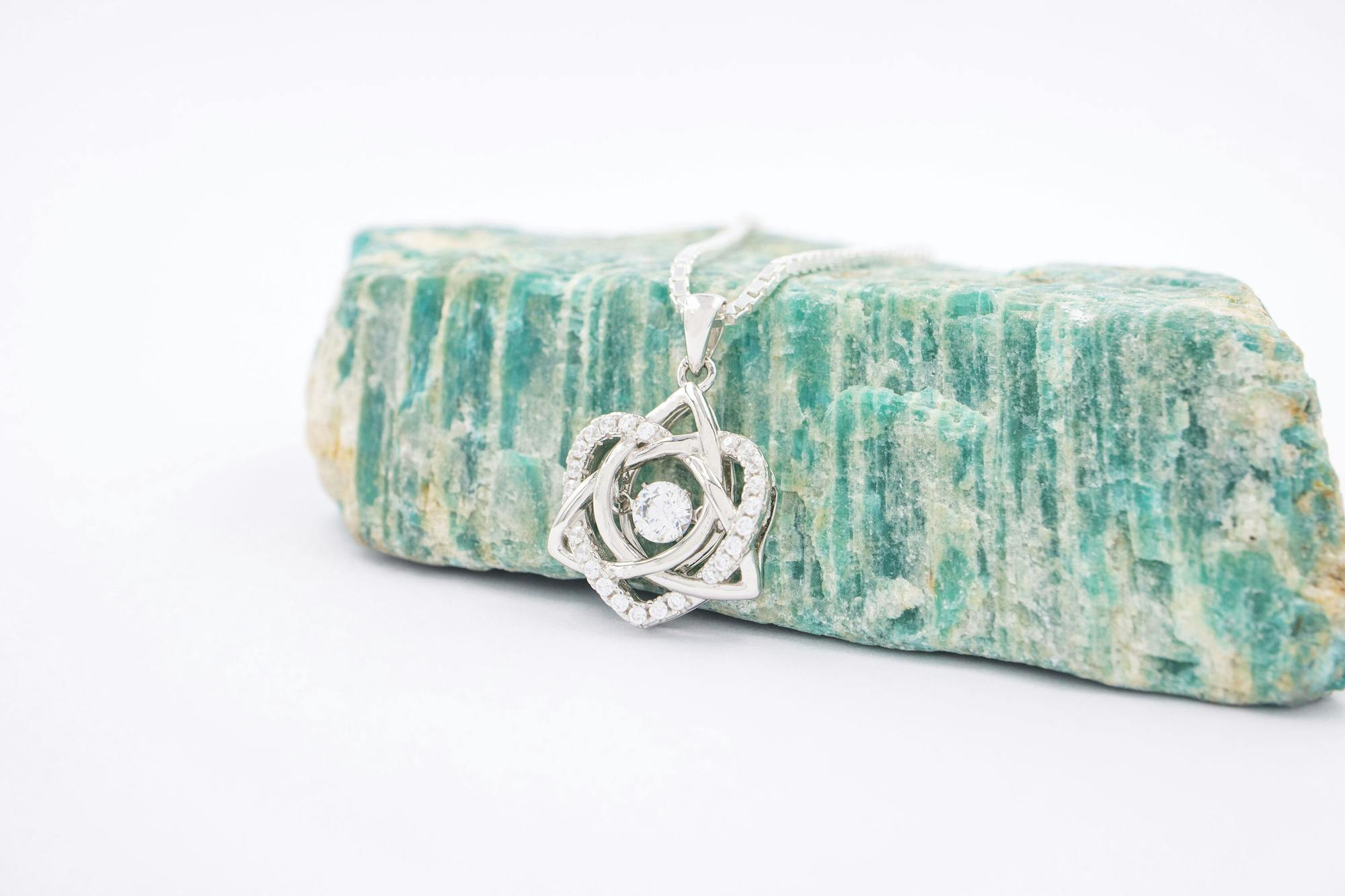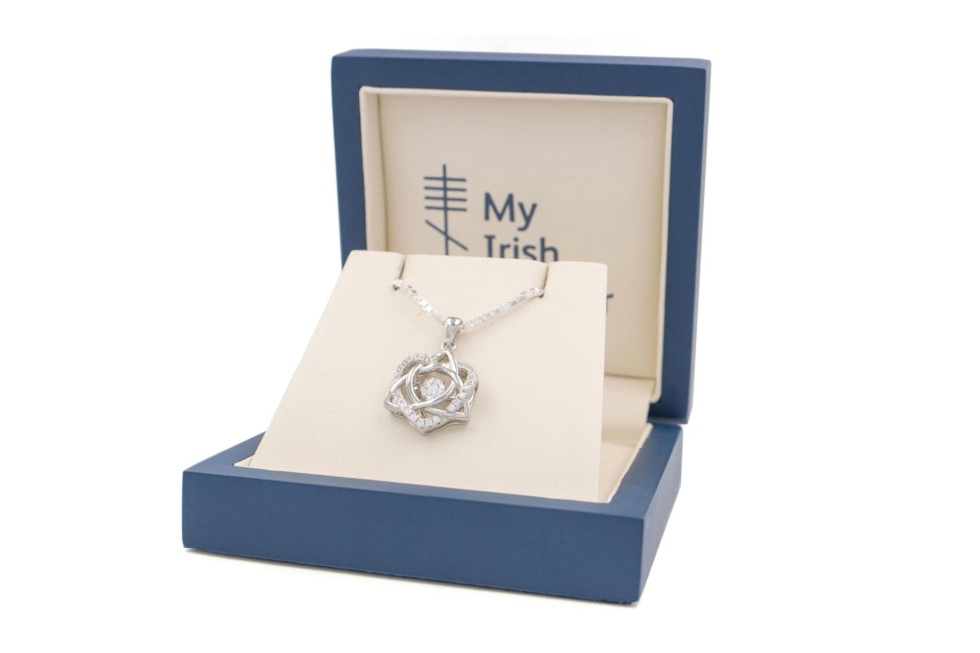 This sparkling, "dancing" stone is encircled by an elegant Trinity Knot which is itself entwined with a heart studded with sparkling pave CZ stones. Representing eternity and eternal love, this dazzling Celtic Lovers knot is a romantic necklace to gift and to wear.