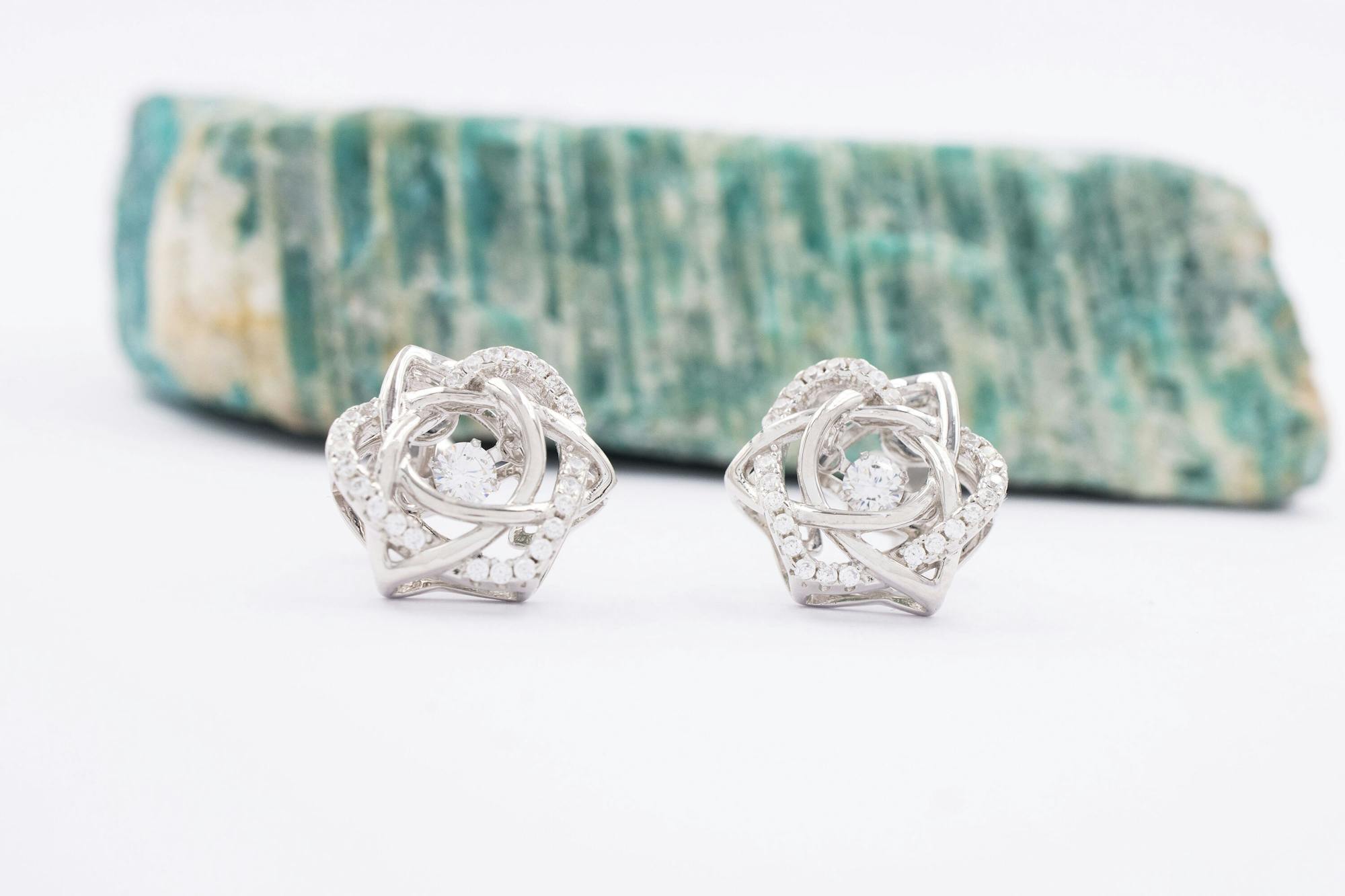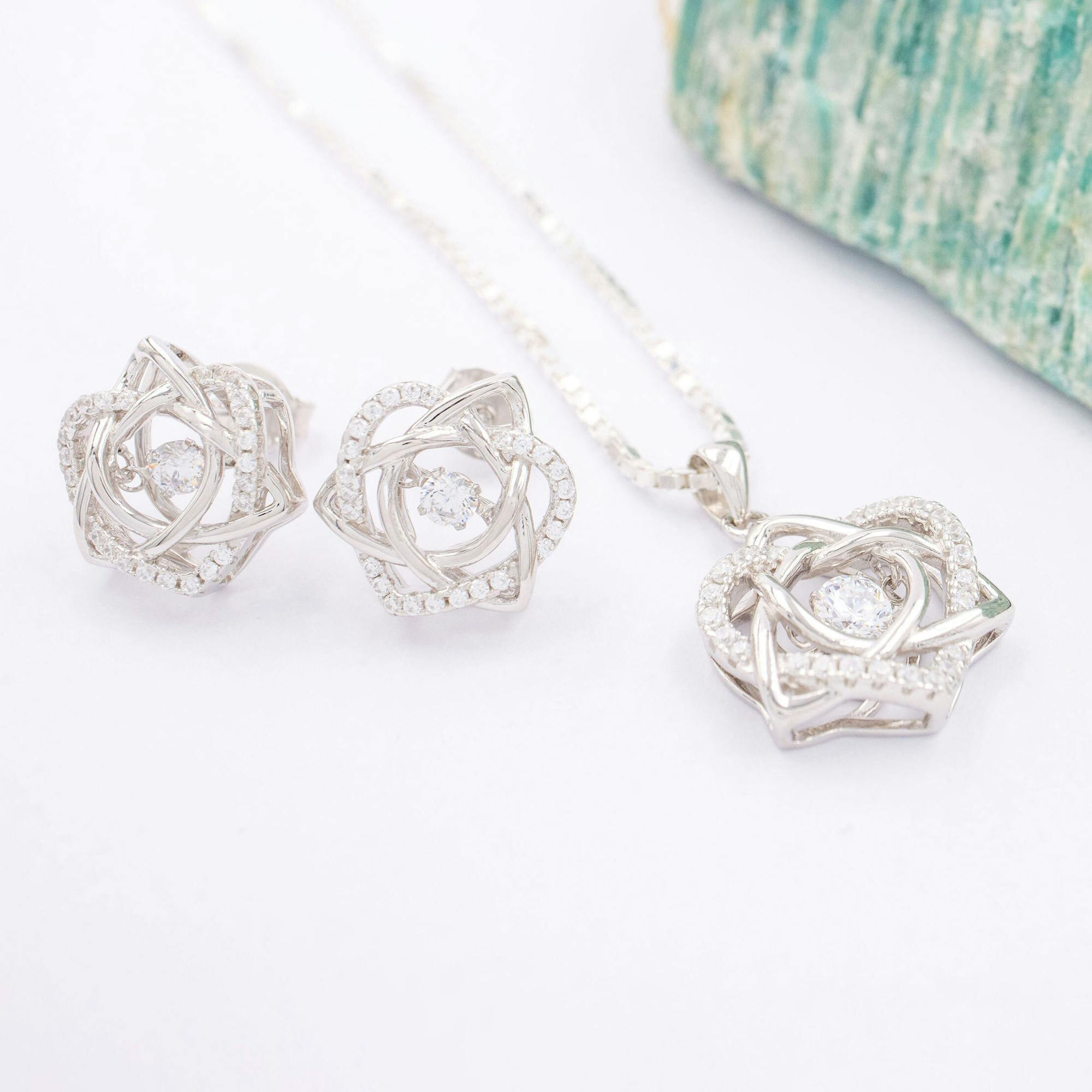 The focal point of this gorgeous sterling silver trinity knot necklace and earring gift set is the sparkling cubic zirconia that sits suspended at its center. Using a subtle and artful four-prong setting, this stone moves as if by magic - dancing to your rhythm when worn.
