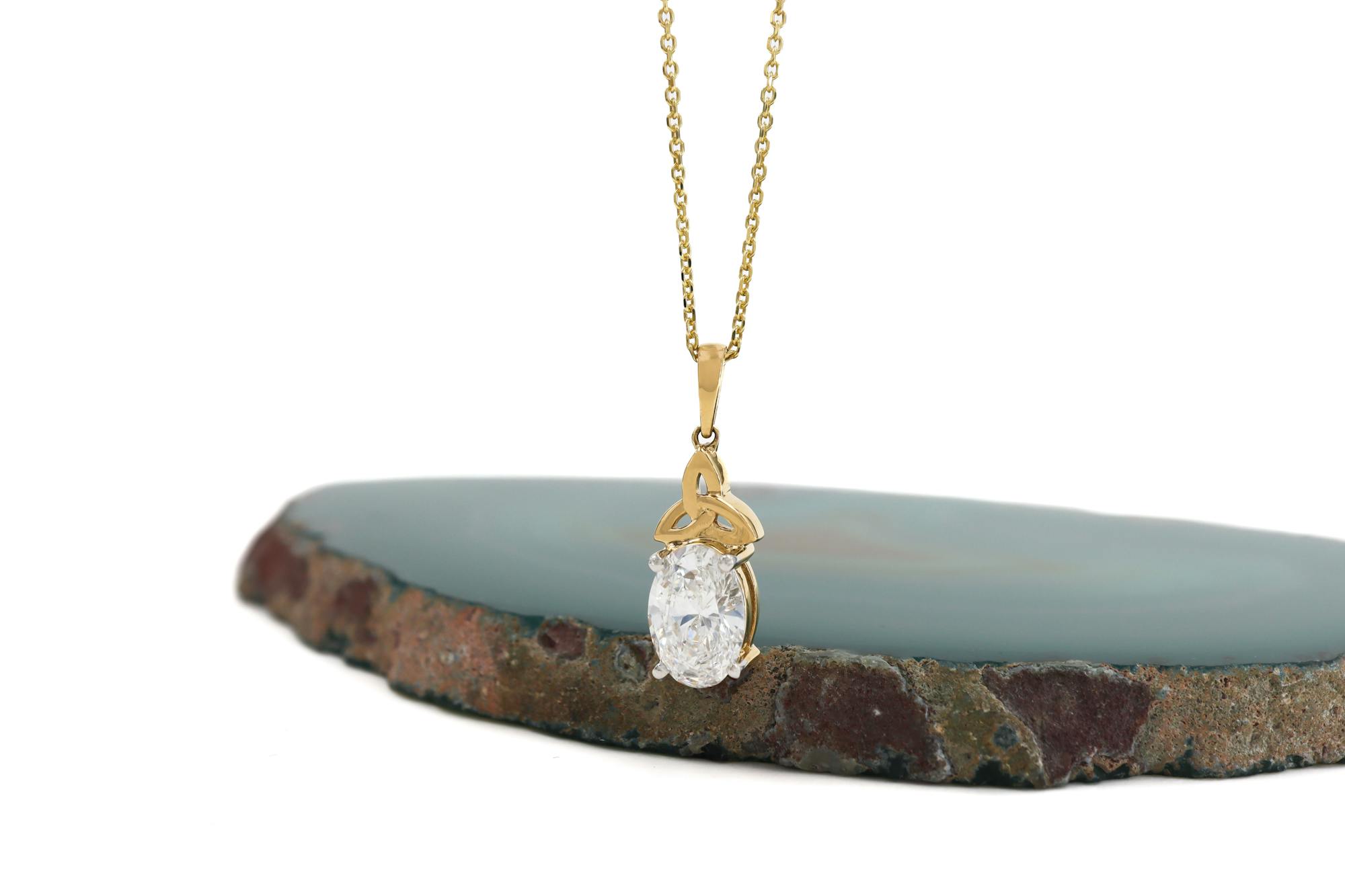 The F/G color, VS grade, IGI certified lab diamonds sit beautifully on secure, solid gold, prong settings. Crafted in solid 14K yellow gold, each pieces is hallmarked at Dublin castle assuring quality.