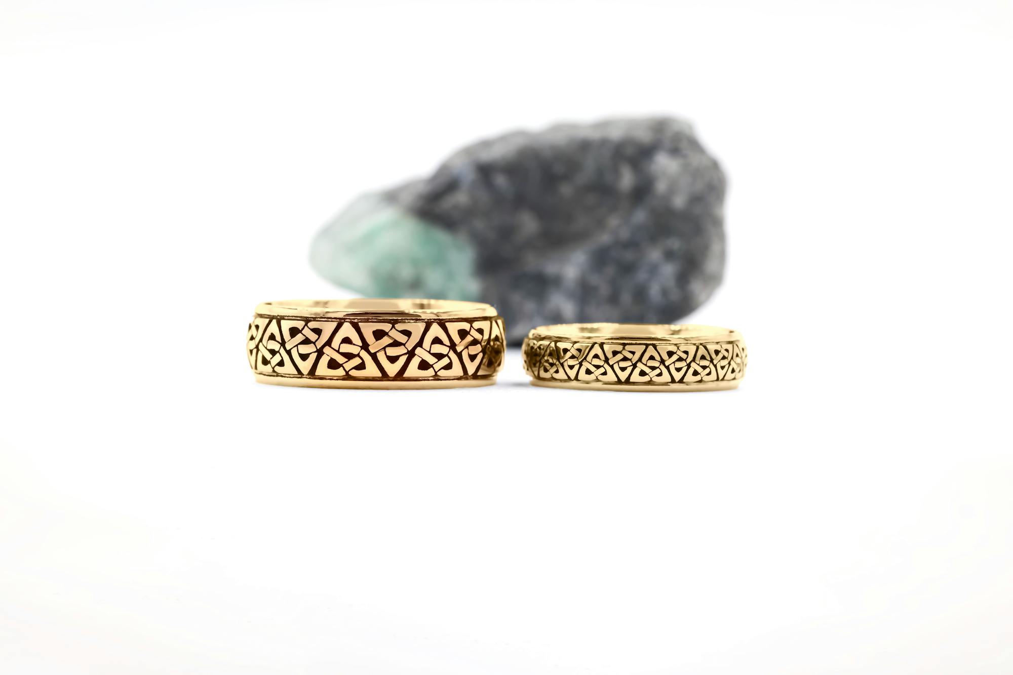 With a repeating motif around the entire band, this ring is expertly made and crafted to the highest standard. The Trinity Knots are crisp and eye catching against a dark, antique style finish. With a comfort fit, this ring has style and substance with a beautiful weight and feel on the hand. With a choice of metals and band width, it is the perfect unisex rings, ideal for couples looking for matching bands.