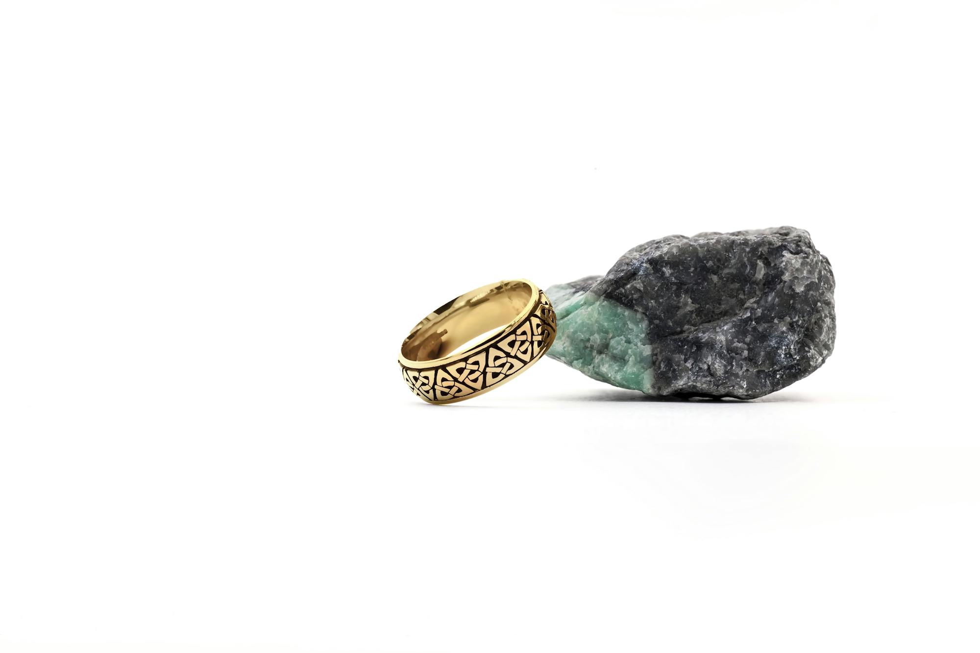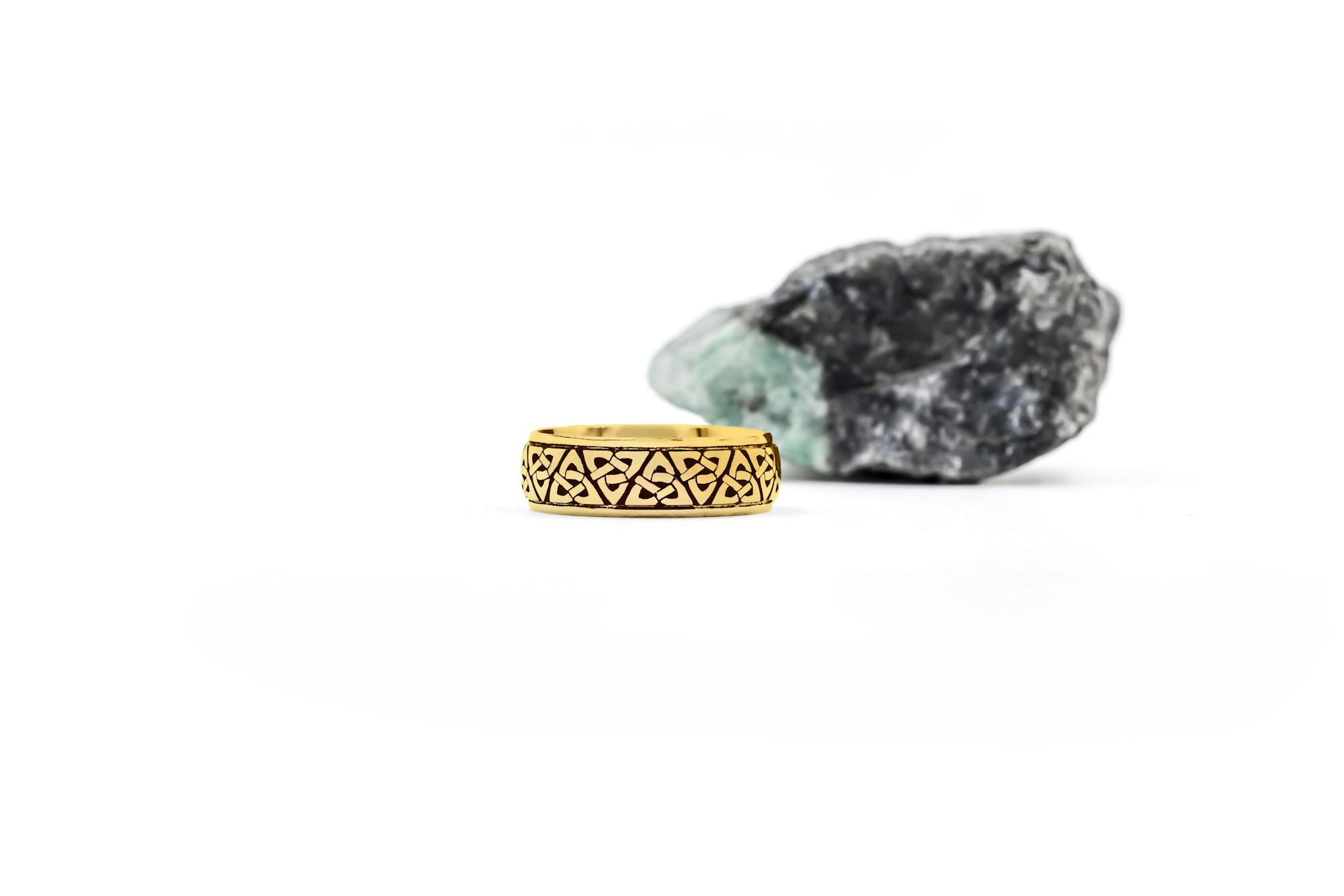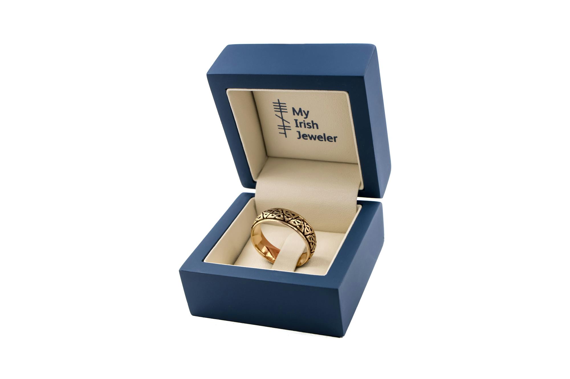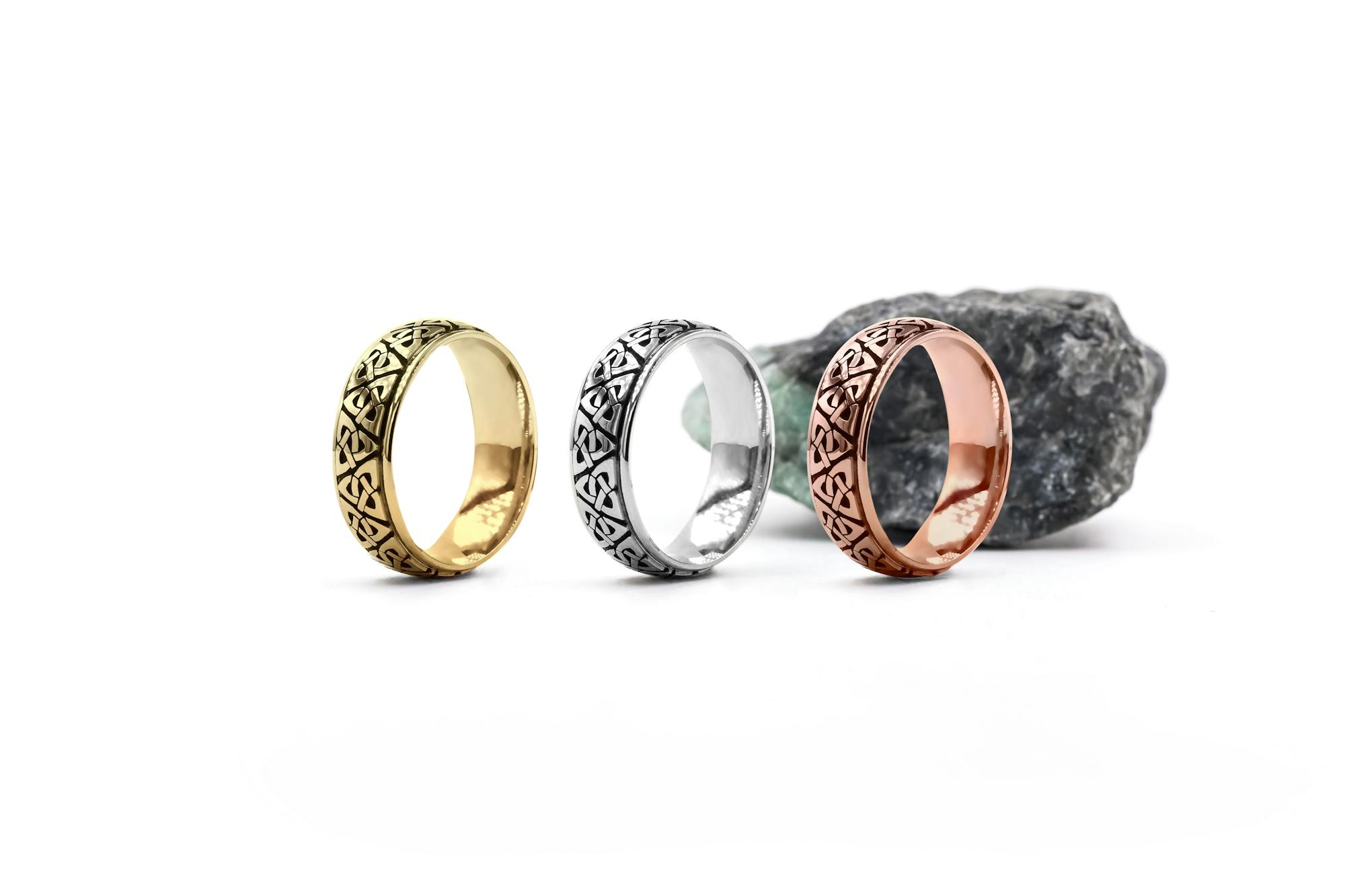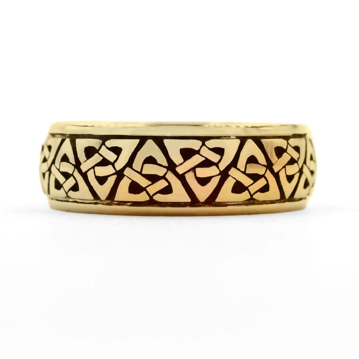With a repeating motif around the entire band, this ring is expertly made and crafted to the highest standard. The Trinity Knots are crisp and eye catching against a dark, antique style finish. With a comfort fit, this ring has style and substance with a beautiful weight and feel on the hand. With a choice of metals and band width, it is the perfect unisex rings, ideal for couples looking for matching bands.
