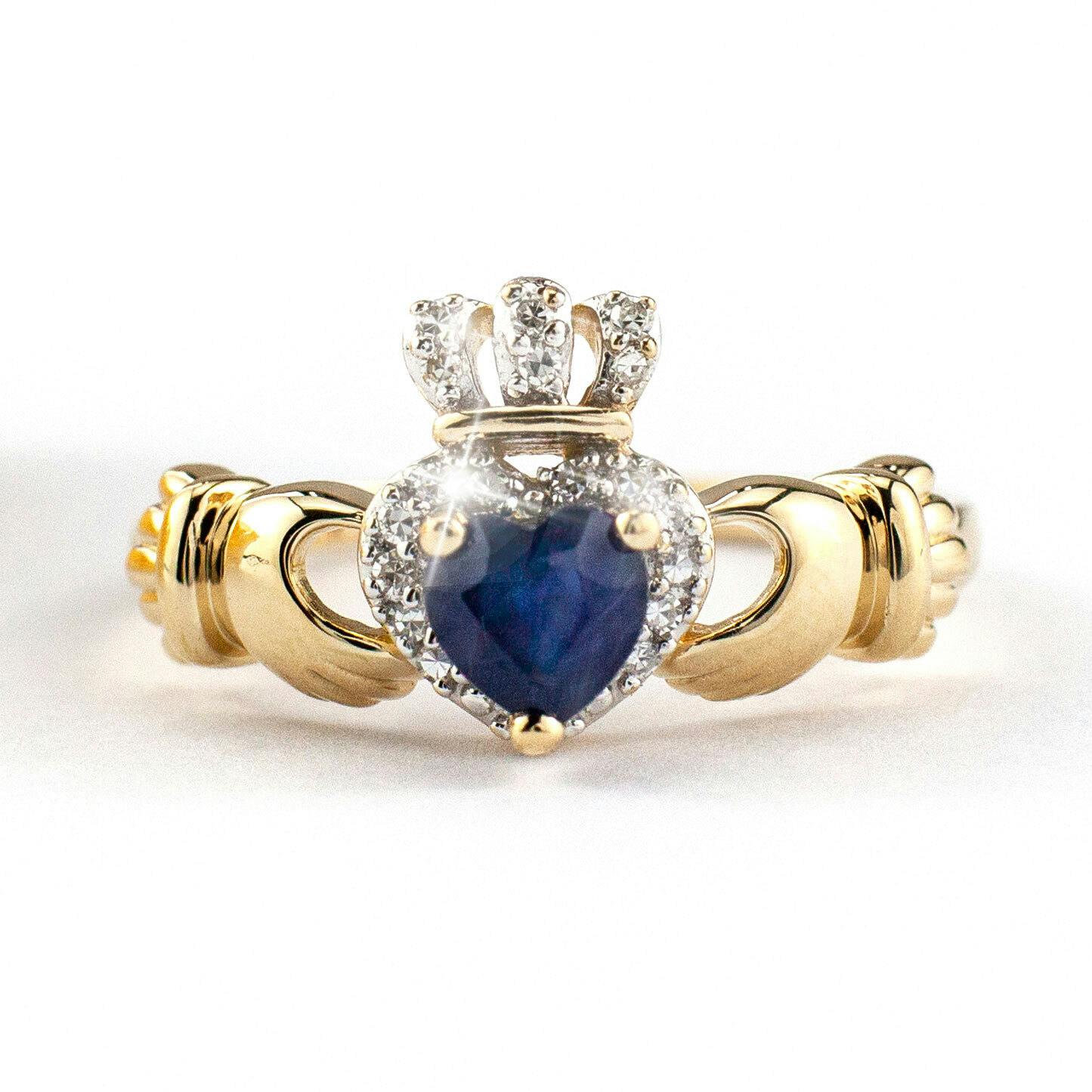 Crafted from solid 14K yellow gold, the design honors the Claddagh's rich symbolism of love, friendship, and loyalty. The central stone is clasped by two hands and surmounted by a crown, itself encircled by a halo of genuine diamonds that illuminate the piece with their brilliance. The gold band's robust construction ensures longevity, making this ring not just a piece of jewelry but a lasting connection to Irish heritage. It is an authentic heirloom that celebrates both the cultural significance and the skilled craftsmanship of Ireland.