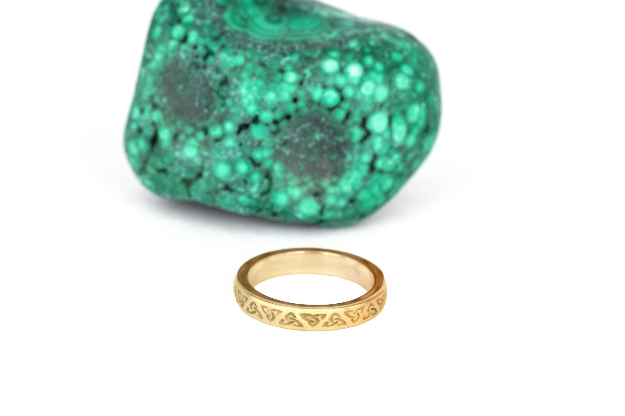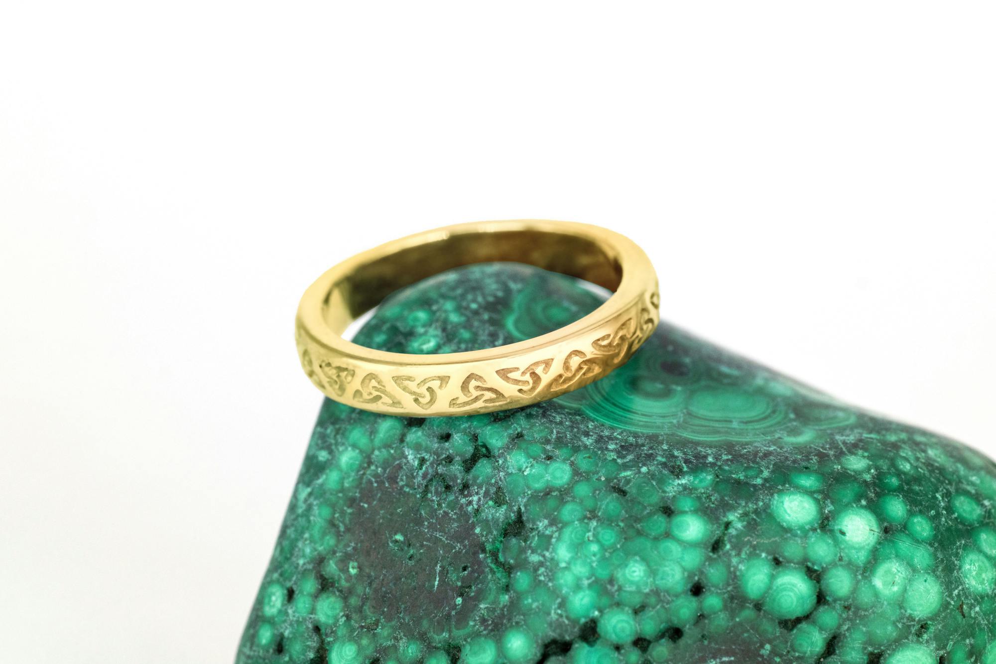 This ring features engraved Trinity Knots that wrap around the entire band. The design is beautifully offset by the 'Satin' area behind the knots. The Trinity Knot is a traditional Celtic motif that signify's eternity.