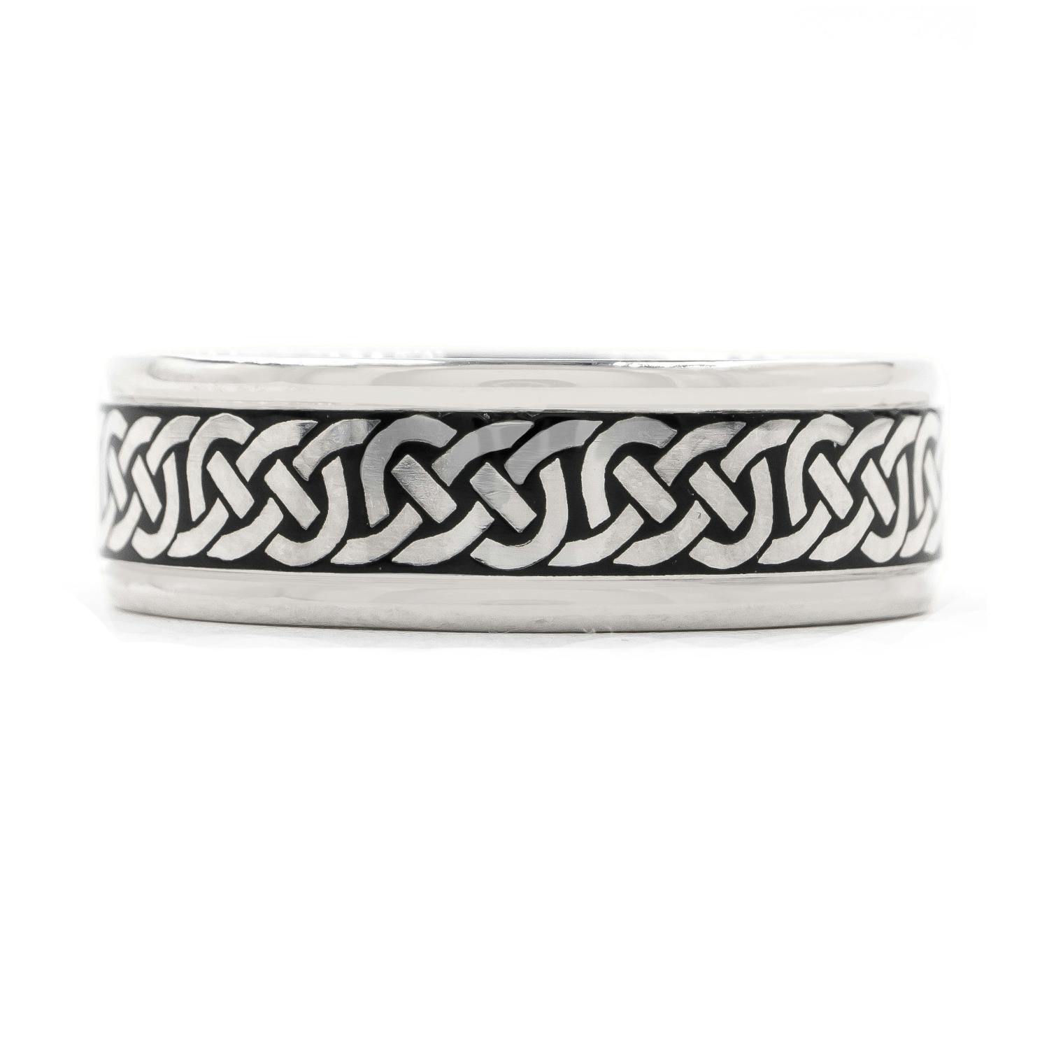 This beautifully designed ring set features an unbroken Celtic Knot pattern around the entire band. Representing 'Eternity' the knot has no beginning and no end. The intricate knot design stands out against the antique or "oxidized" background. These rings have a beautiful weight and 'feel' with a domed 'comfort fit' to ensure you will never want to take them off!