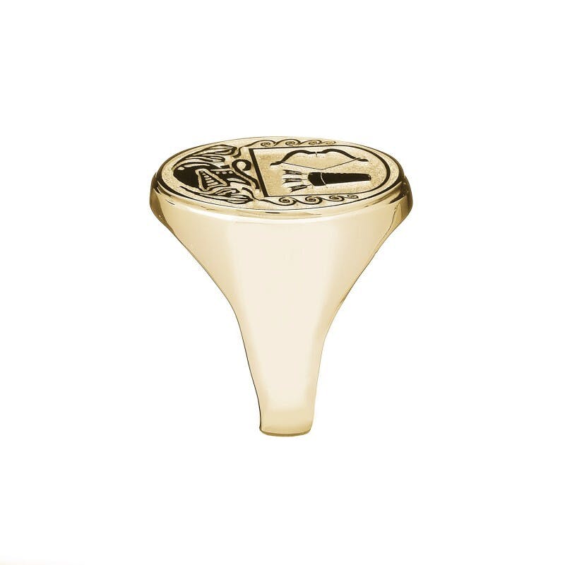 This striking ring features your family coat of arms embossed on a sandblasted crest. Contact us to confirm your own arms for your selected surname.