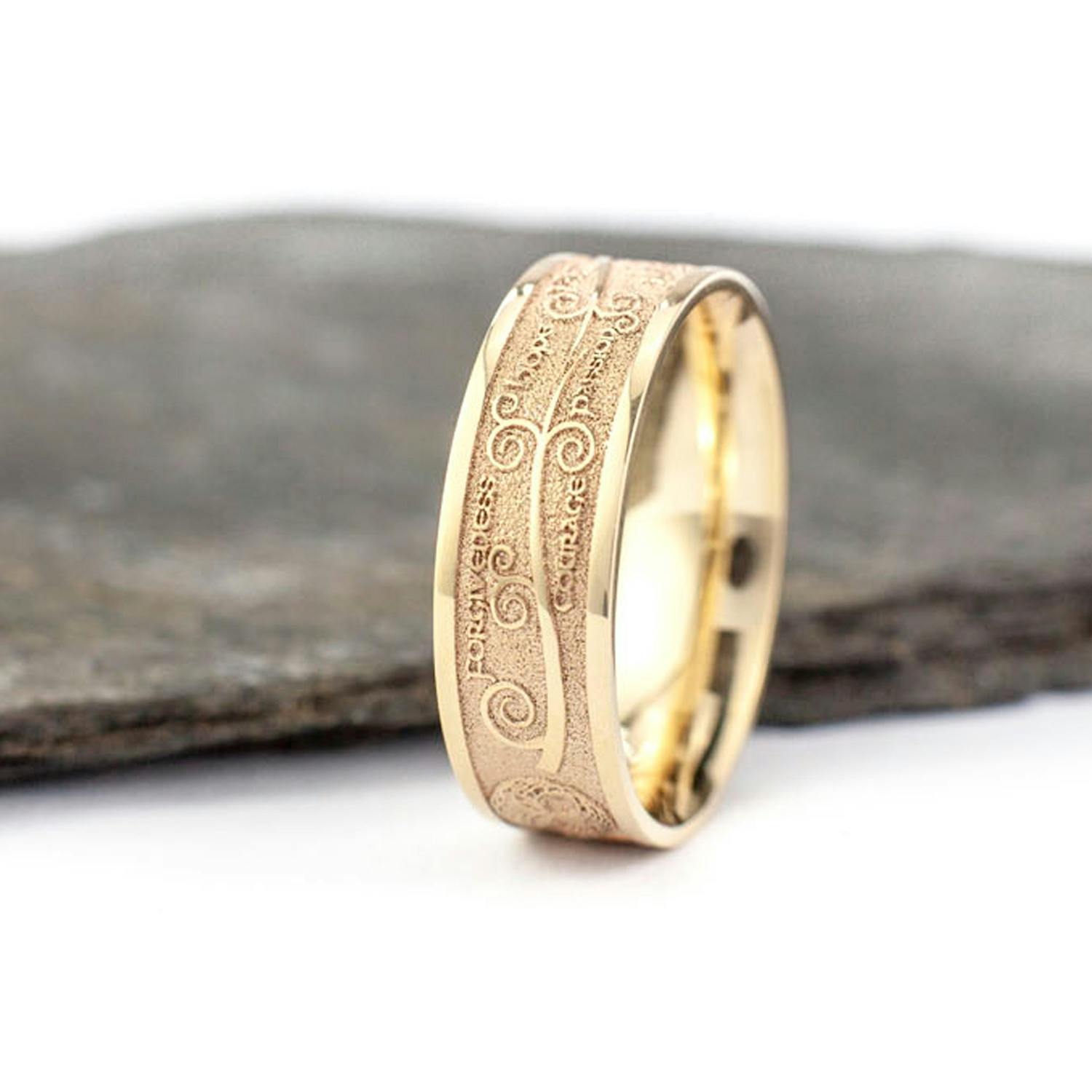 The use of different textures is very evident in the making of this ring, the area behind the wording has a sandblast finish which gives a 'grainy' appearance creating lots of shadow and light to highlight and accentuate the meaningful words