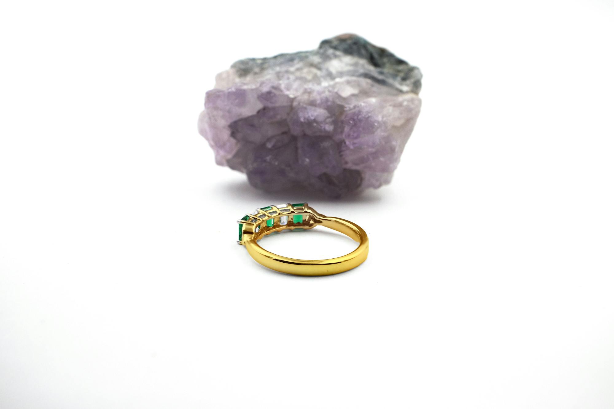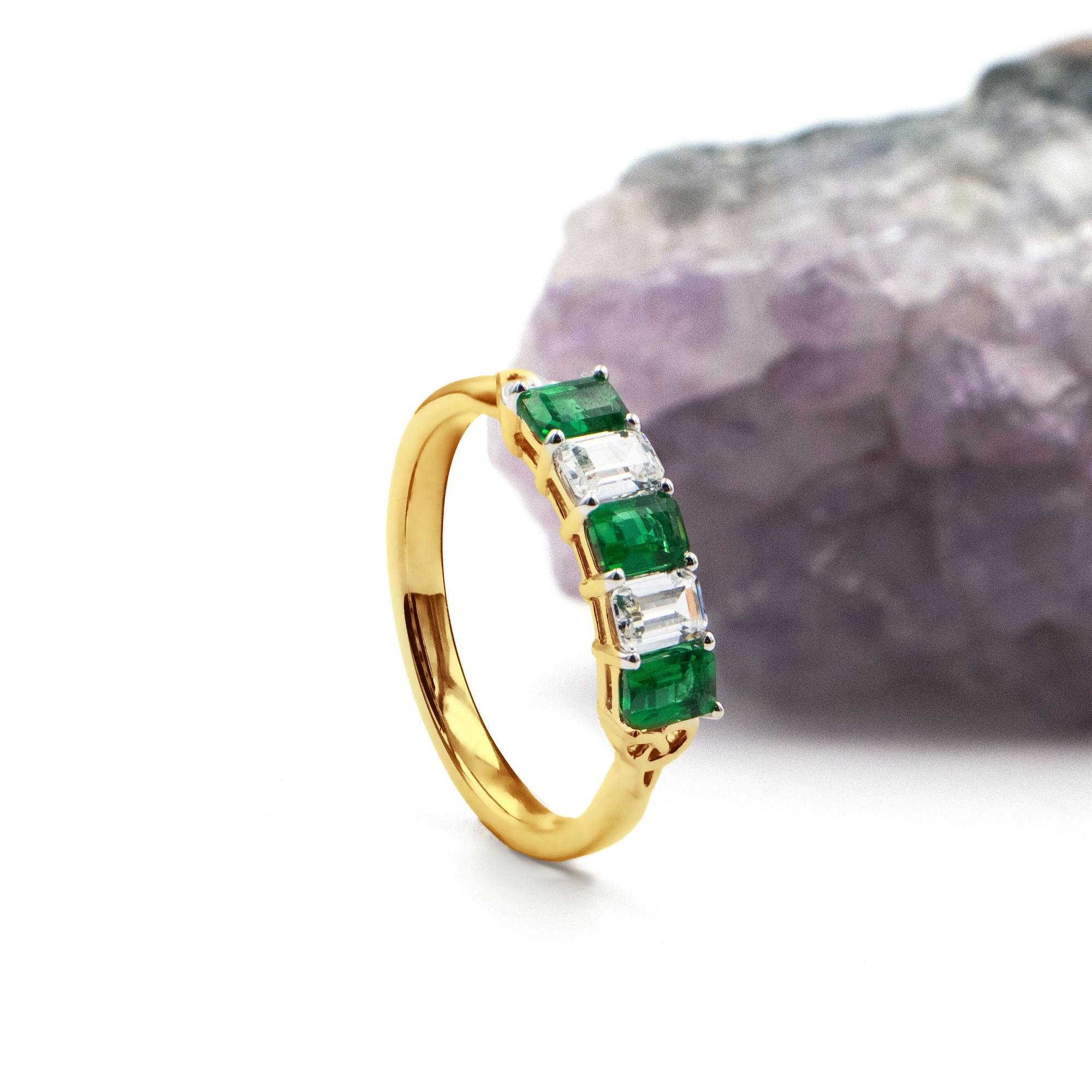 Three vibrant emerald cut stones provide a striking contrast against the warm glow of yellow gold, while two sparkling emerald cut diamonds add a touch of tasteful brilliance — creating a ring that’s truly unforgettable.