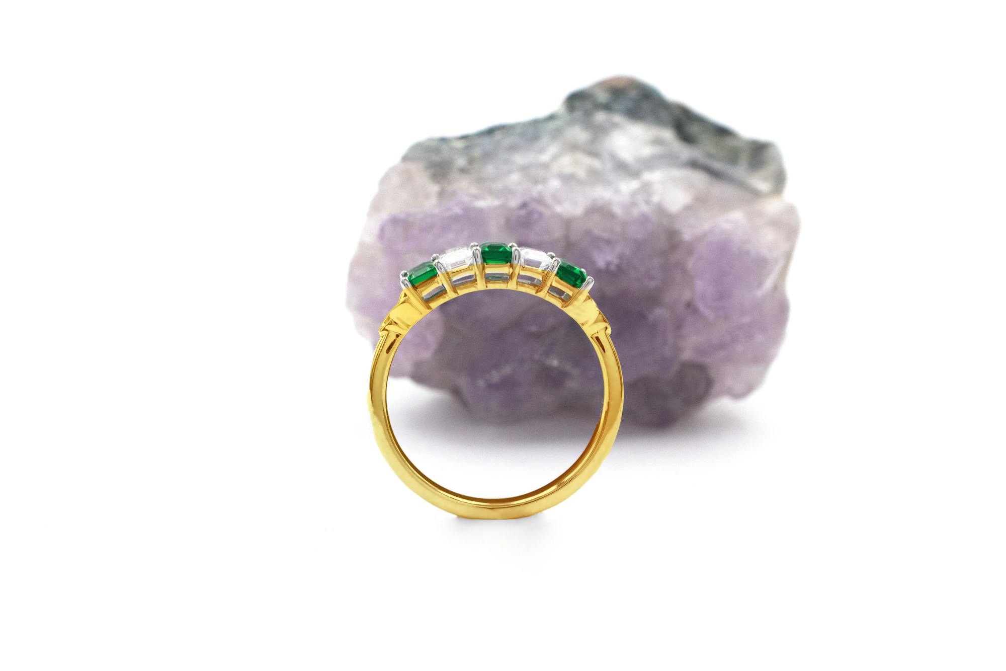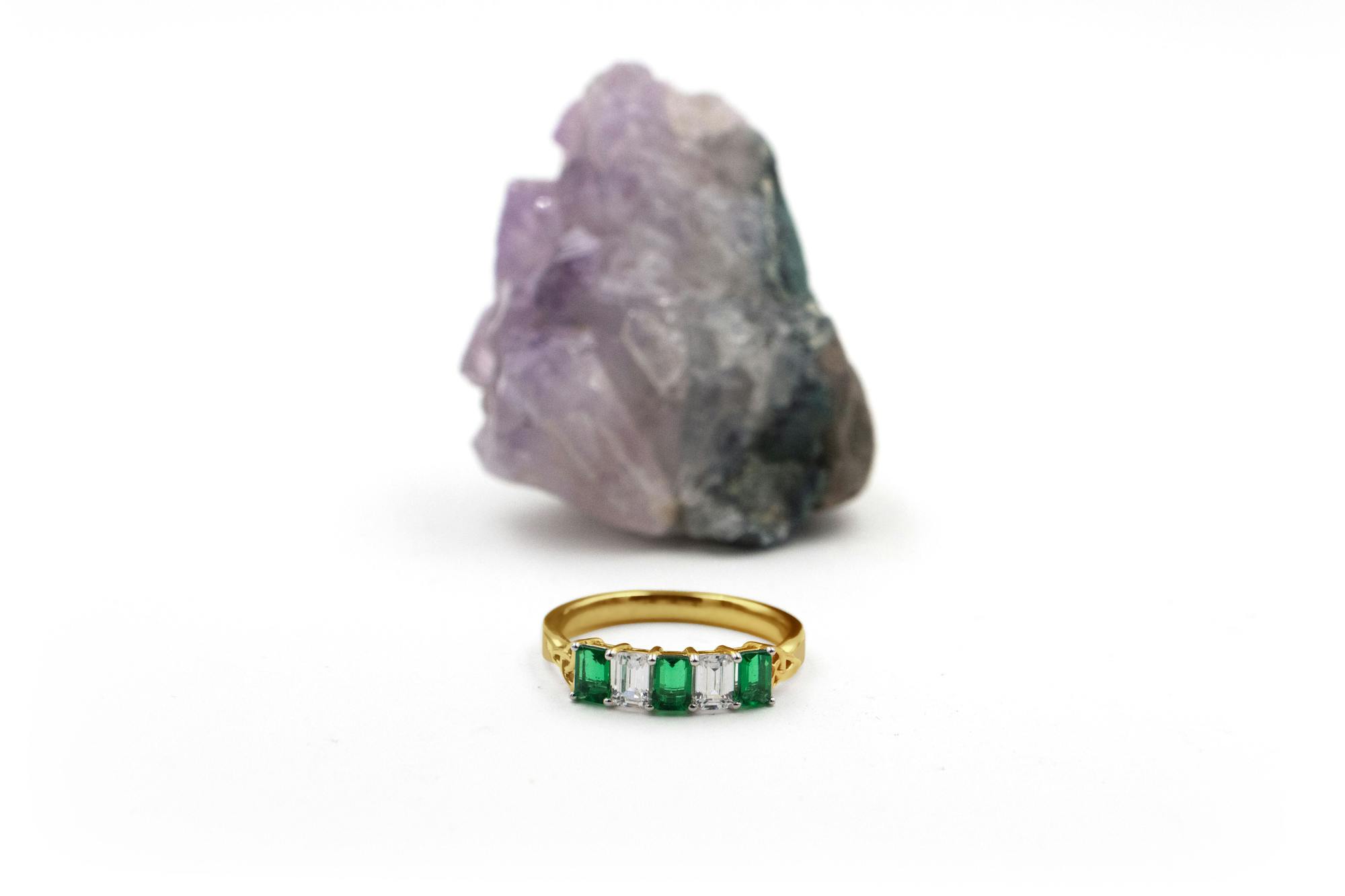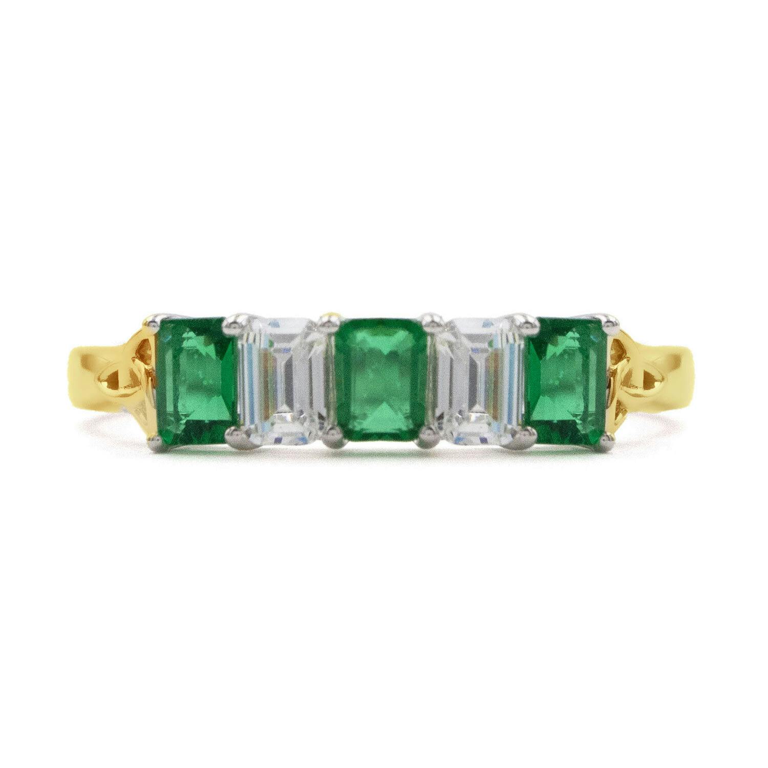 The 0.5 TCW ring is set with two 0.10ct G/H SI emerald cut diamonds and three 3 mm diameter emeralds.