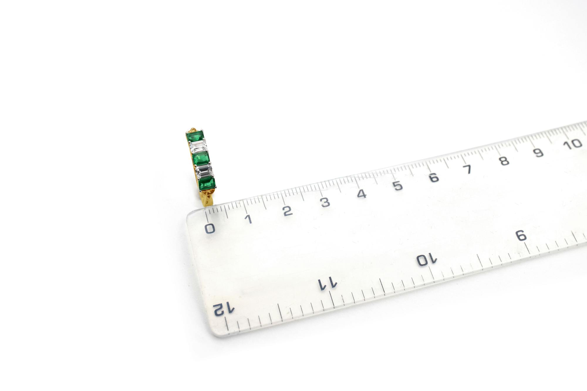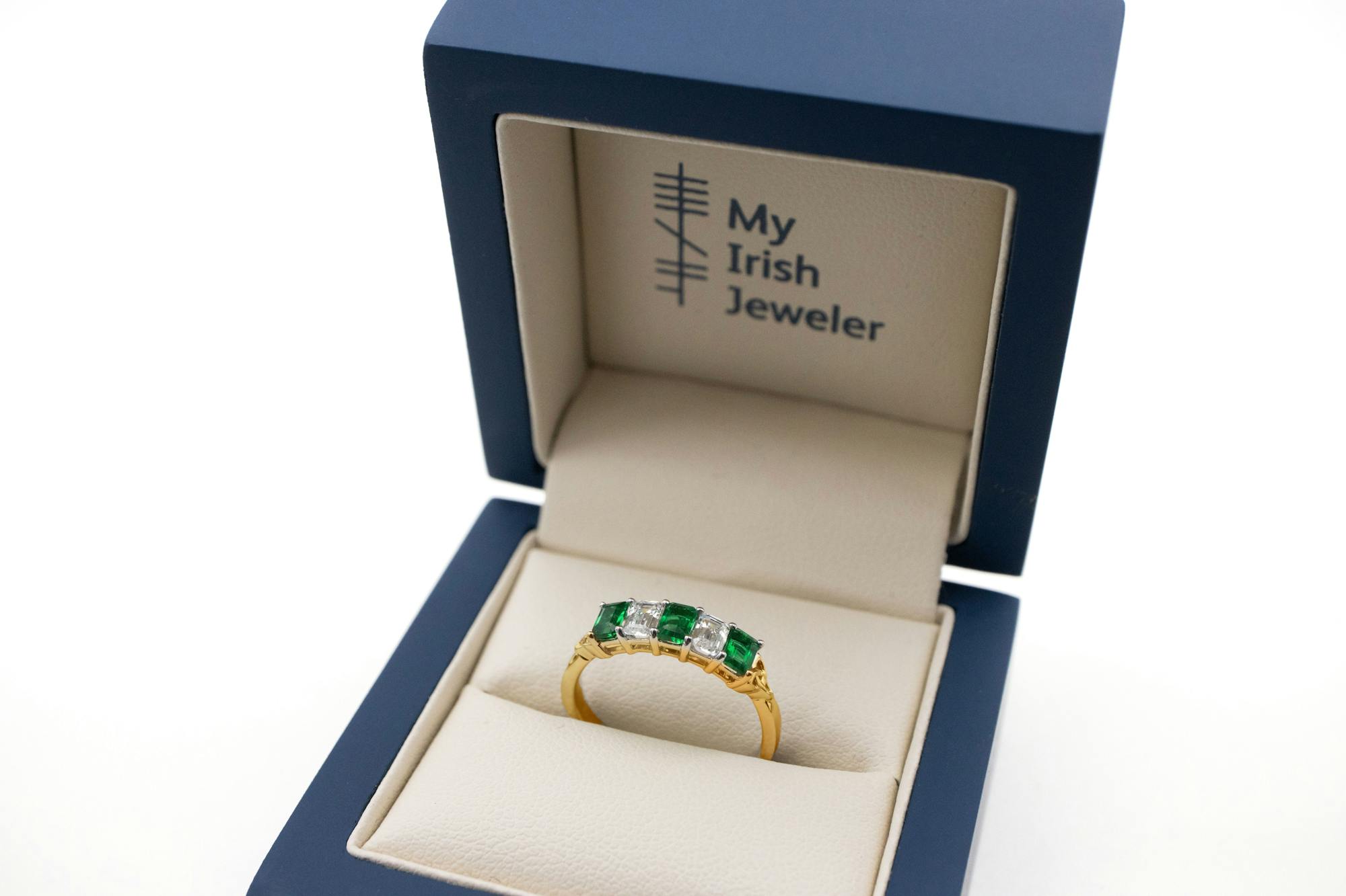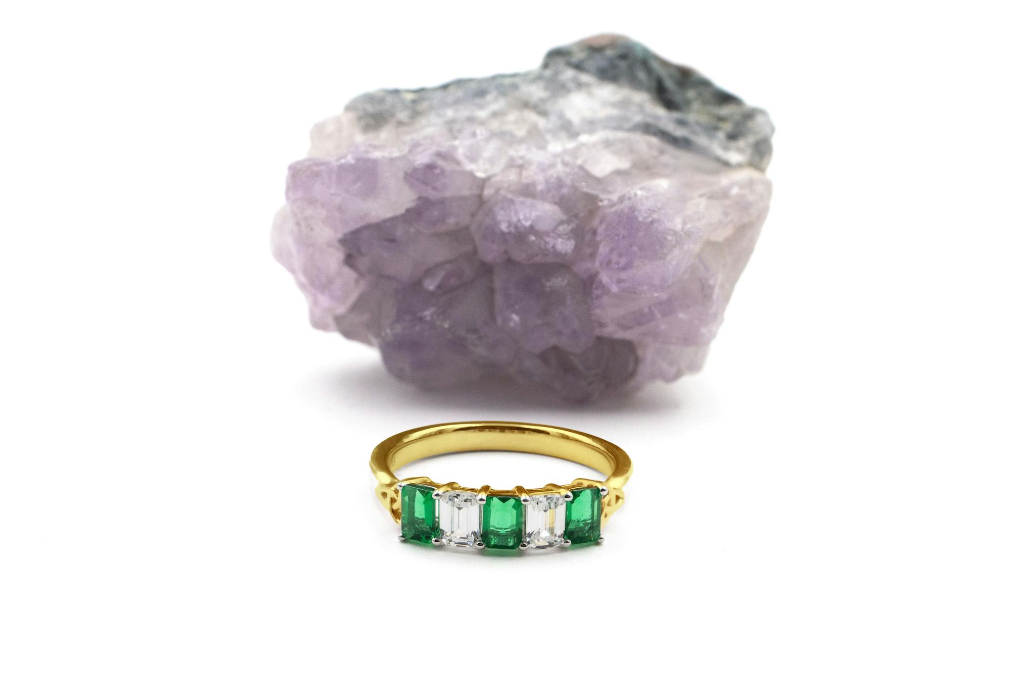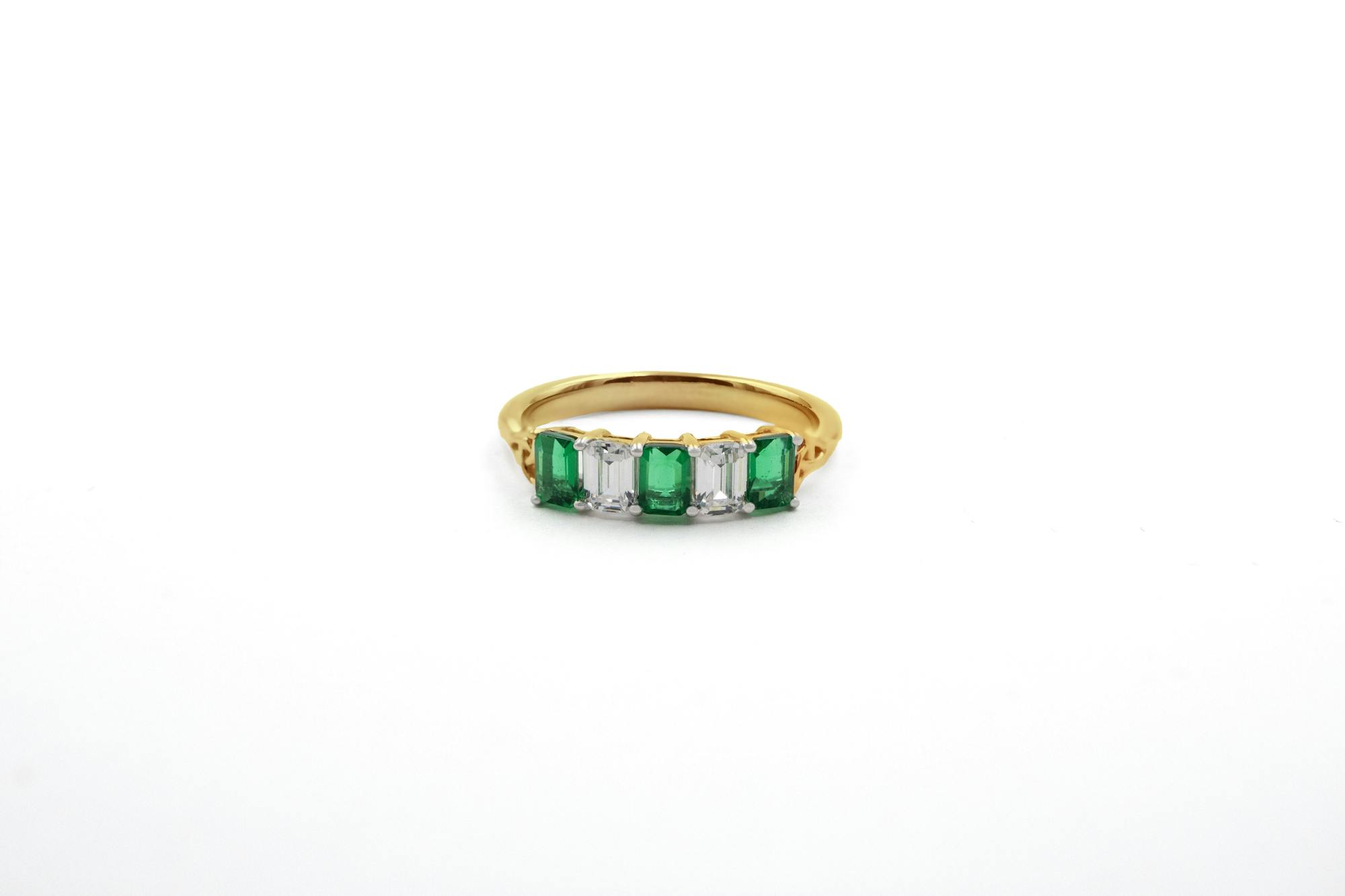 The 0.5 TCW ring is set with two 0.10ct G/H SI emerald cut diamonds and three 3 mm diameter emeralds.