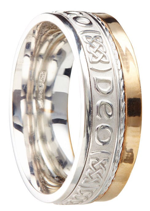 This beautifully made ring features the gaelic inscription "Grá Go Deo", which means "Love Forever". A celtic knot symbol features between each of the words. The area behind the words has been darkened using a combination of black enamel and oxidization.