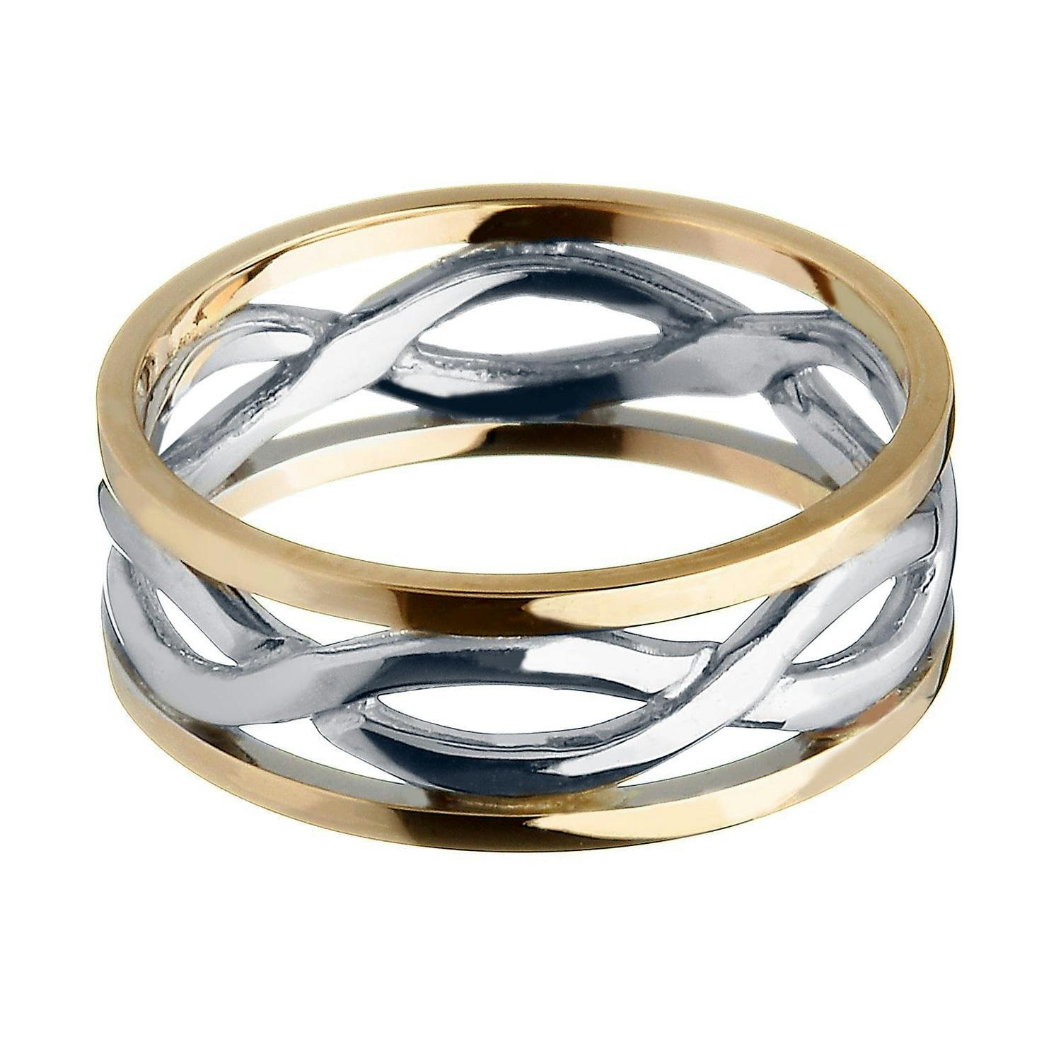 The cut out or pierced pattern allows light to filter through and is extremely flattering on the hand. Combine yellow and white gold for a delightful and dramatic effect. The contrast is so elegant and refined as the knot swirls around the band that has no beginning or end.