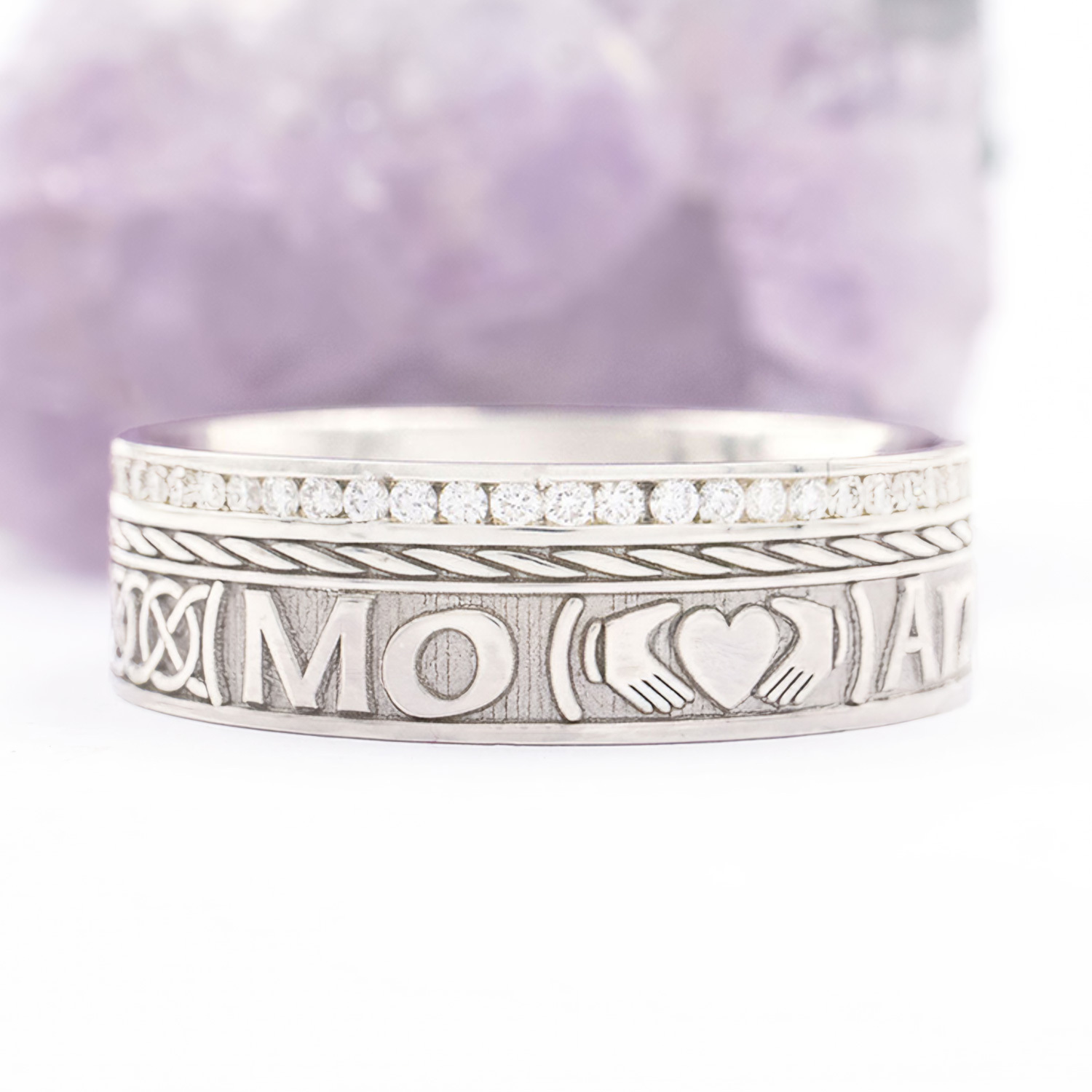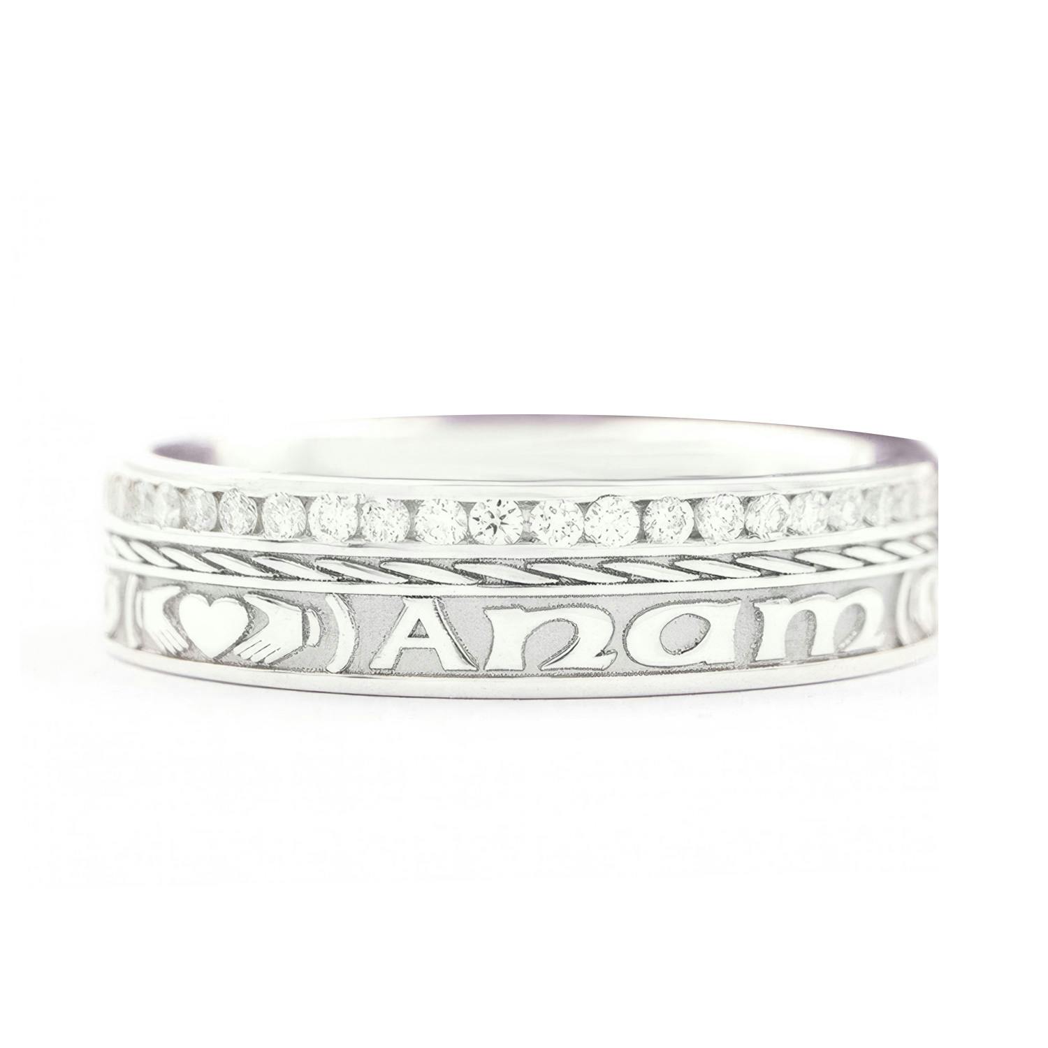 This lovely sentiment is enhanced by the heart and hands of the Claddagh that punctuates the script, representing love, loyalty, and friendship. And for a final flourish, a Celtic Knot encircles the back of the band, representing eternity and eternal love.