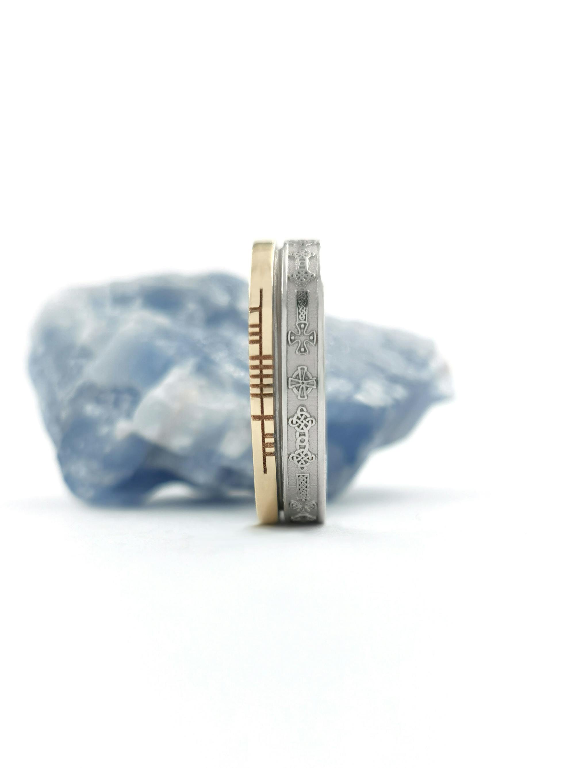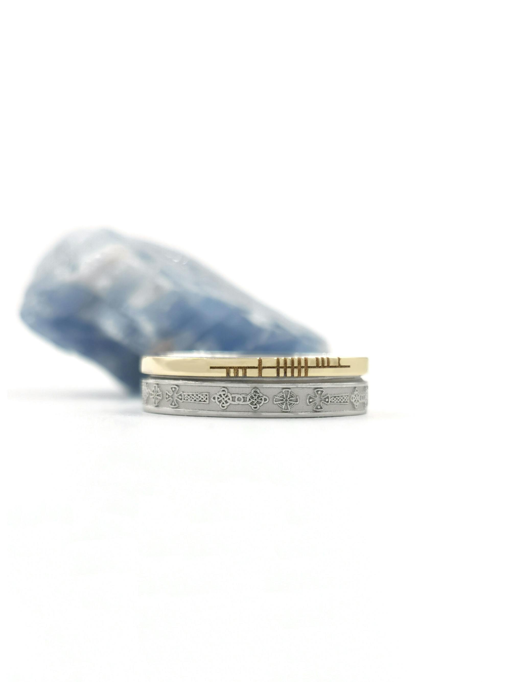 Continue a tradition of Ogham, the alphabet of ancient Ireland. In this handsome ring, a series of dashes cut across a central "stem" line, spells out the word 'faith' in this enigmatic script.