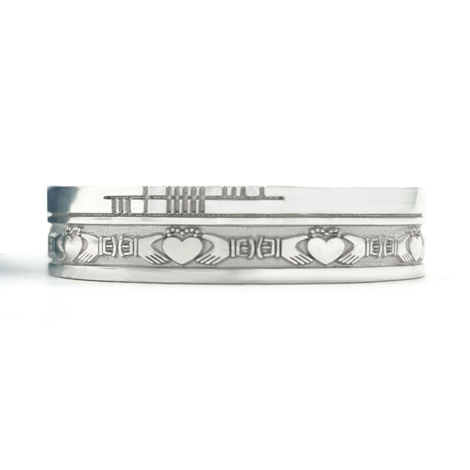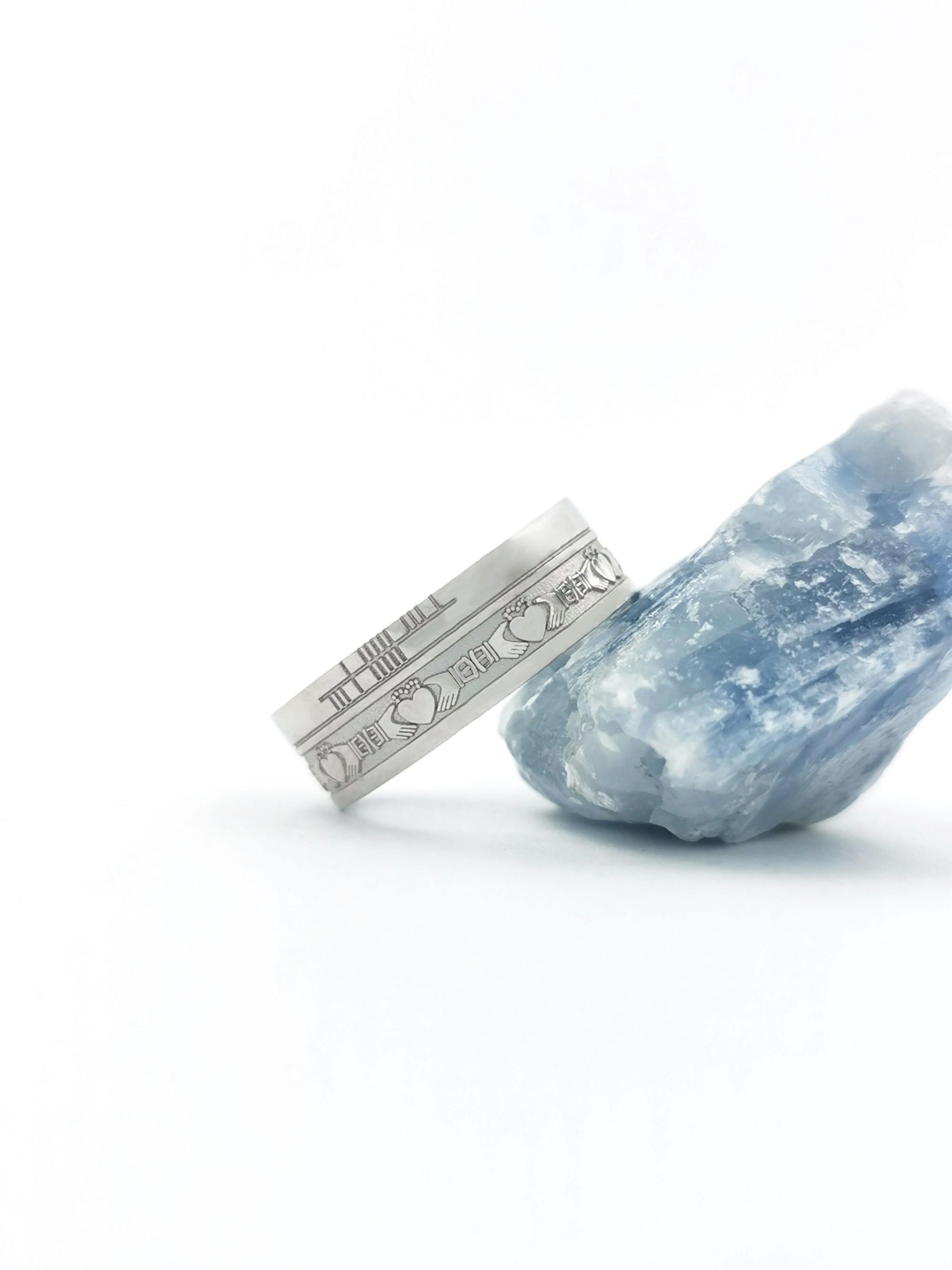 A heavyweight, comfort fit band featuring the traditional Irish Claddagh. A romantic symbol of love, loyalty and friendship, with roots that trace back to the wild atlantic coast, the Claddagh has been cherished and worn in Ireland for over 400 years.