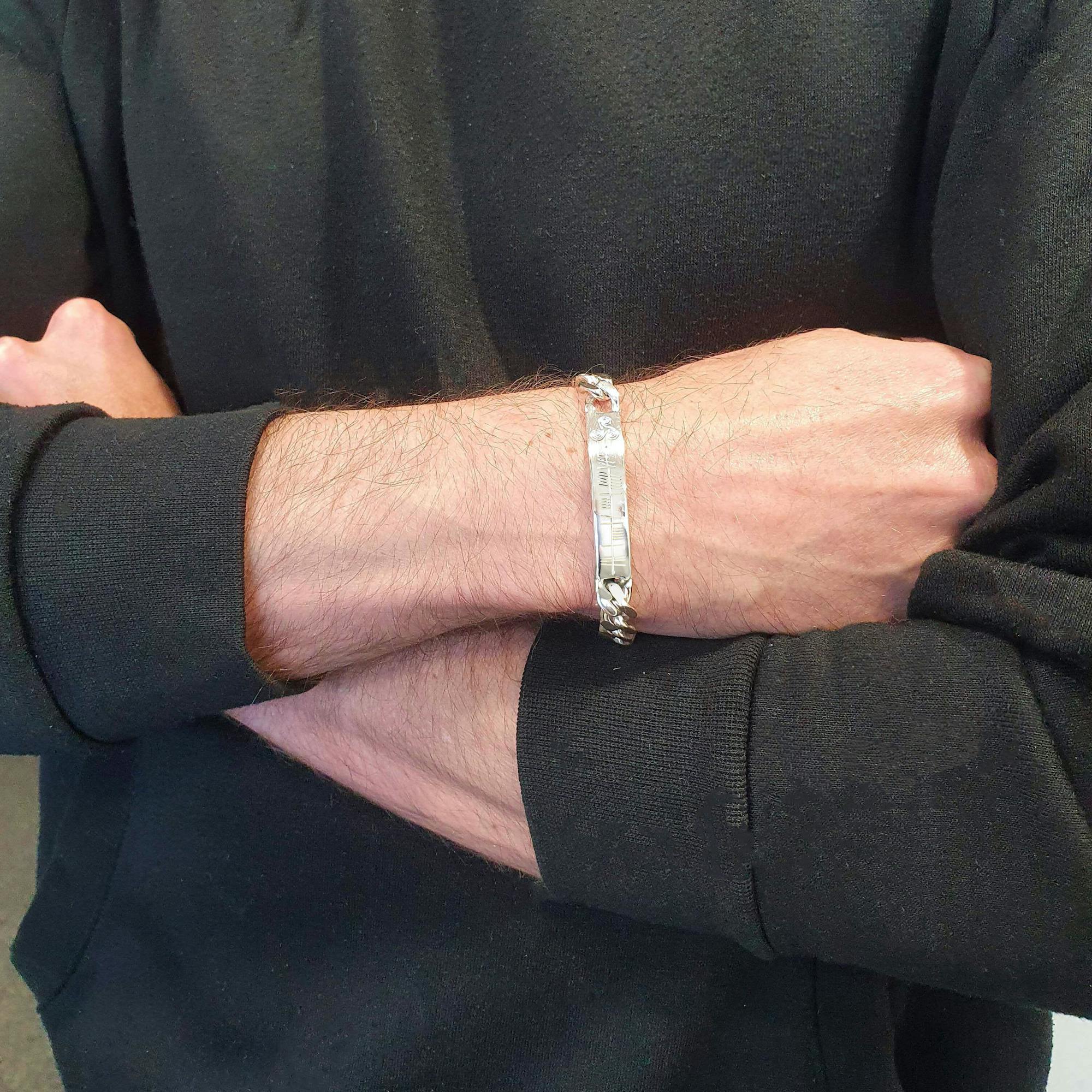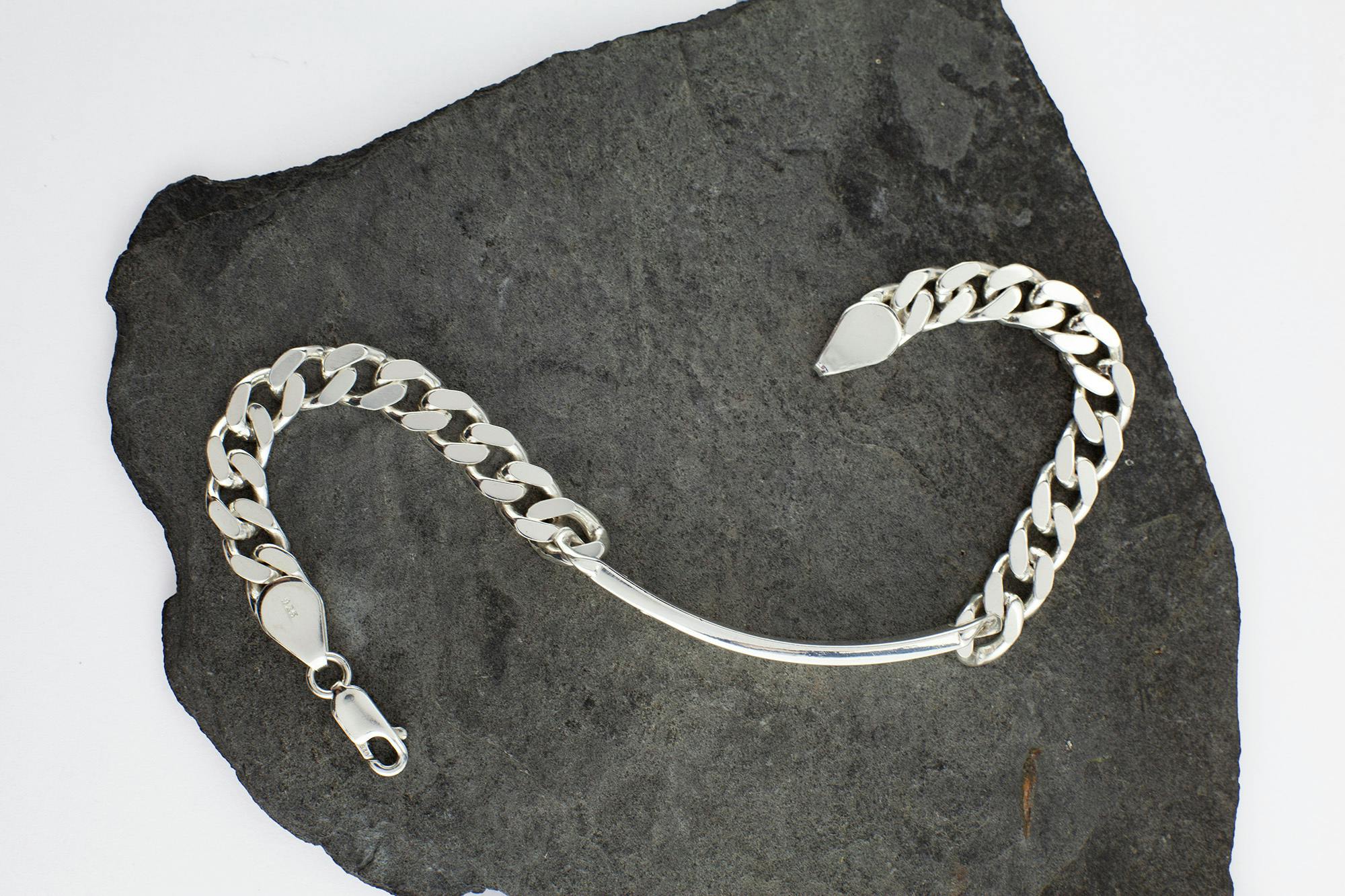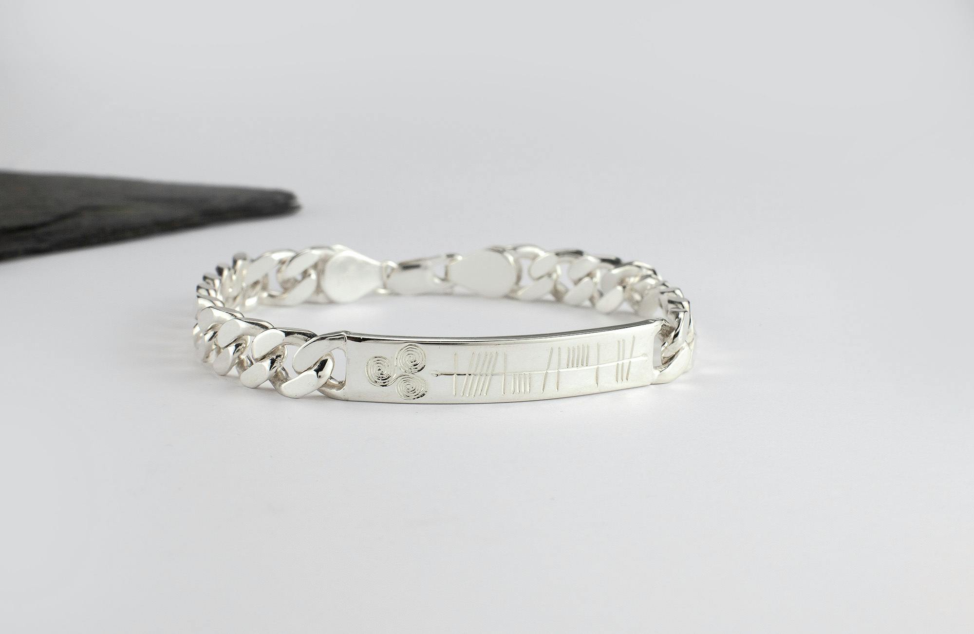 In keeping with Irish tradition we have added the famous NewGrange spiral. NewGrange is part of a UNESCO World Heritage Site over 5000 years old, located in Co. Meath. The links on the bracelet are flat with chamfered edges creating sharp sleek lines, ensuring the bracelet sit very comfortably on the wrist with a nice trigger clasp for security. This bracelet is custom made to order, incredibly unique and different, making for a strong conversation piece to remind you of your Irish heritage and culture.