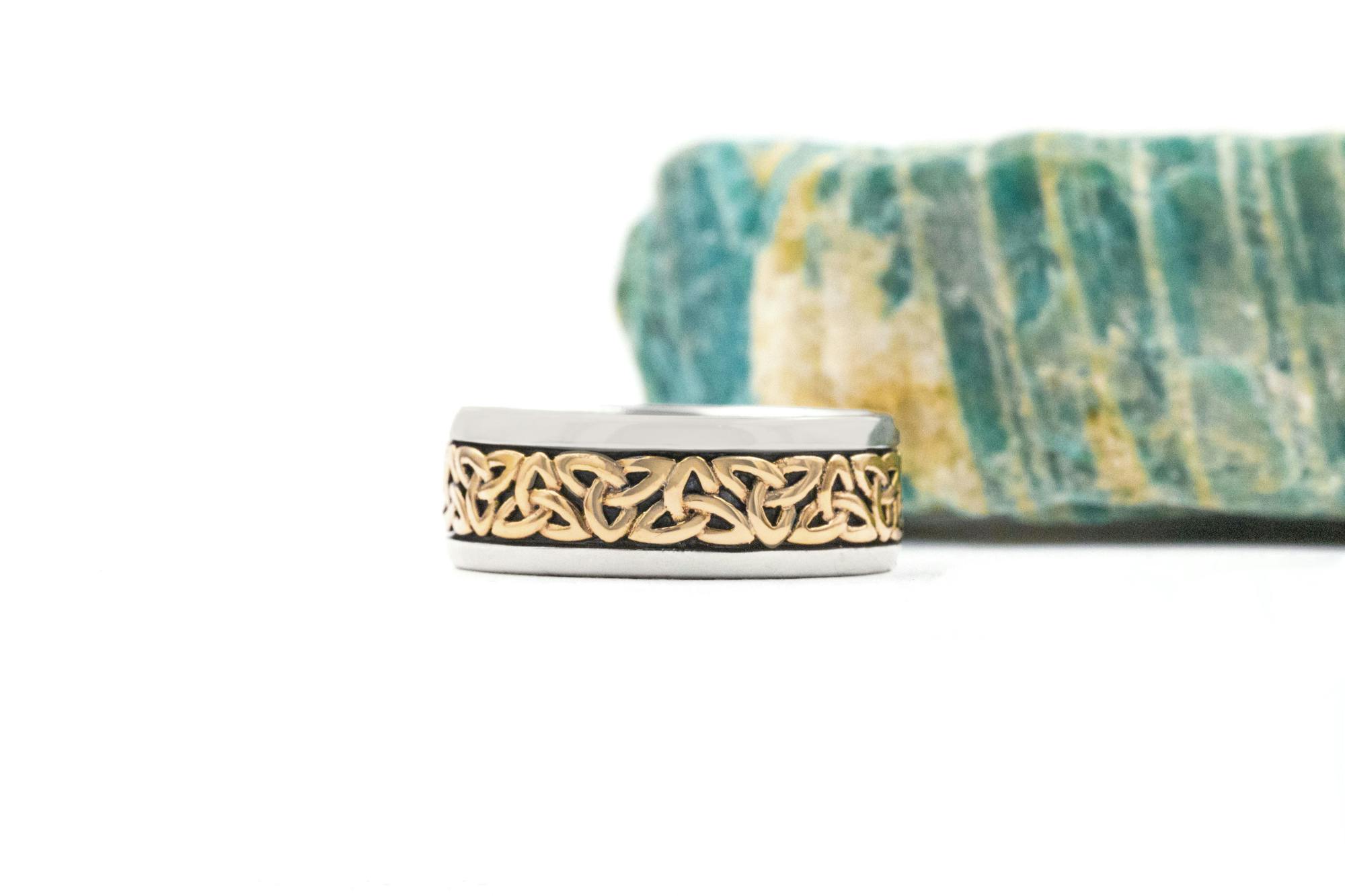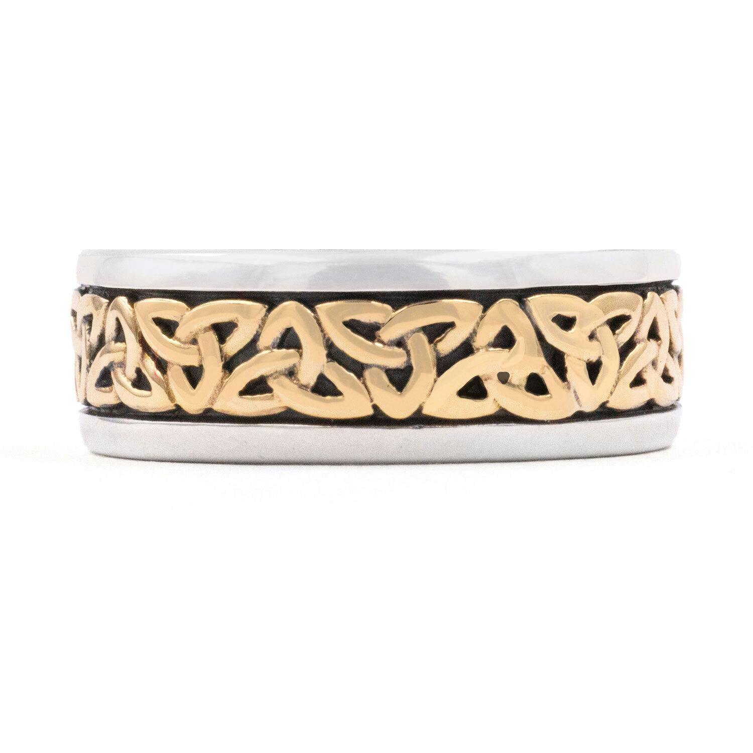 A comfortable and durable sterling silver band available in two widths. Eternal trinity knots stand proud against an oxidized background.