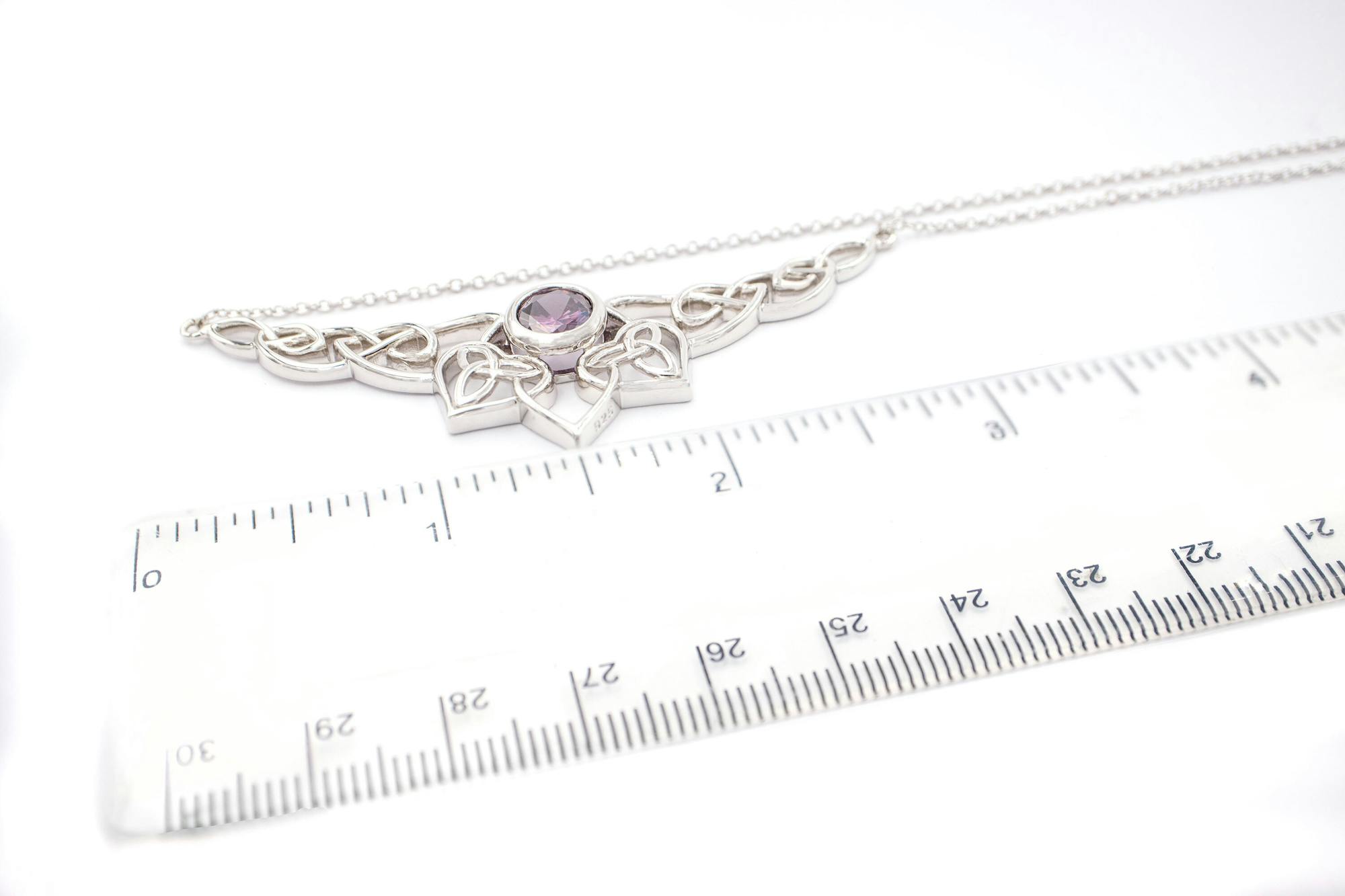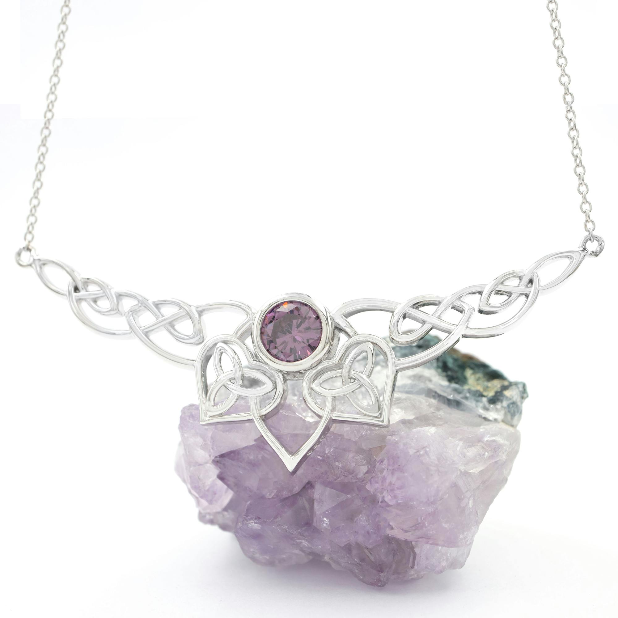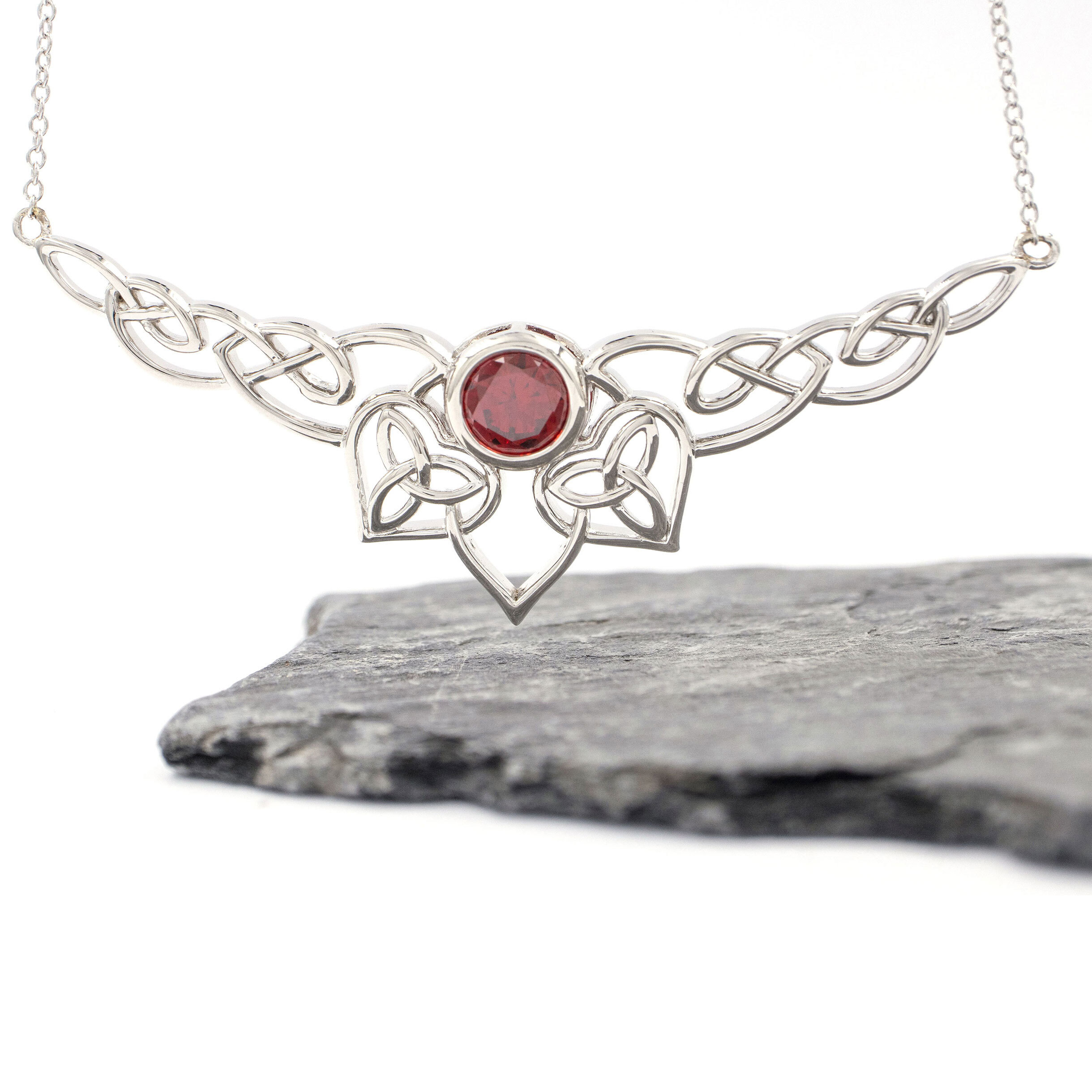 With an elegant form that speaks of the Celtic Torc treasures of ancient Ireland, the intertwined strands of fine sterling silver form an intricate interlace. This masterful Celtic knot-work incorporates two Trinity Knots in heart-shaped frames with a graceful central tapered tip that looks stunning on the neck. The Celtic interlace also encloses a sparkling, round cut, birthstone in a rub over setting, adding a touch of glamour to this striking piece.