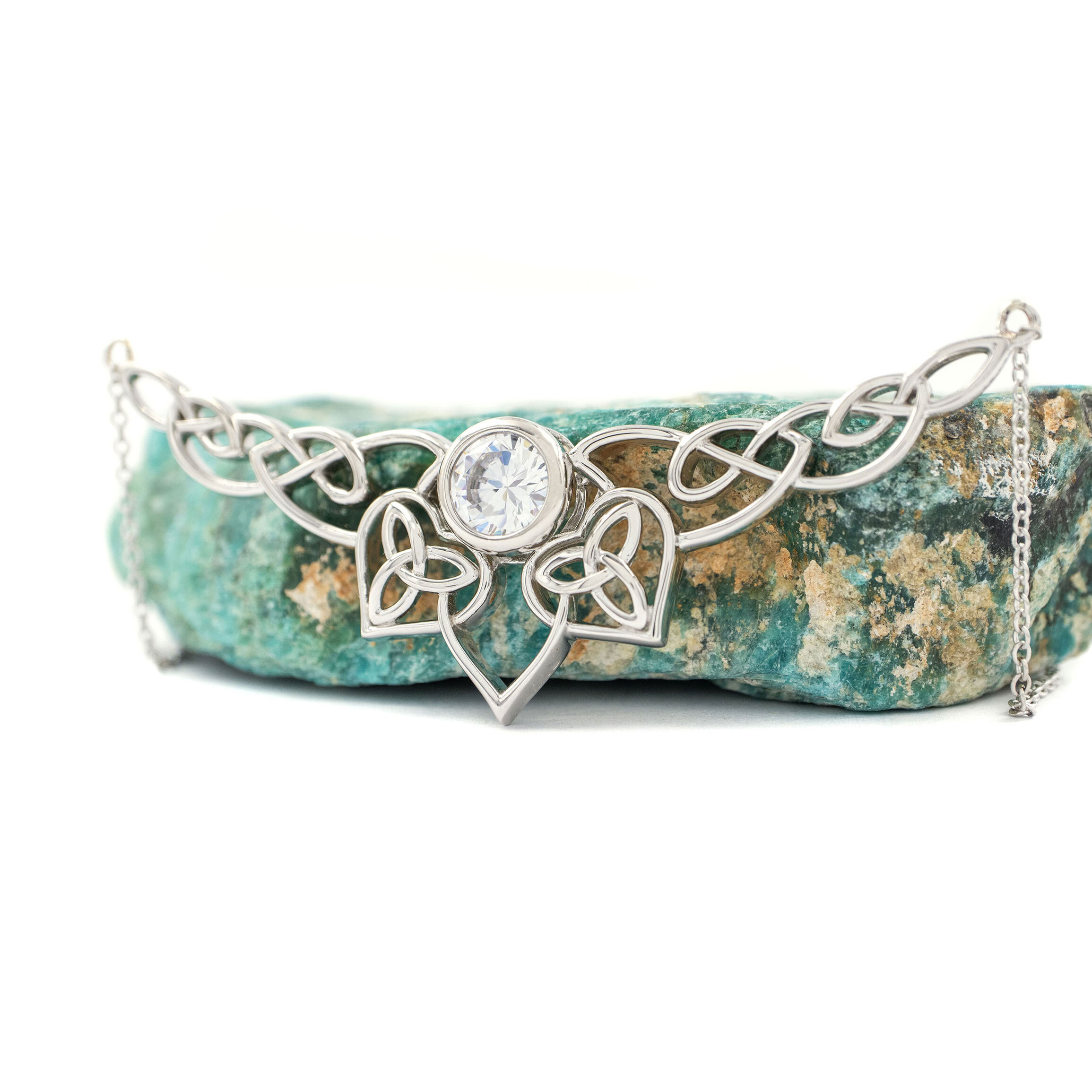 The necklet measures 2.8" wide and 0.9" high adding a touch of Celtic flair to any outfit. With an integrated 16 inch chain, it can be worn high and close to the collarbone or longer with an extender to 18" for a dramatic addition to the neckline.